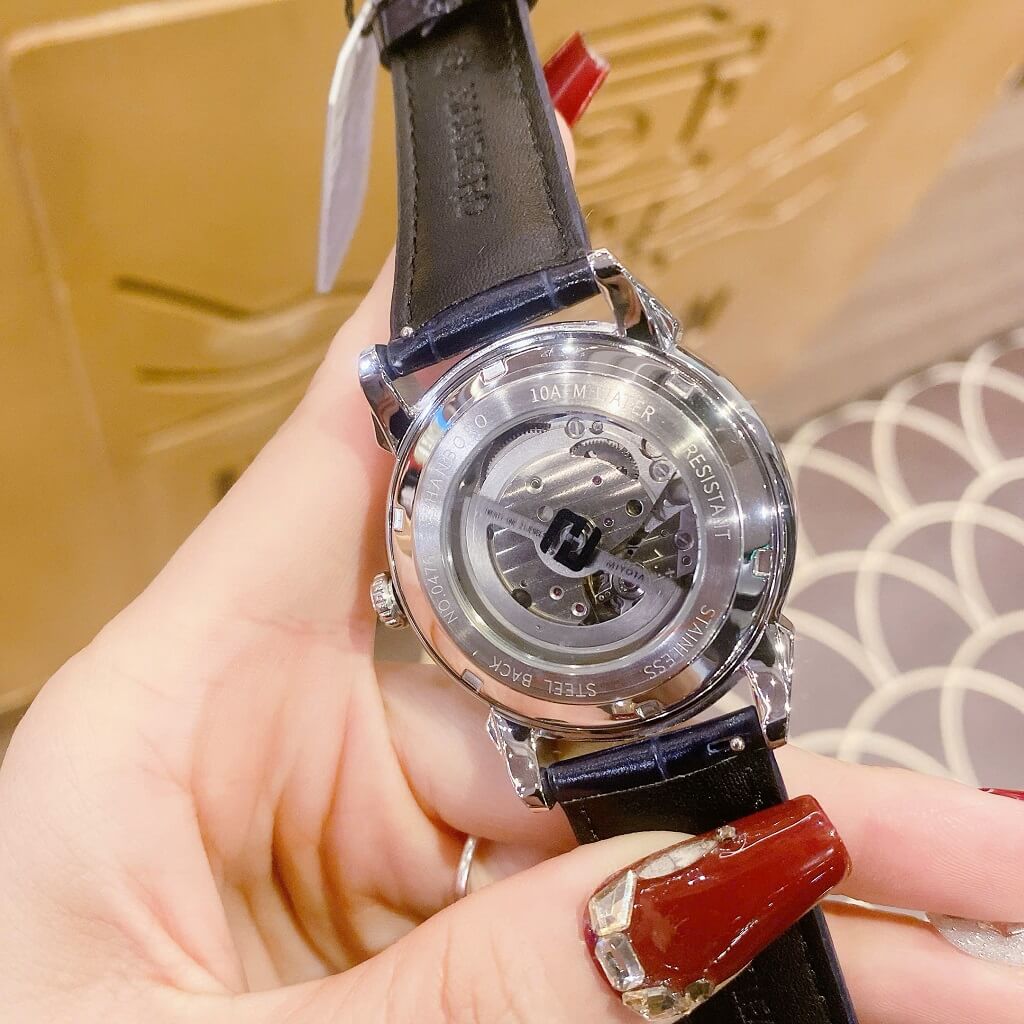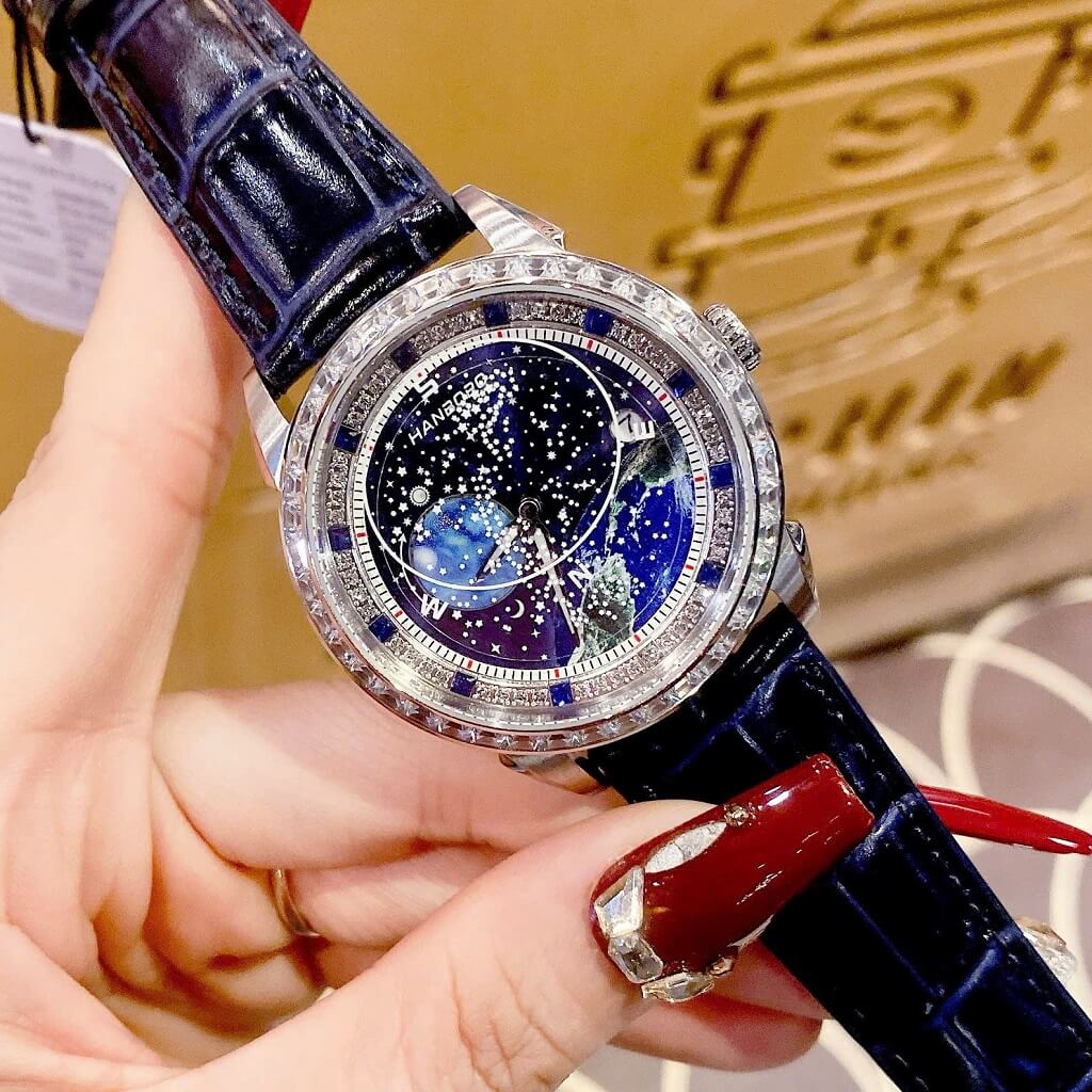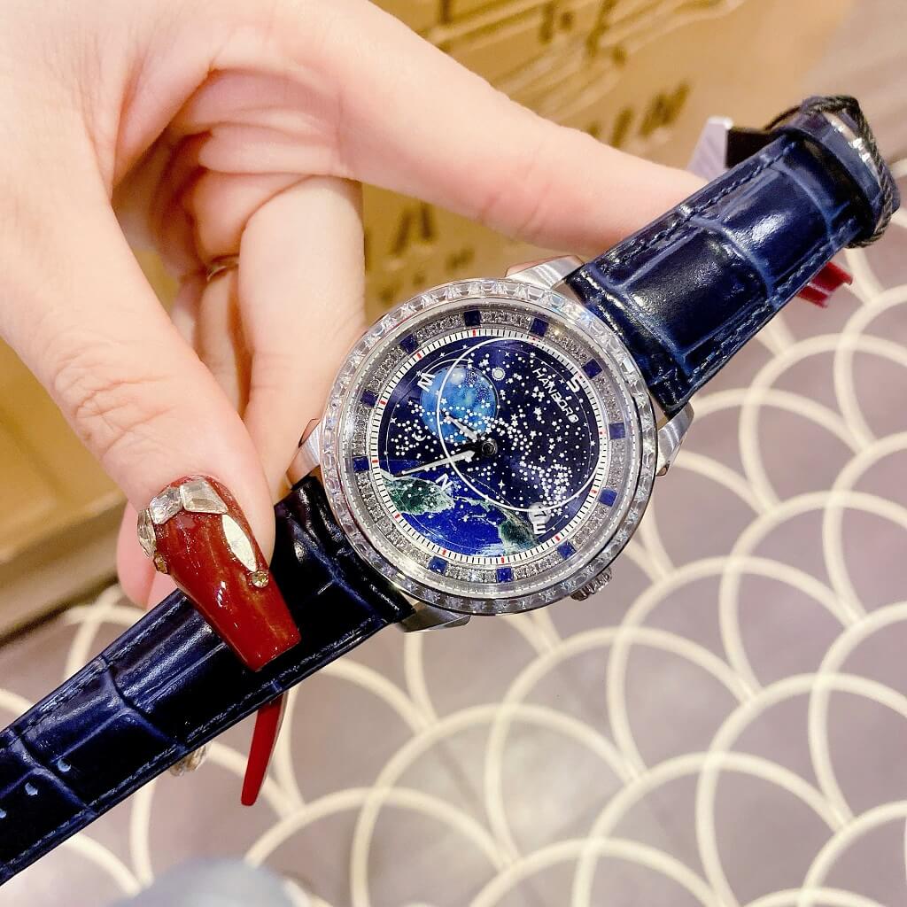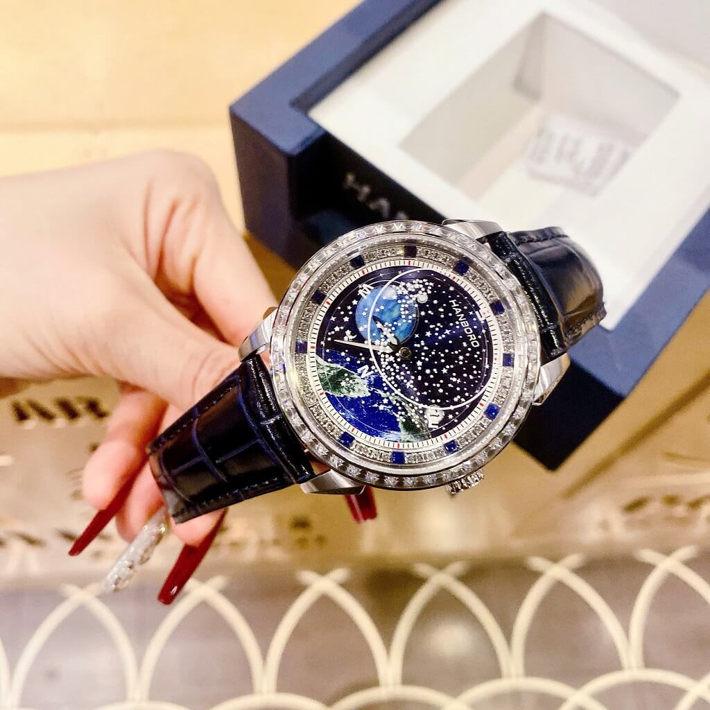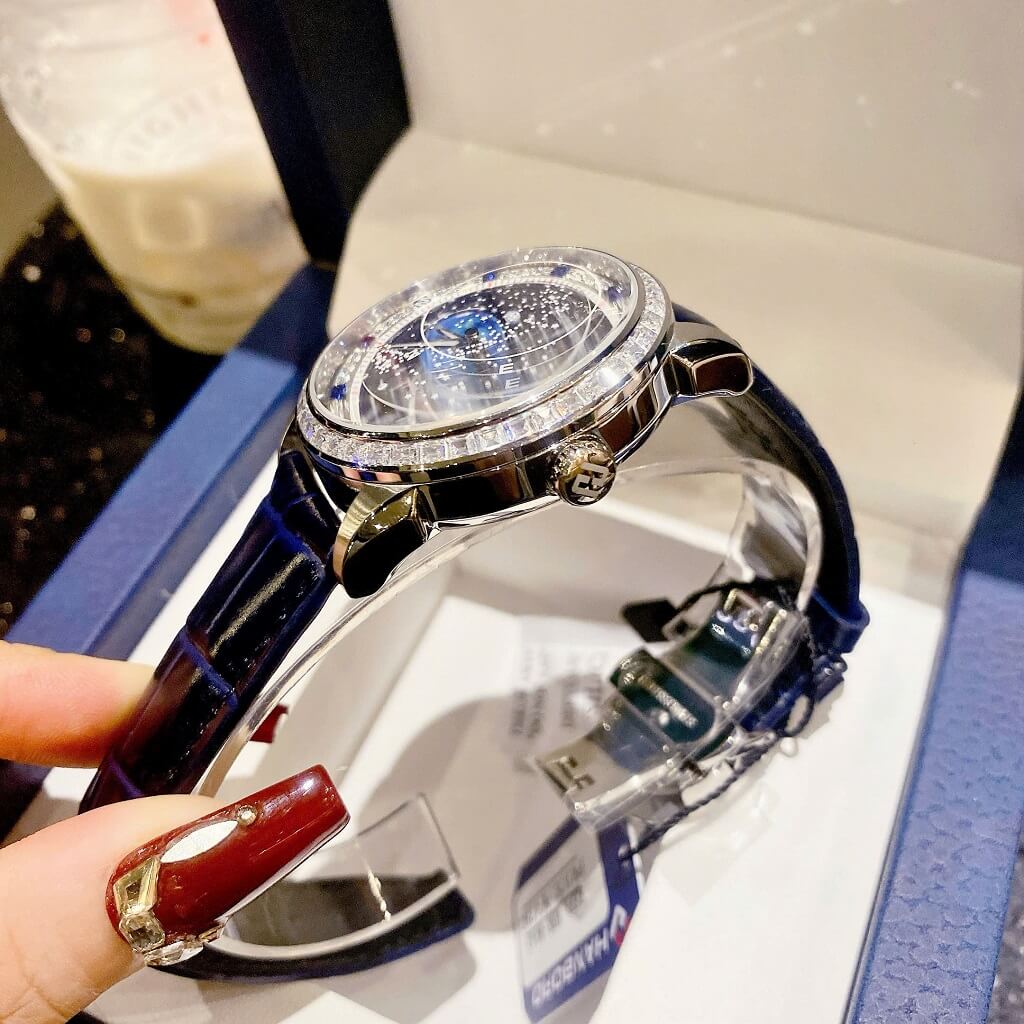 Đồng Hồ Nam Hanboro Bầu Trời Dây Da Xanh Vỏ Silver Đính Đá Size 42mm – Thanh Lịch & Đầy Phong Cách