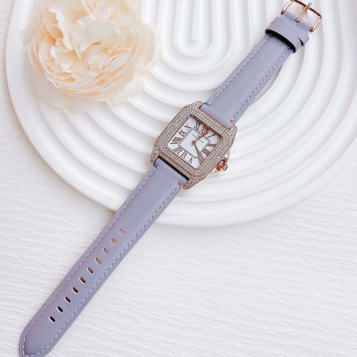 Vỏ đồng hồ được phủ lớp mạ vàng hồng thời thượng, đính đá tinh xảo xung quanh viền, tôn lên sự sang trọng và quý phái.