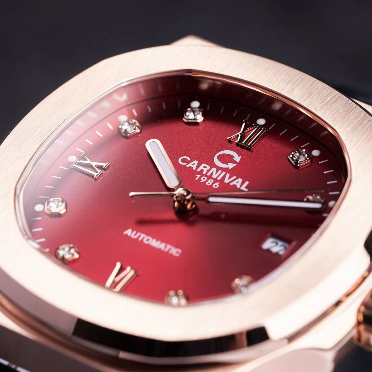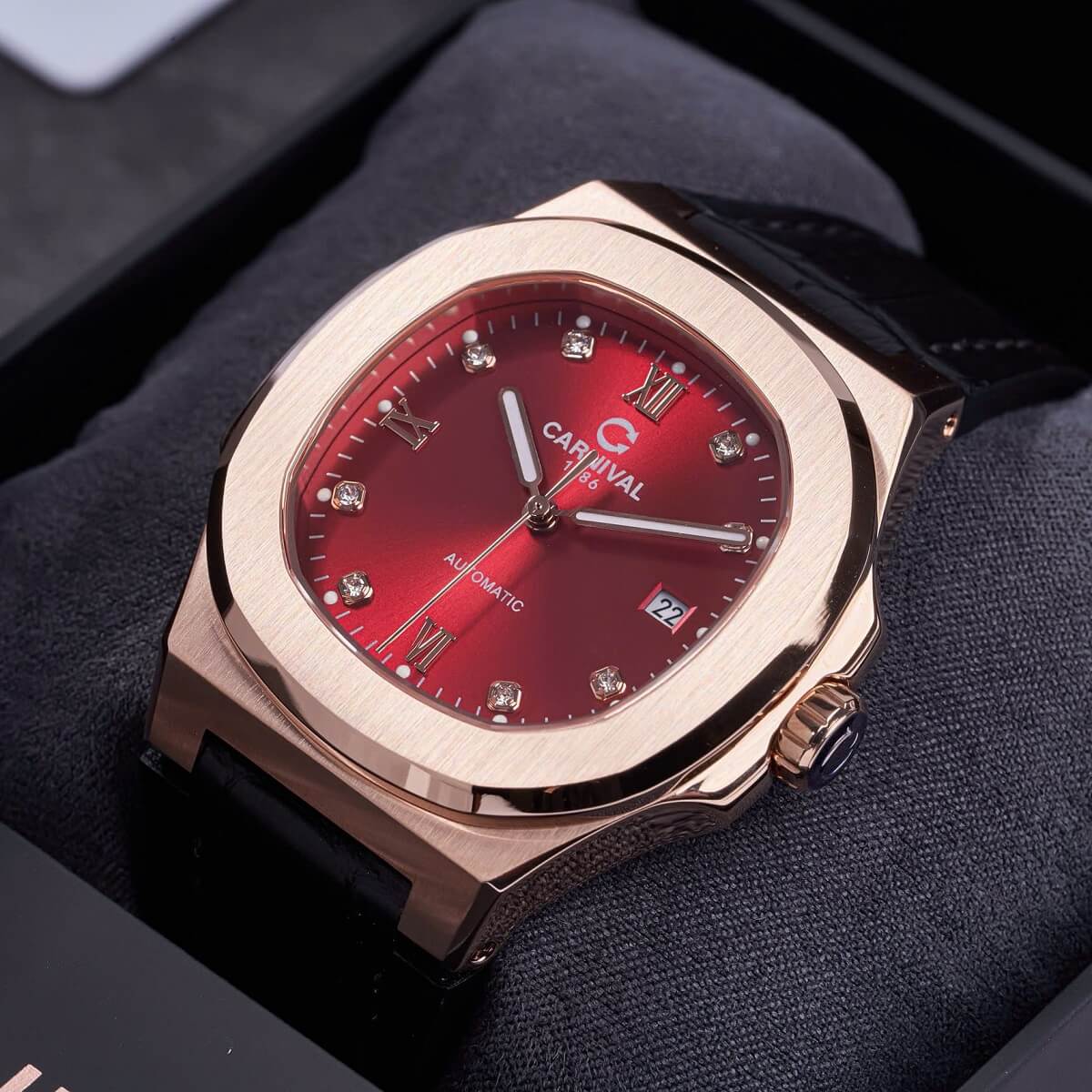 Tông màu đỏ burgundy trên mặt số không chỉ tạo sự khác biệt mà còn mang lại cảm giác mạnh mẽ, tự tin và đầy cuốn hút. Các chi tiết kim, cọc số và logo được thiết kế tinh xảo, kết hợp với vỏ thép mạ vàng hồng cao cấp giúp tổng thể trở nên sang trọng và đẳng cấp hơn bao giờ hết.