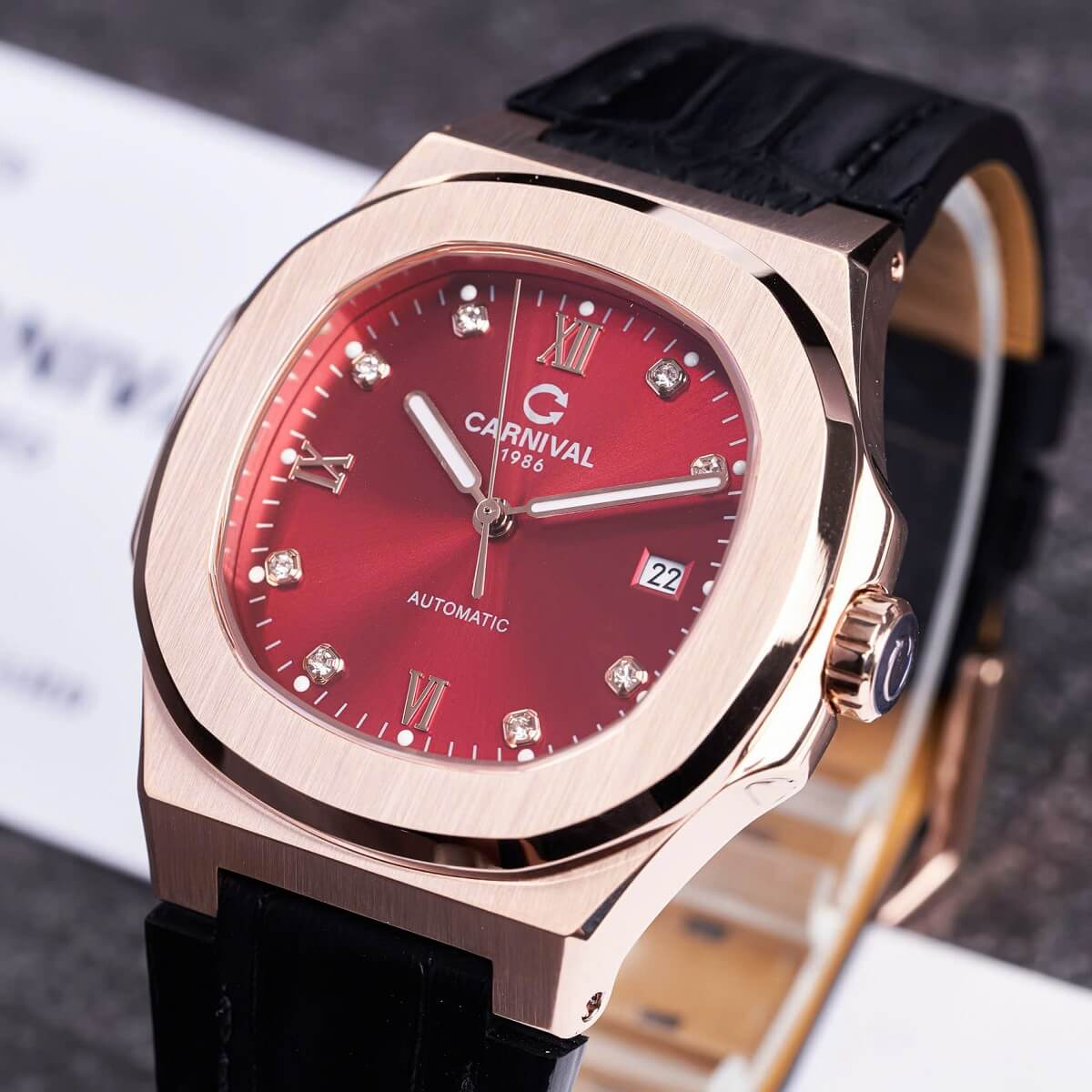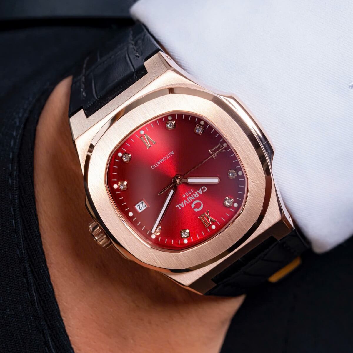Carnival 8160G dây da mặt đỏ size 41mm là mẫu đồng hồ cơ nam tự động sở hữu vẻ ngoài cuốn hút với sự kết hợp hoàn hảo giữa mặt đỏ nổi bật, vỏ vàng hồng sang trọng và dây da đen cổ điển. Đây là lựa chọn lý tưởng cho quý ông hiện đại, yêu thích sự lịch lãm, nam tính và giá trị bền vững của những chiếc đồng hồ cơ khí.