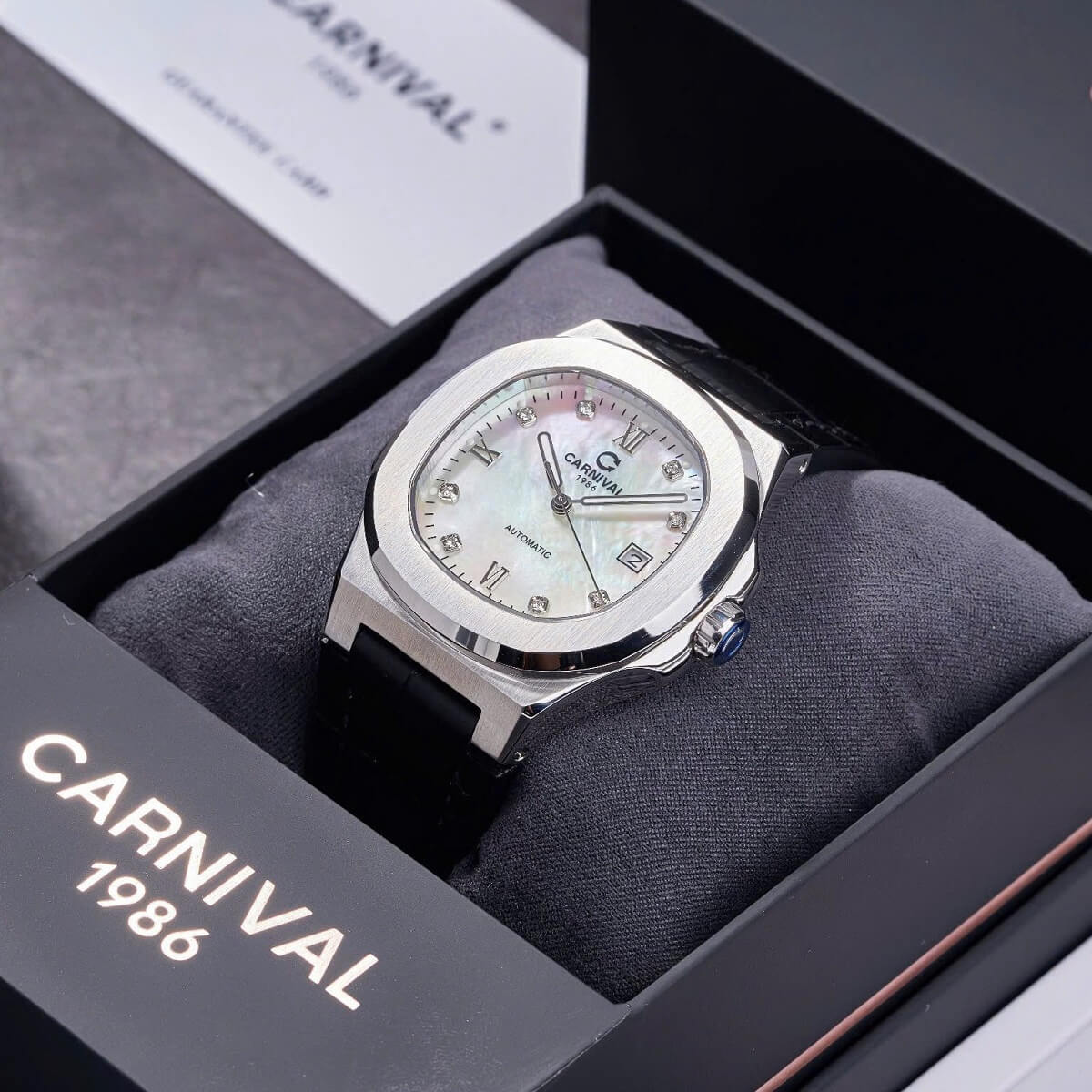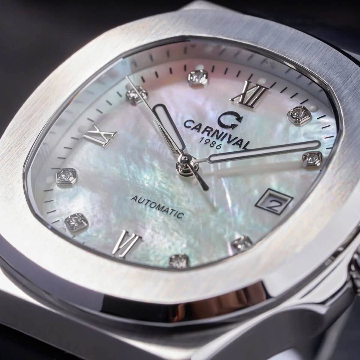 Carnival 8160G mang kiểu dáng dress watch chuẩn mực với mặt trắng thanh thoát, dễ phối đồ. Ánh xà cừ tạo chiều sâu sang trọng mà không phô trương.