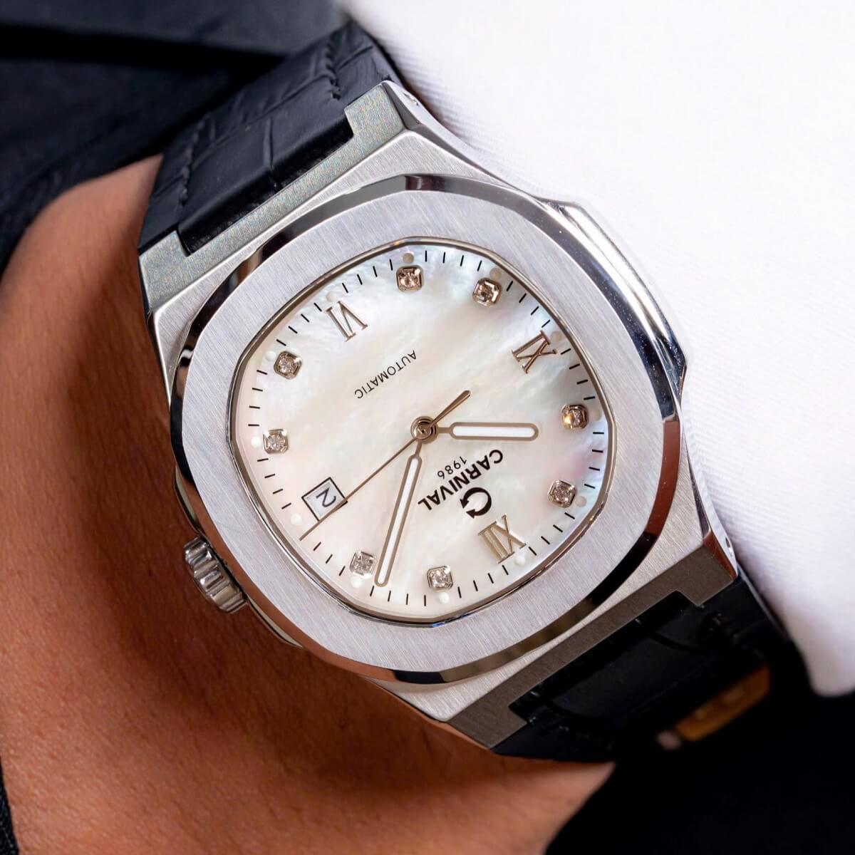 Carnival 8160G Tự Động Mặt Trắng Xà Cừ Dây Da Đen Vỏ Bạc 41mm là mẫu đồng hồ lý tưởng dành cho quý ông yêu thích phong cách đơn giản nhưng tinh tế. Với mặt số trắng xà cừ ánh nhẹ, dây da đen cổ điển và vỏ bạc sang trọng, mẫu đồng hồ này phù hợp cả đi làm, gặp gỡ đối tác hay dự sự kiện quan trọng.