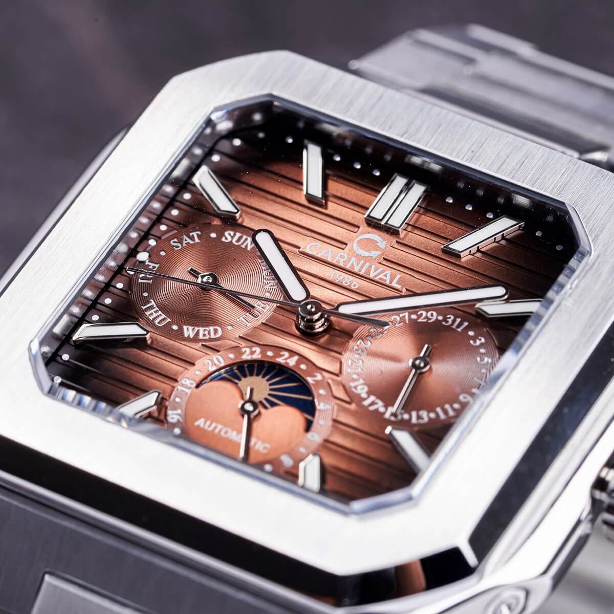 Carnival 8187G sở hữu mặt đồng hồ tròn với màu nâu cà phê nam tính, kết hợp dây kim loại silver sáng bóng, tạo nên tổng thể hài hòa, lịch lãm. Thiết kế 6 kim giúp hiển thị đa chức năng, từ giờ – phút – giây đến lịch ngày, thứ và 24 giờ.