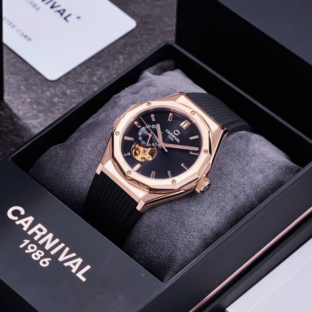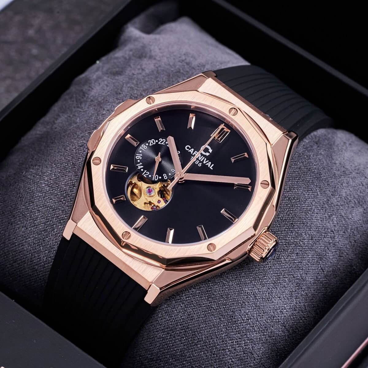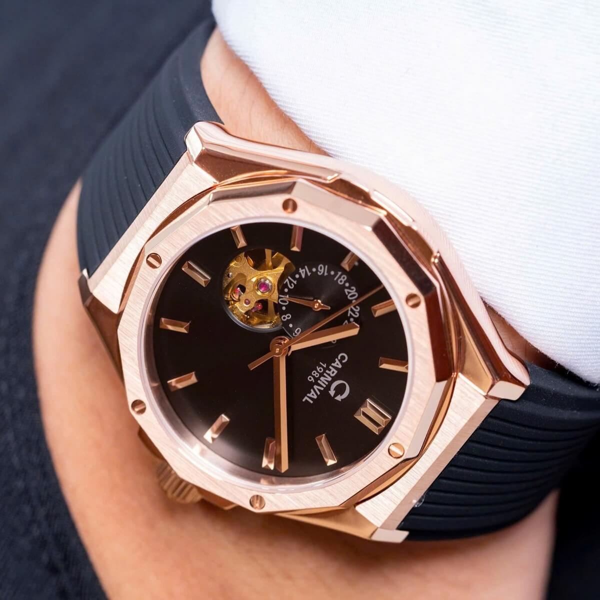 Carnival 8189G Tự Động Mặt Đen Dây Cao Su Đen Vàng Hồng 42mm là sự kết hợp hoàn hảo giữa công nghệ chế tác đồng hồ hiện đại và thiết kế thời trang đẳng cấp. Với tone màu đen – vàng hồng sang trọng, mặt số mạnh mẽ và dây cao su thể thao, mẫu đồng hồ này chinh phục mọi phong cách từ công sở đến dạo phố.
