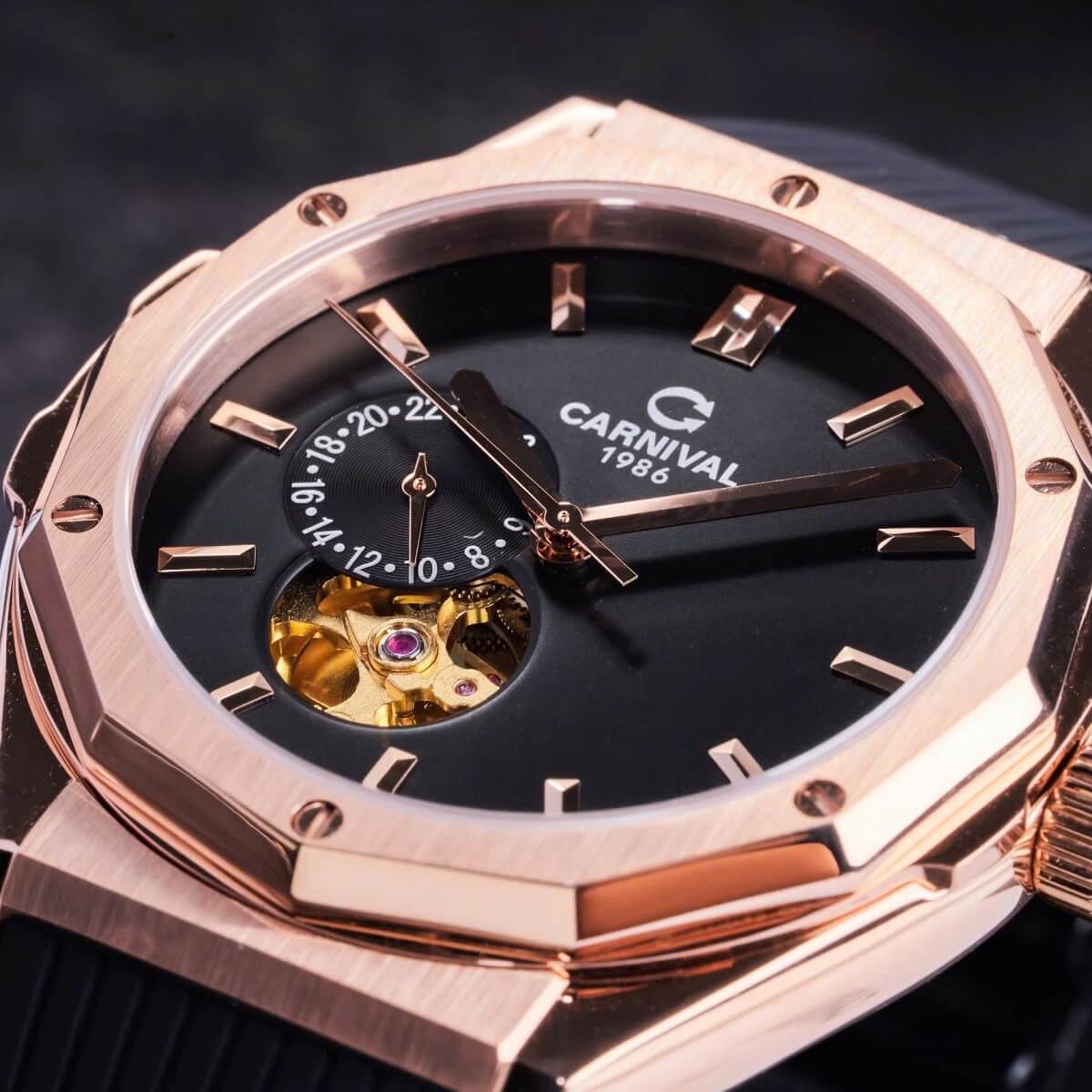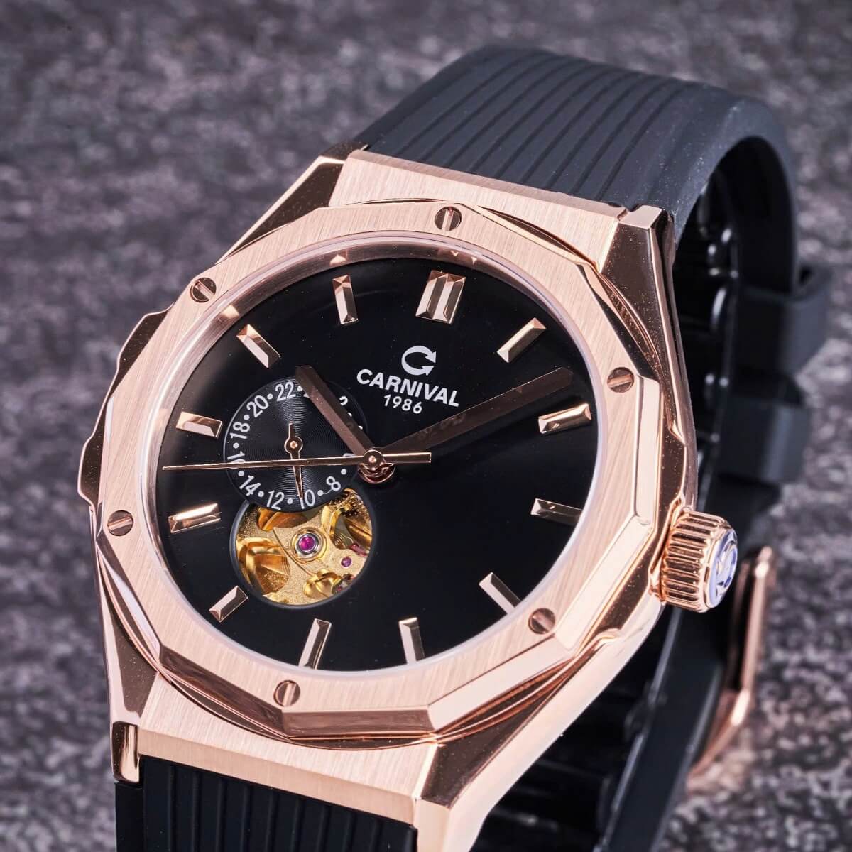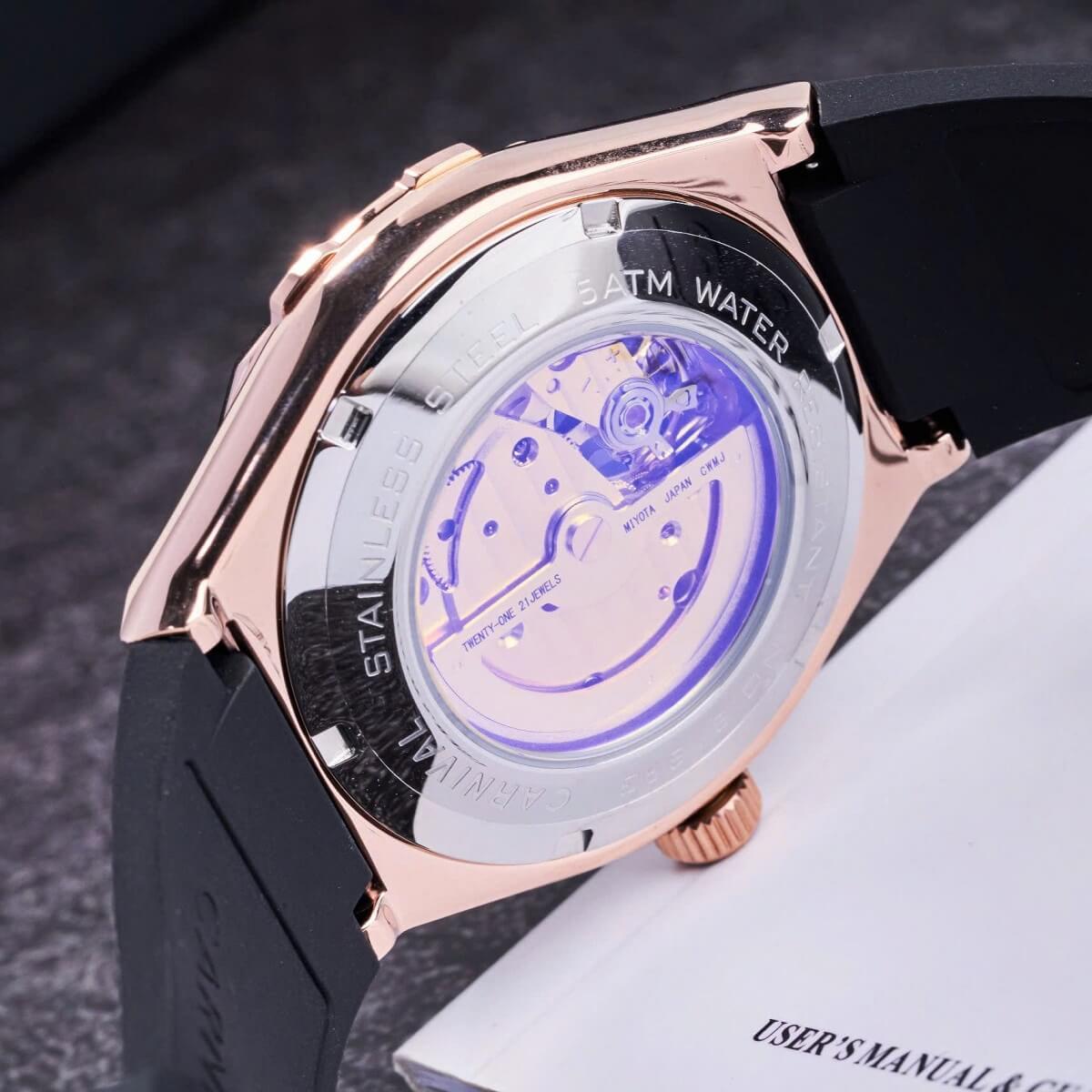 Carnival 8189G Tự Động Mặt Đen Dây Cao Su Đen Vàng Hồng 42mm là sự kết hợp hoàn hảo giữa công nghệ chế tác đồng hồ hiện đại và thiết kế thời trang đẳng cấp. Với tone màu đen – vàng hồng sang trọng, mặt số mạnh mẽ và dây cao su thể thao, mẫu đồng hồ này chinh phục mọi phong cách từ công sở đến dạo phố.