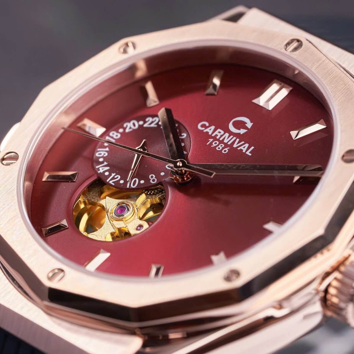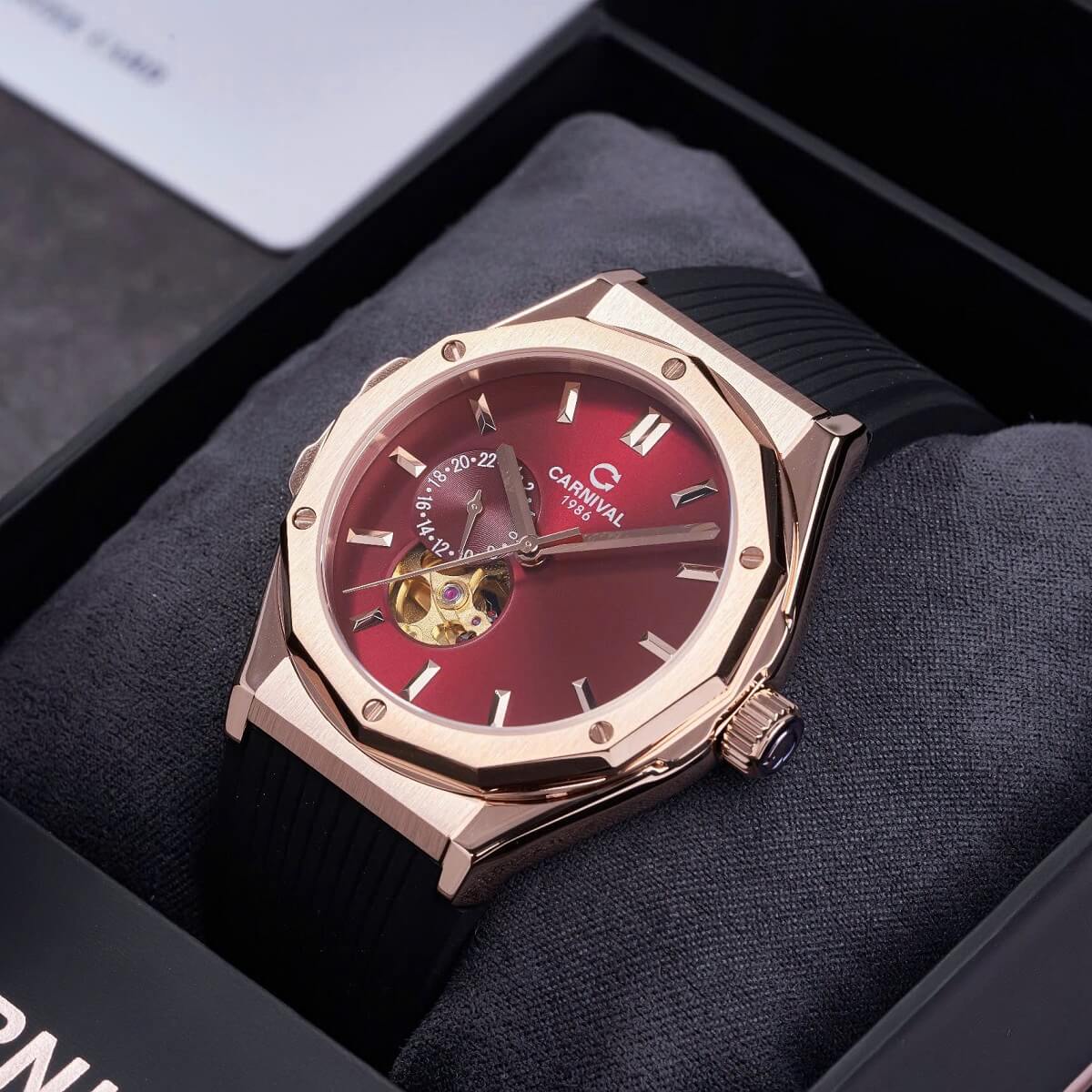 Carnival 8189G phiên bản mặt đỏ kết hợp dây cao su đen và viền vàng hồng chính là lựa chọn lý tưởng cho những quý ông yêu thích sự mạnh mẽ, nổi bật và khác biệt.