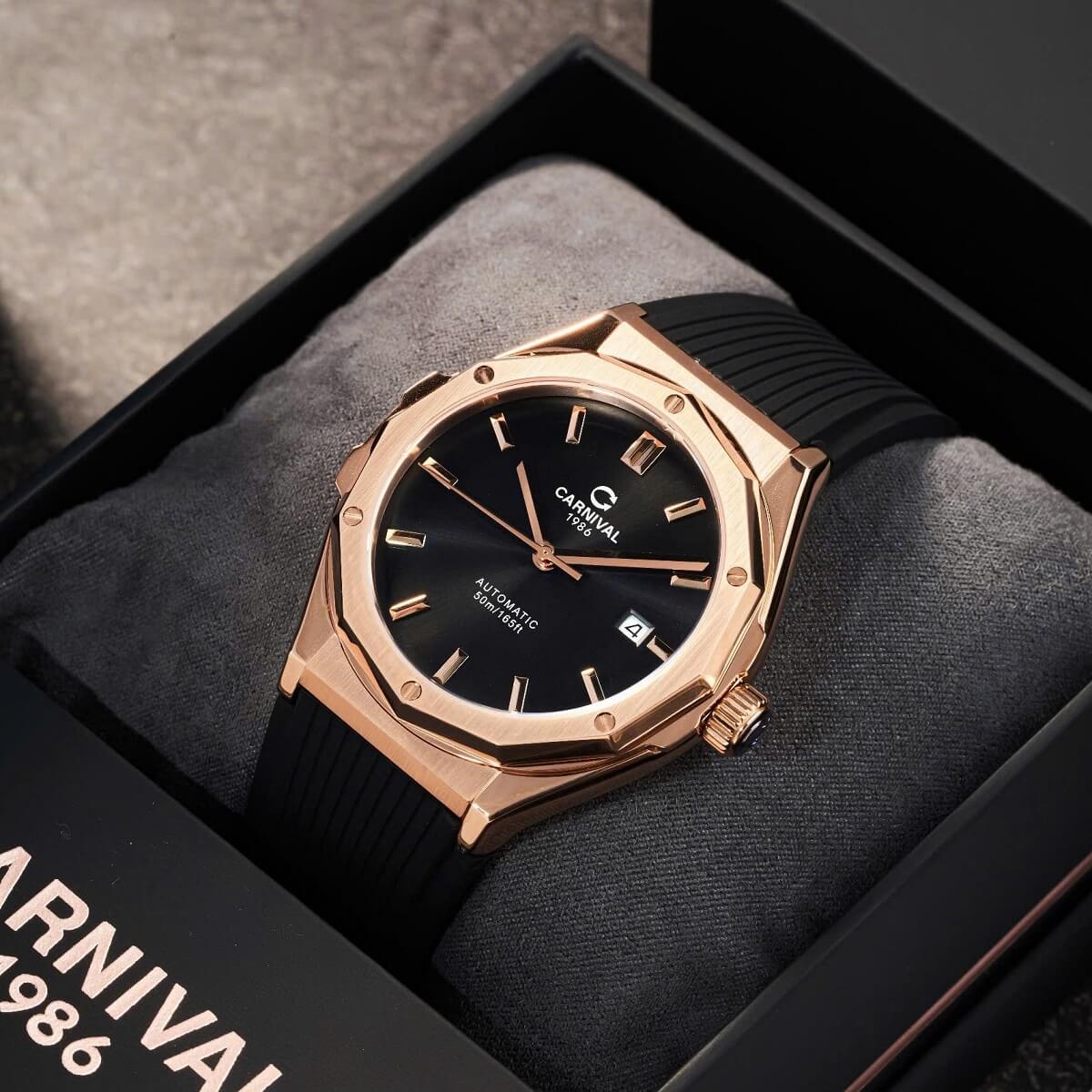 Carnival 8168G Tự Động Mặt Đen Dây Cao Su Đen Vỏ Vàng Hồng 42mm là mẫu đồng hồ cao cấp dành cho nam giới yêu thích sự mạnh mẽ, nam tính nhưng không kém phần tinh tế. Với thiết kế hiện đại, gam màu tương phản đen – vàng hồng cuốn hút, sản phẩm nhanh chóng trở thành lựa chọn hàng đầu cho doanh nhân, dân văn phòng, người yêu đồng hồ cơ.