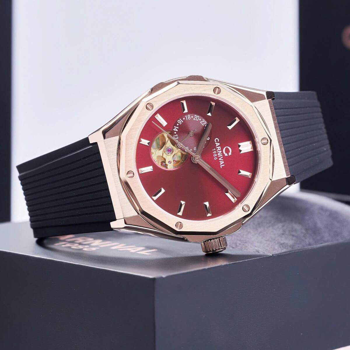 Carnival 8189G phiên bản mặt đỏ kết hợp dây cao su đen và viền vàng hồng chính là lựa chọn lý tưởng cho những quý ông yêu thích sự mạnh mẽ, nổi bật và khác biệt.
