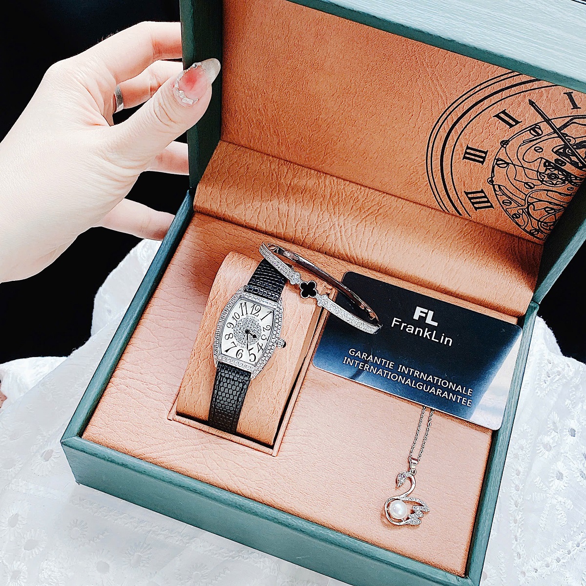 Hình ảnh thực tế Đồng Hồ Nữ Franklin FL8888 Mặt Ovan Đính Đá Dây Da Đen Silver Size 31mm