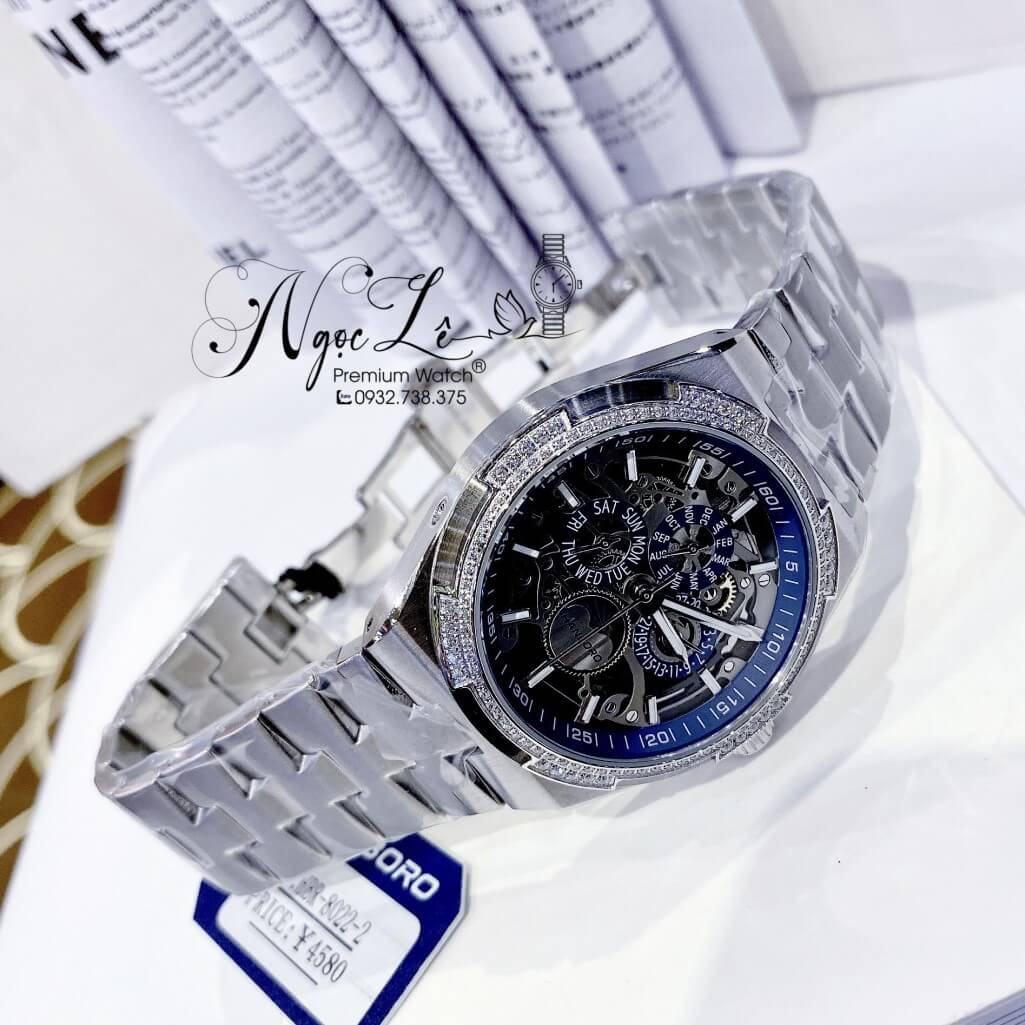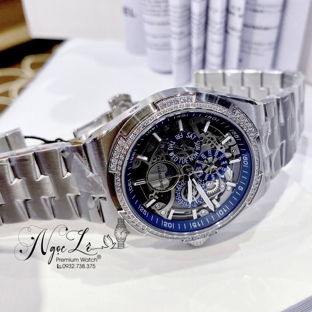 Đồng hồ nam hoạt động full chức năng, bao gồm lịch thứ, ngày, tháng và lịch trăng sao, máy cơ Automatic lộ máy trước sau
