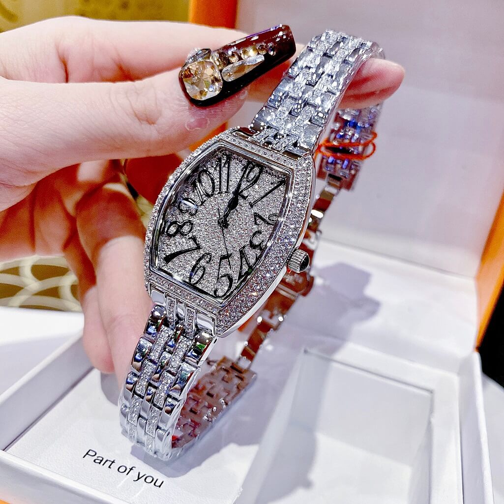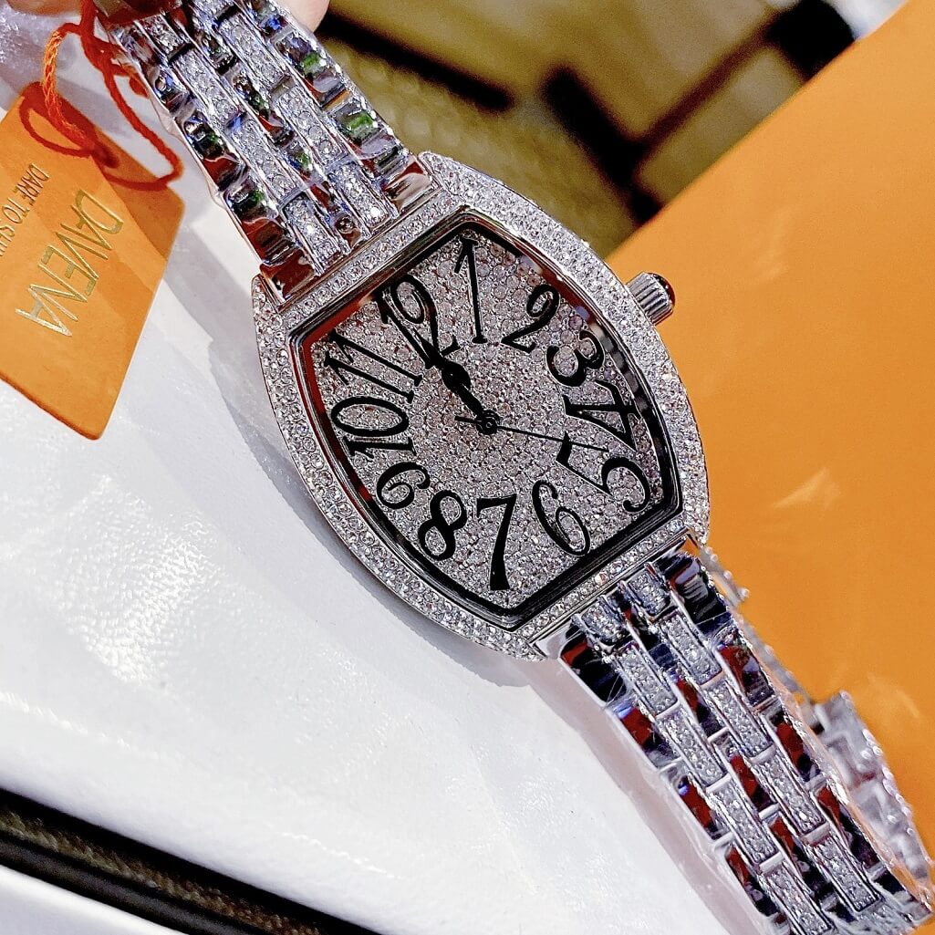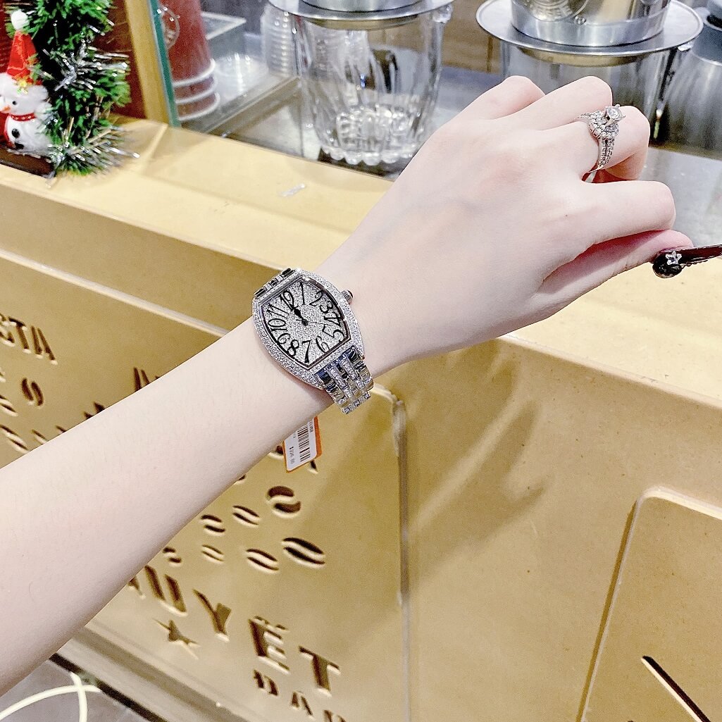 Dây và mặt được đính đá Swarovski, kiểu dáng đồng hồ Franck Muller
