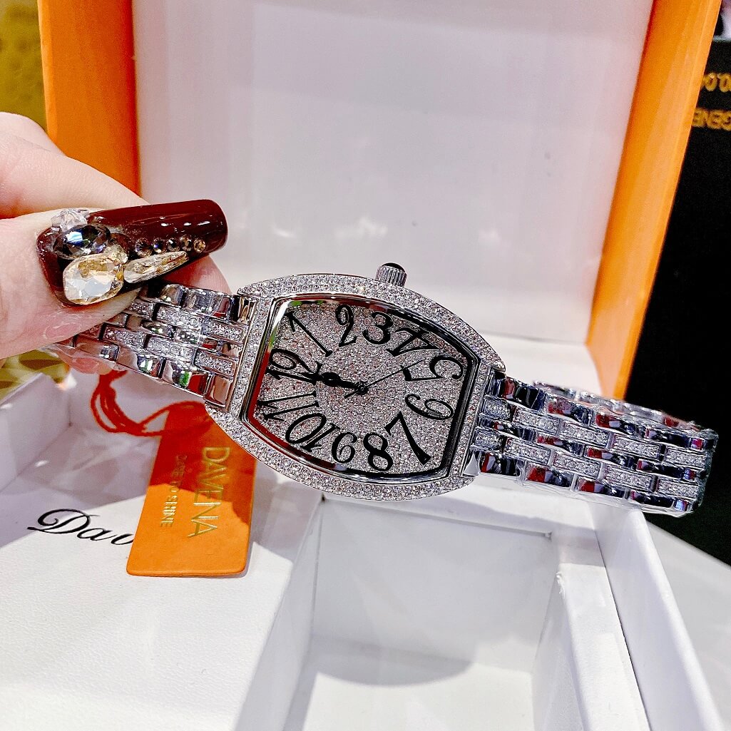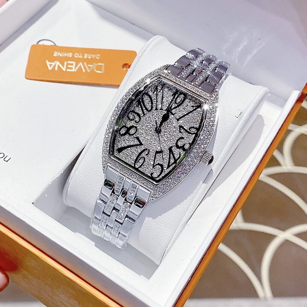 Hình ảnh đồng hồ Davena nữ chính hãng, đồng hồ mặt hình chữ nhật đính đá màu bạc sang trọng dành cho nữ, kiểu dáng đồng hồ Franck Muller