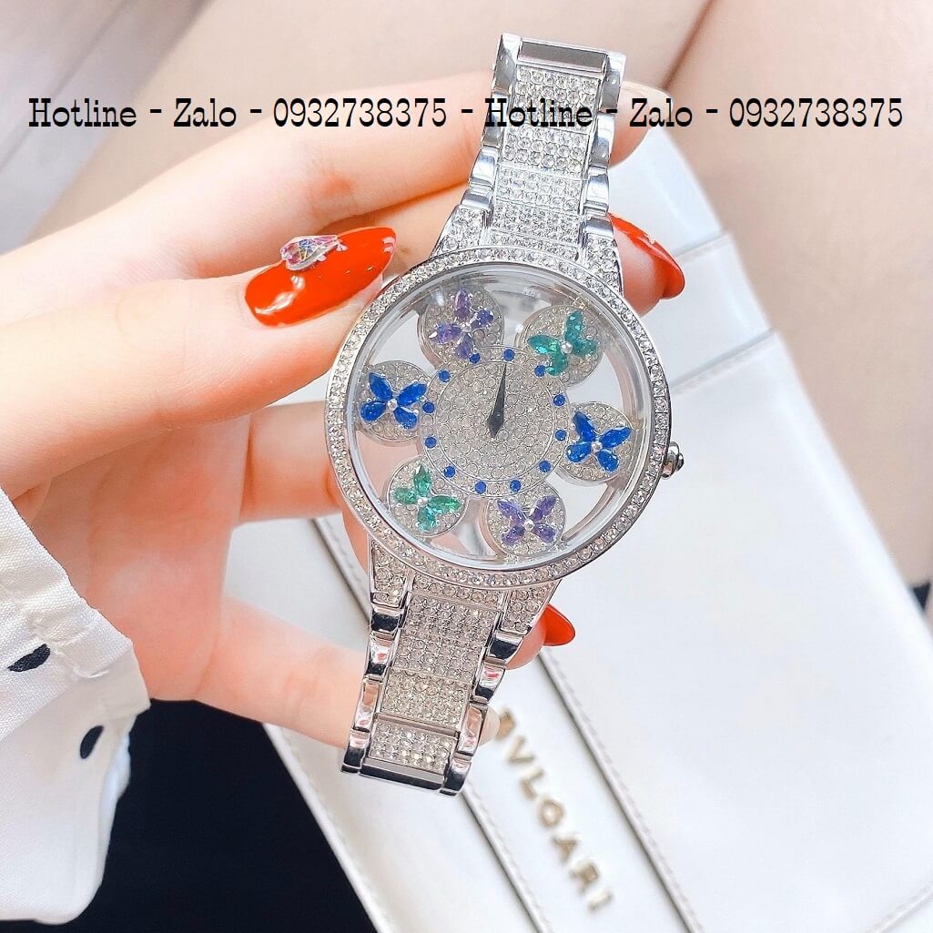 Hình ảnh đồng hồ Davena nữ chính hãng, đồng hồ mặt tròn đính đá sang trọng dành cho nữ, mặt đính đá màu hình bướm xoay nổi bật
