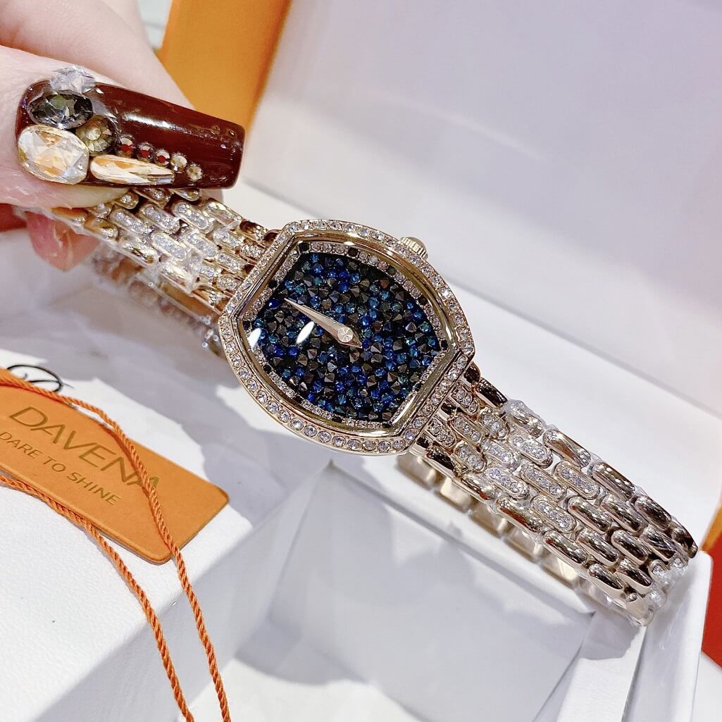 Hình ảnh đồng hồ Davena nữ chính hãng, đồng hồ Davena màu vàng hồng mặt nhũ xanh đính đá lấp lánh