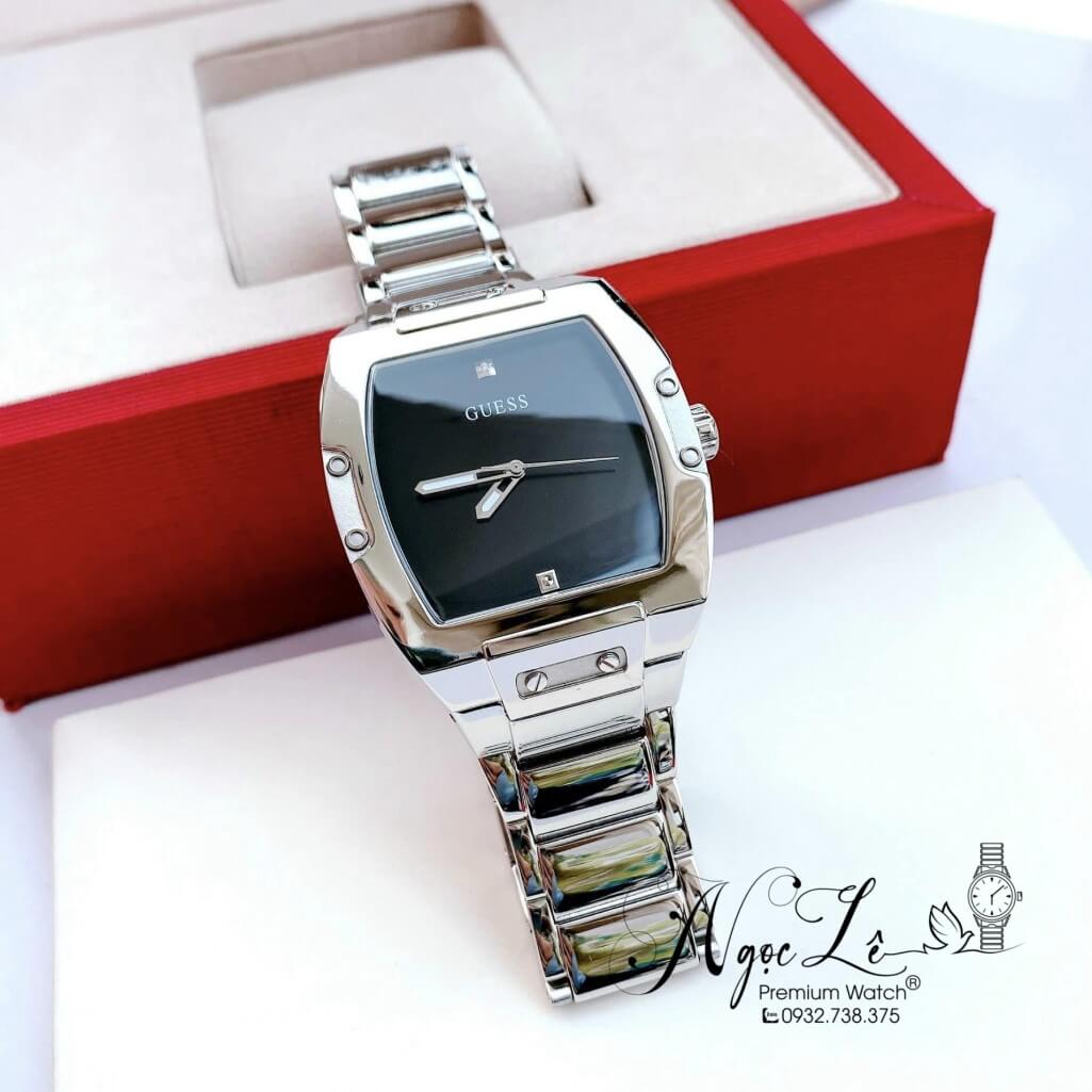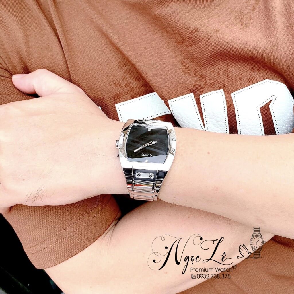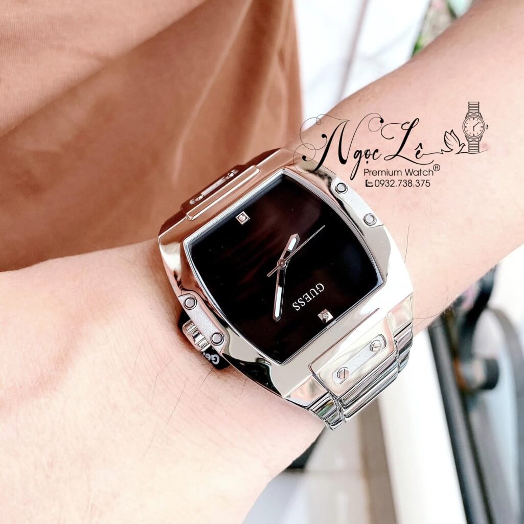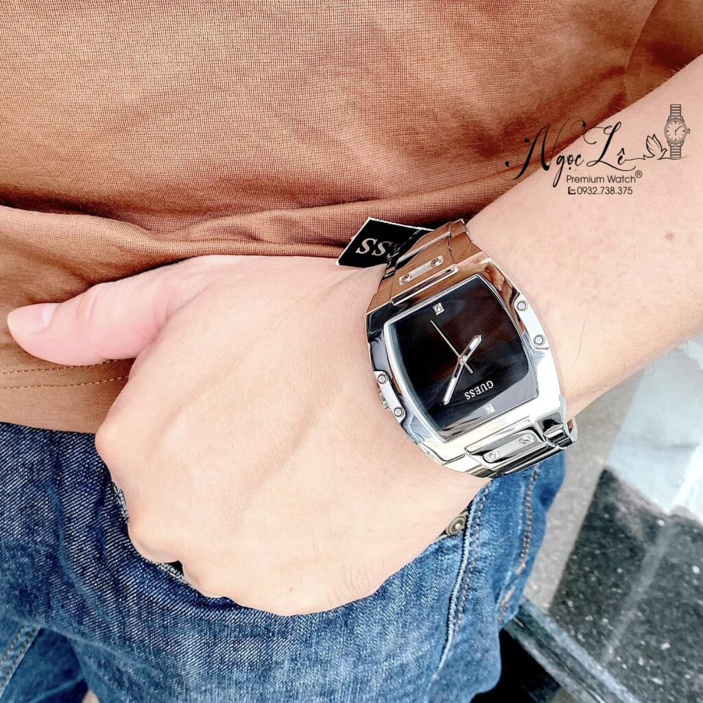 - Guess dáng vuông dành cho nam, màu bạc basic không kén tay, đồng hồ Guess sở hữu bộ máy Pin Nhật siêu bền