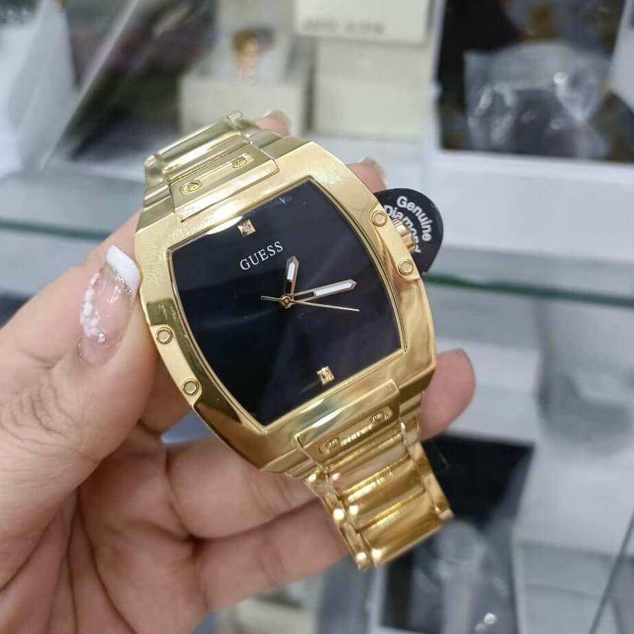 - Guess dáng vuông dành cho nam, màu vàng không kén tay, đồng hồ Guess sở hữu bộ máy Pin Nhật siêu bền