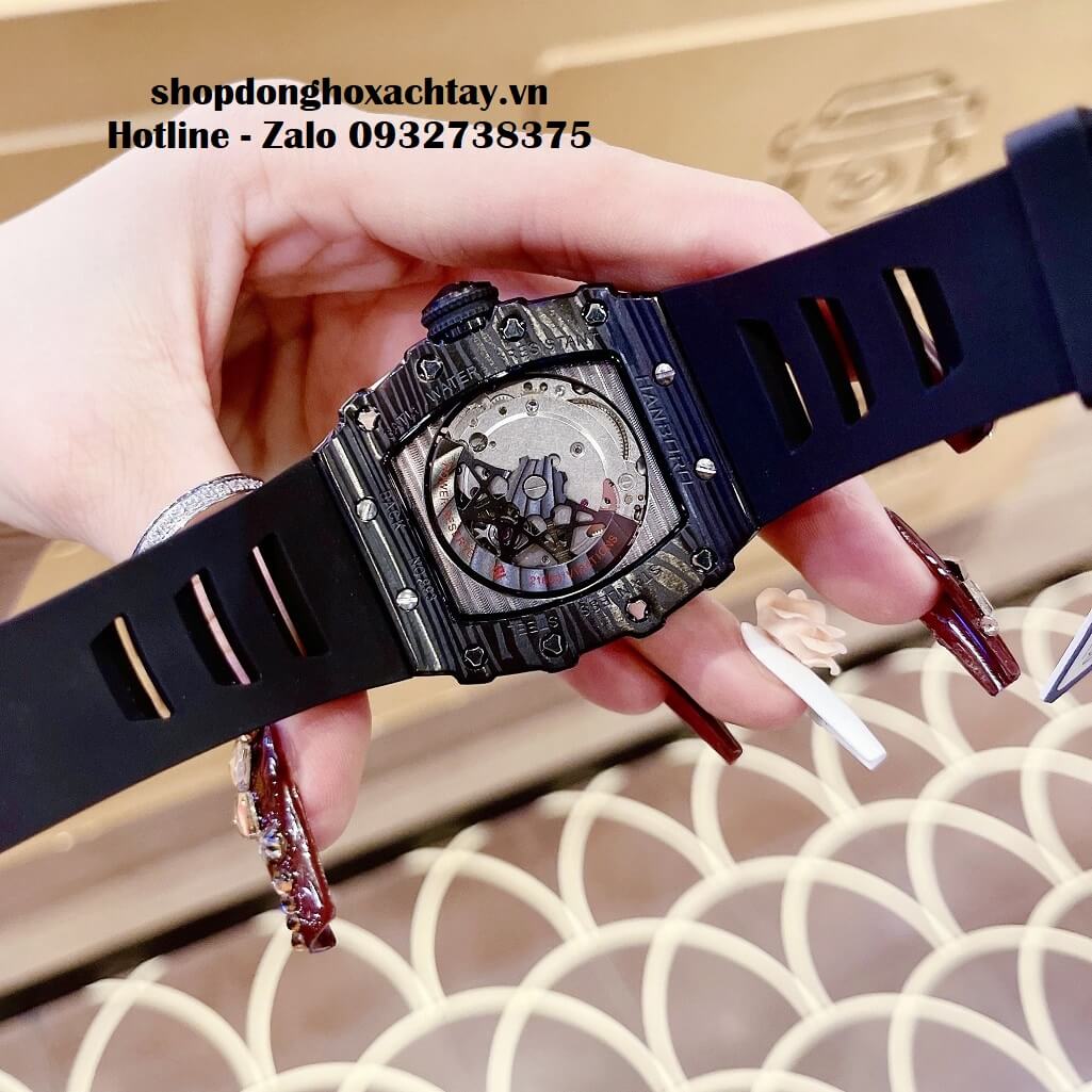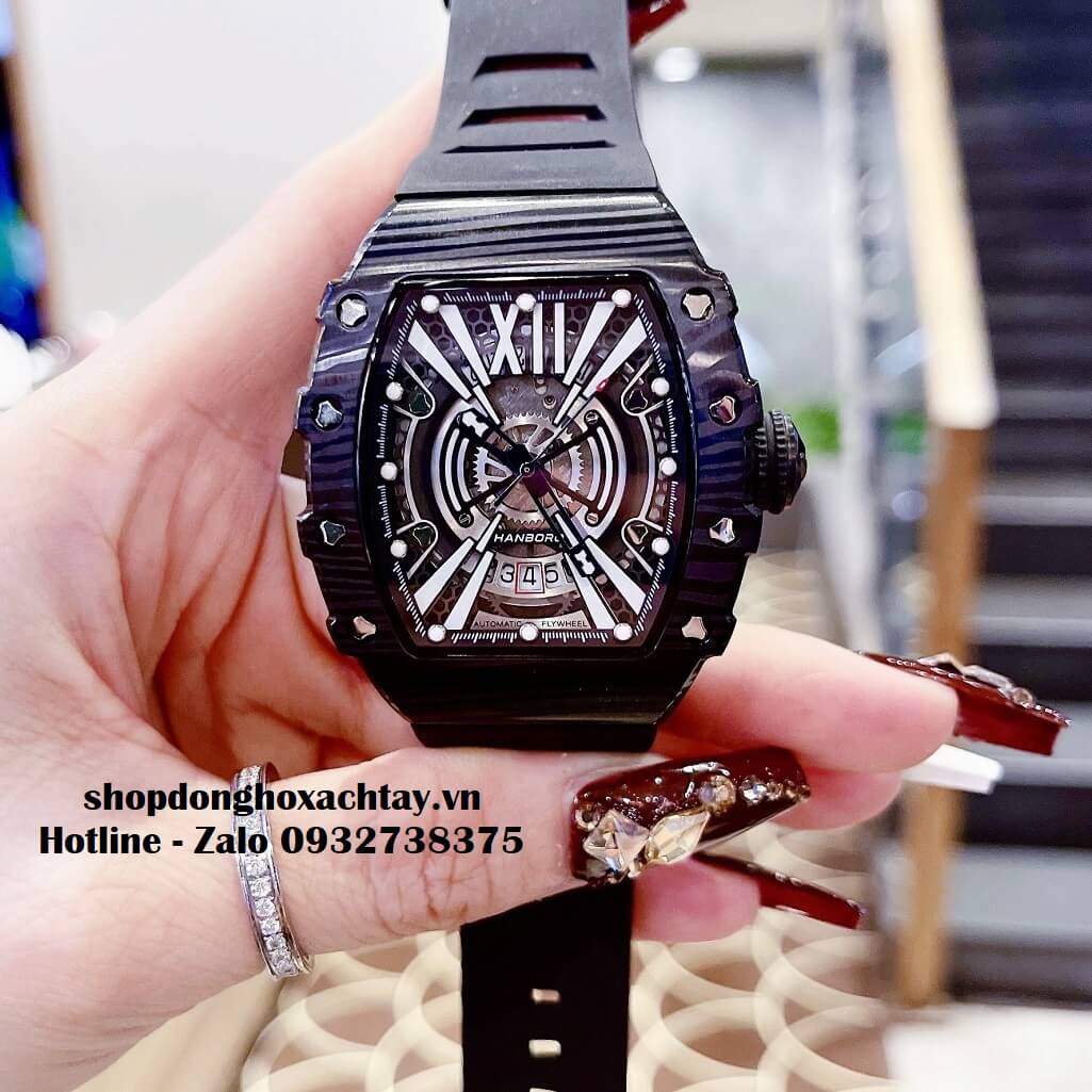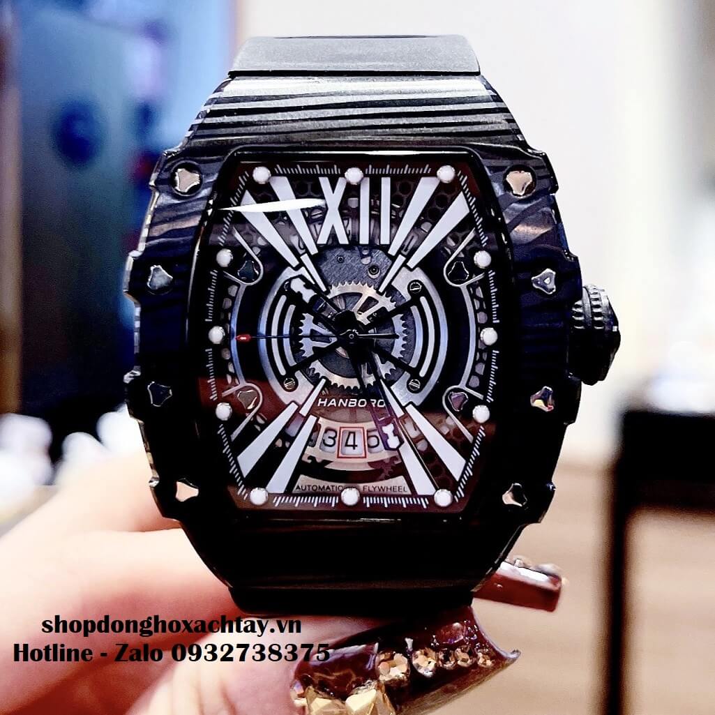 - Đồng Hồ Hanboro Nam Máy Cơ Tự Động, Dây Silicone Đen Vỏ Đen 40x48mm