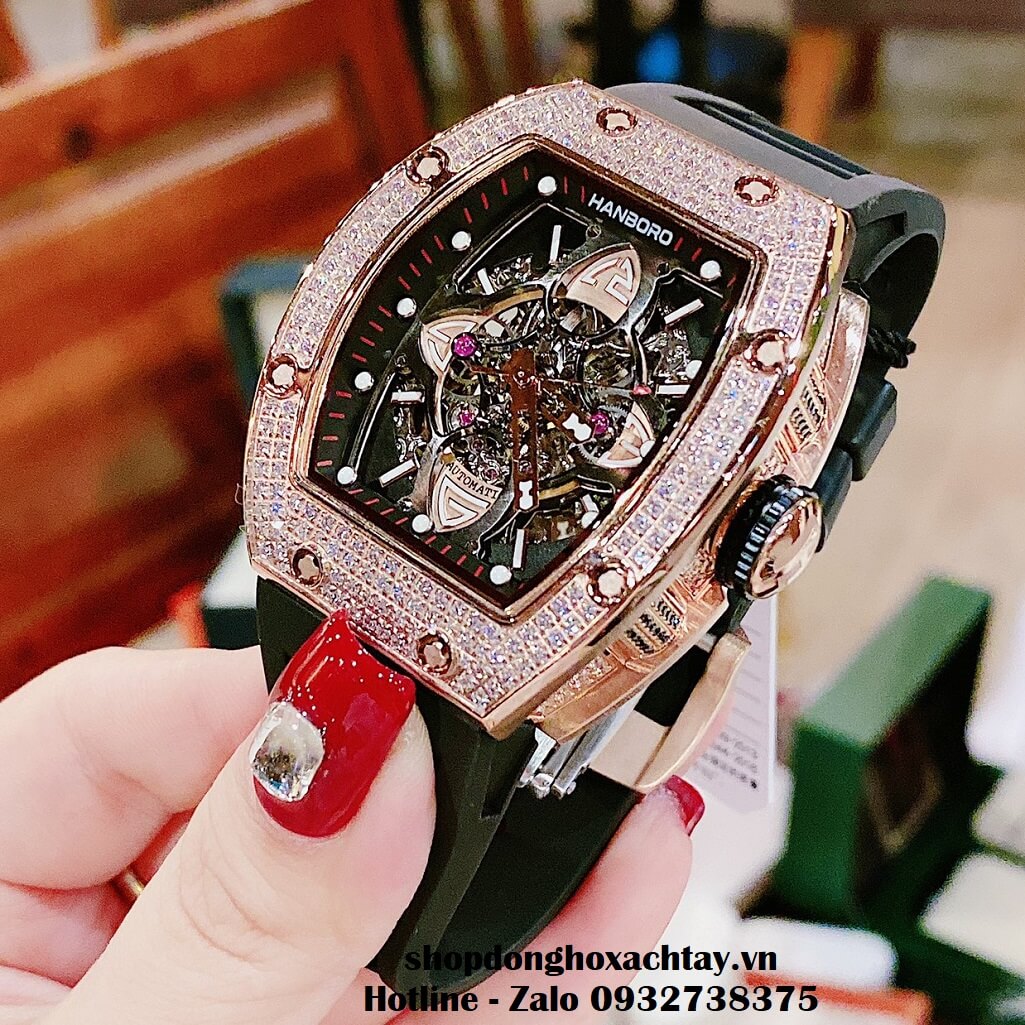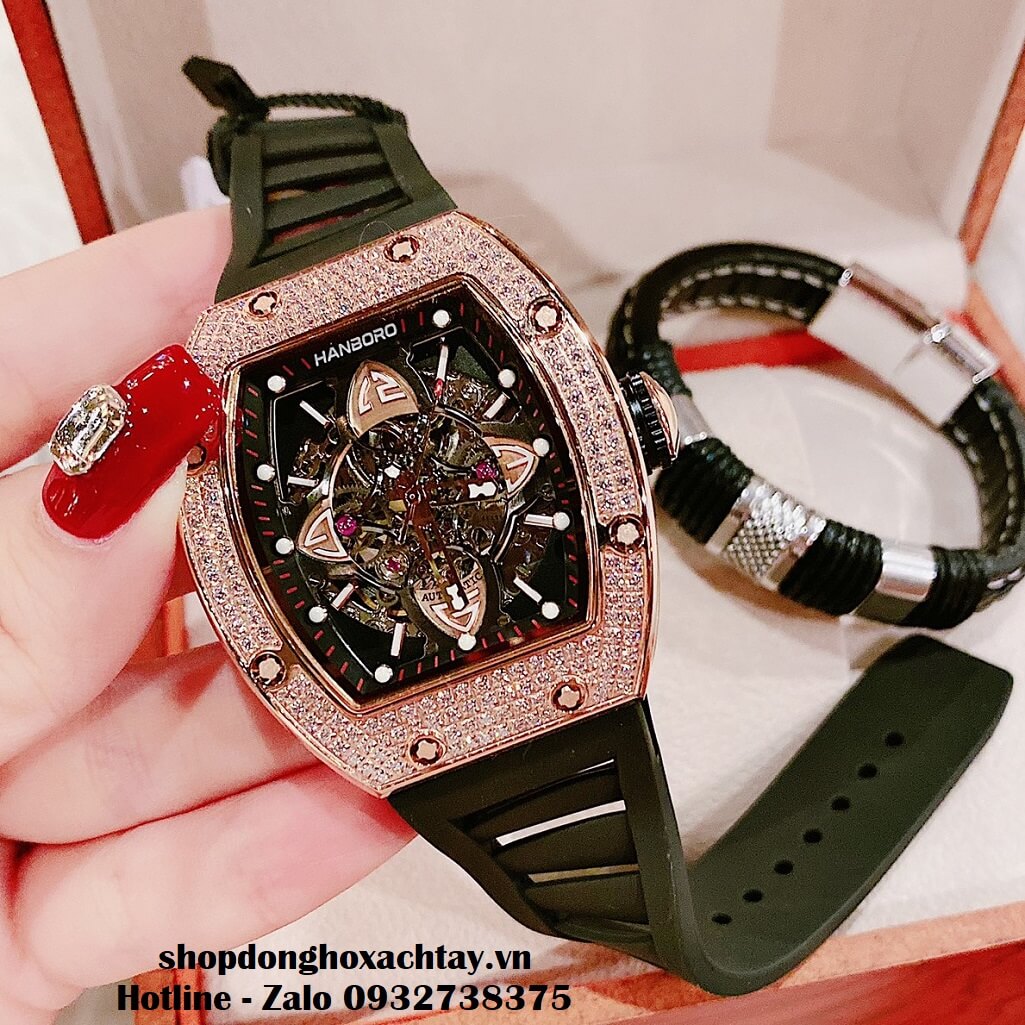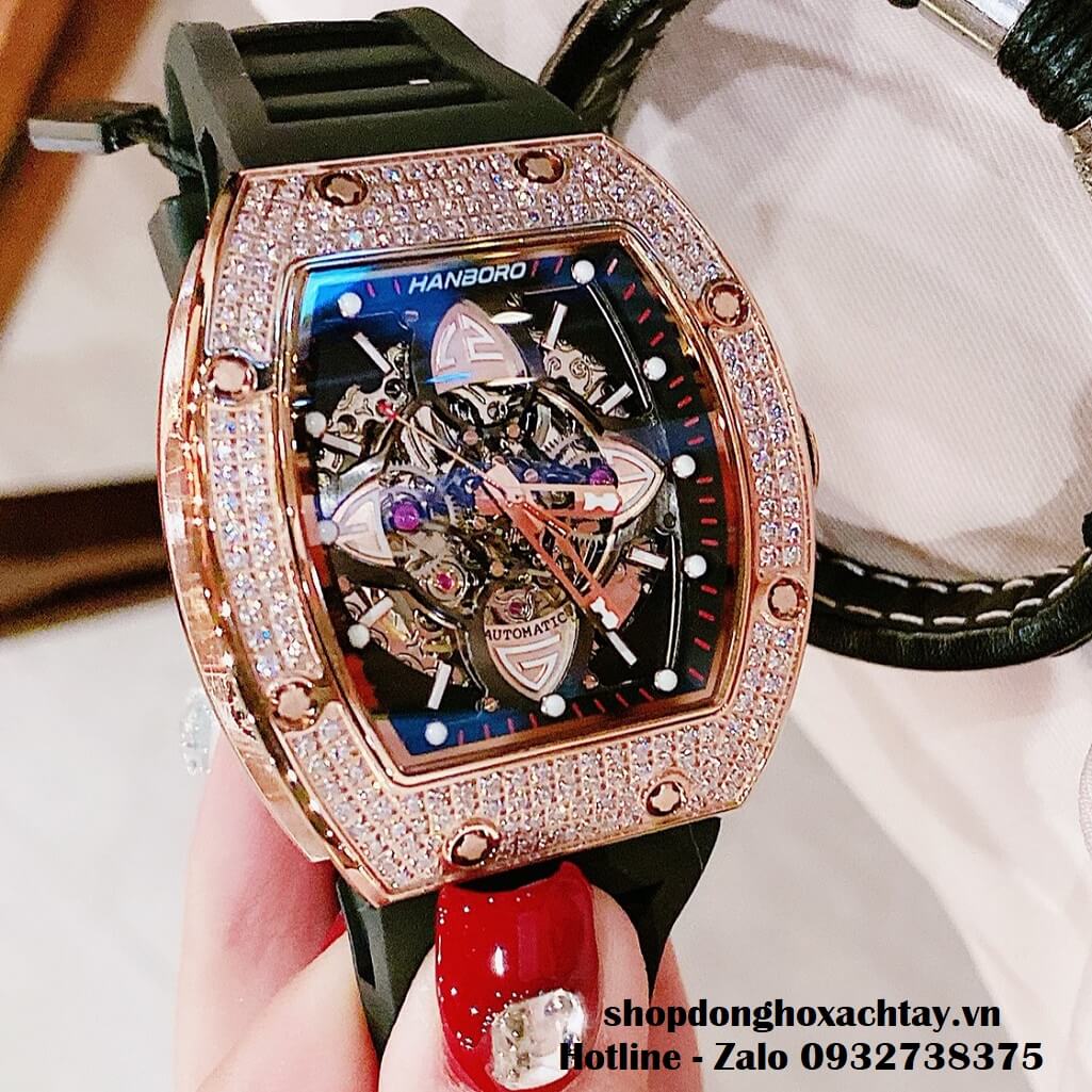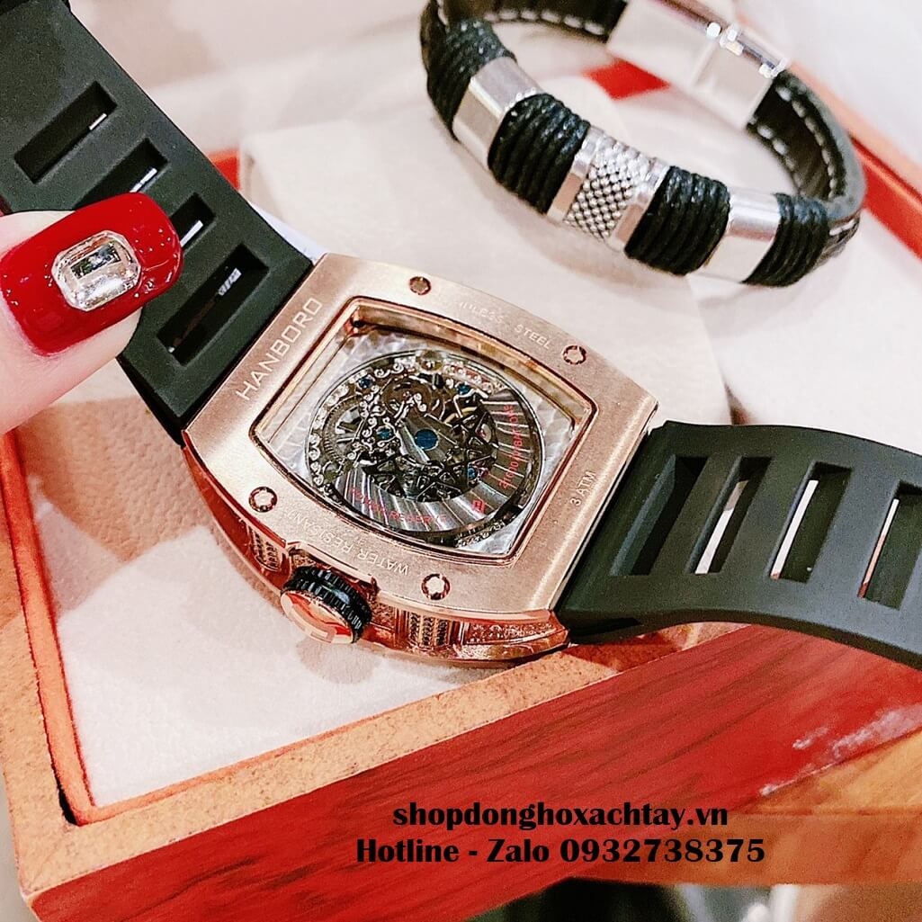 - Đồng Hồ Hanboro Nam Máy Cơ Tự Động, Dây Silicone Đen Đính Đá Rose Gold 40x48mm