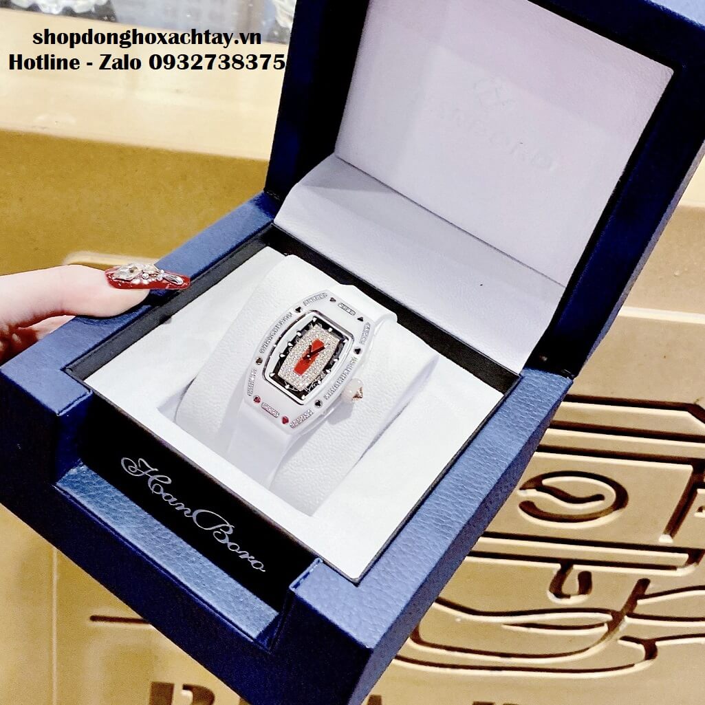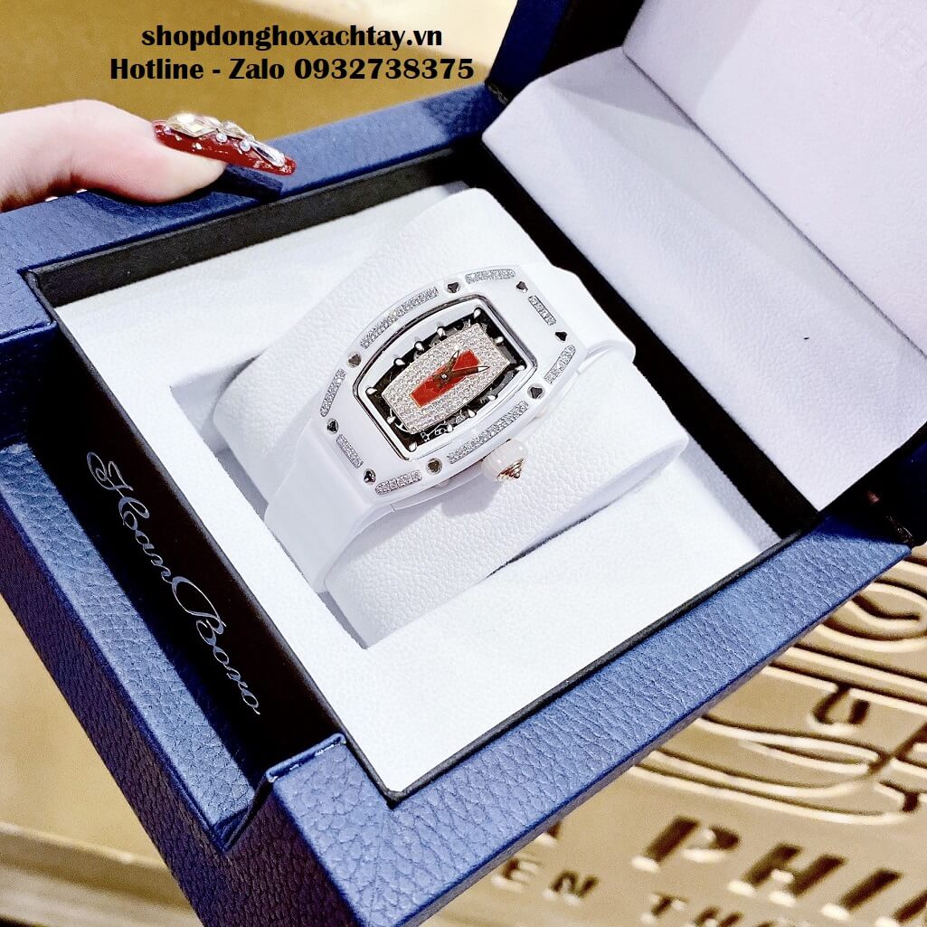 Hanboro by Huboler chính hãng dành cho nữ mặt dáng chữ nhật, dây silicon trắng lõi đỏ, vỏ đá ceramic cực xịn