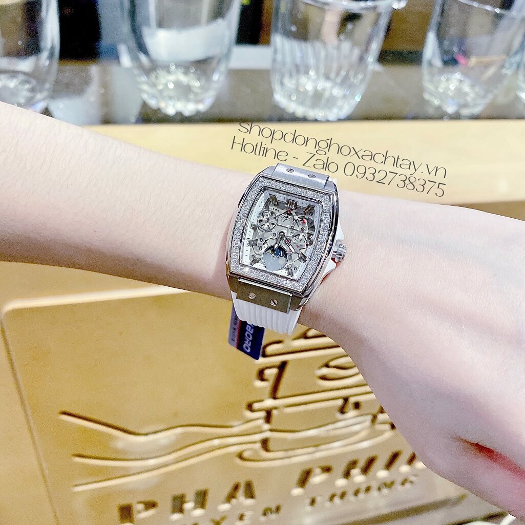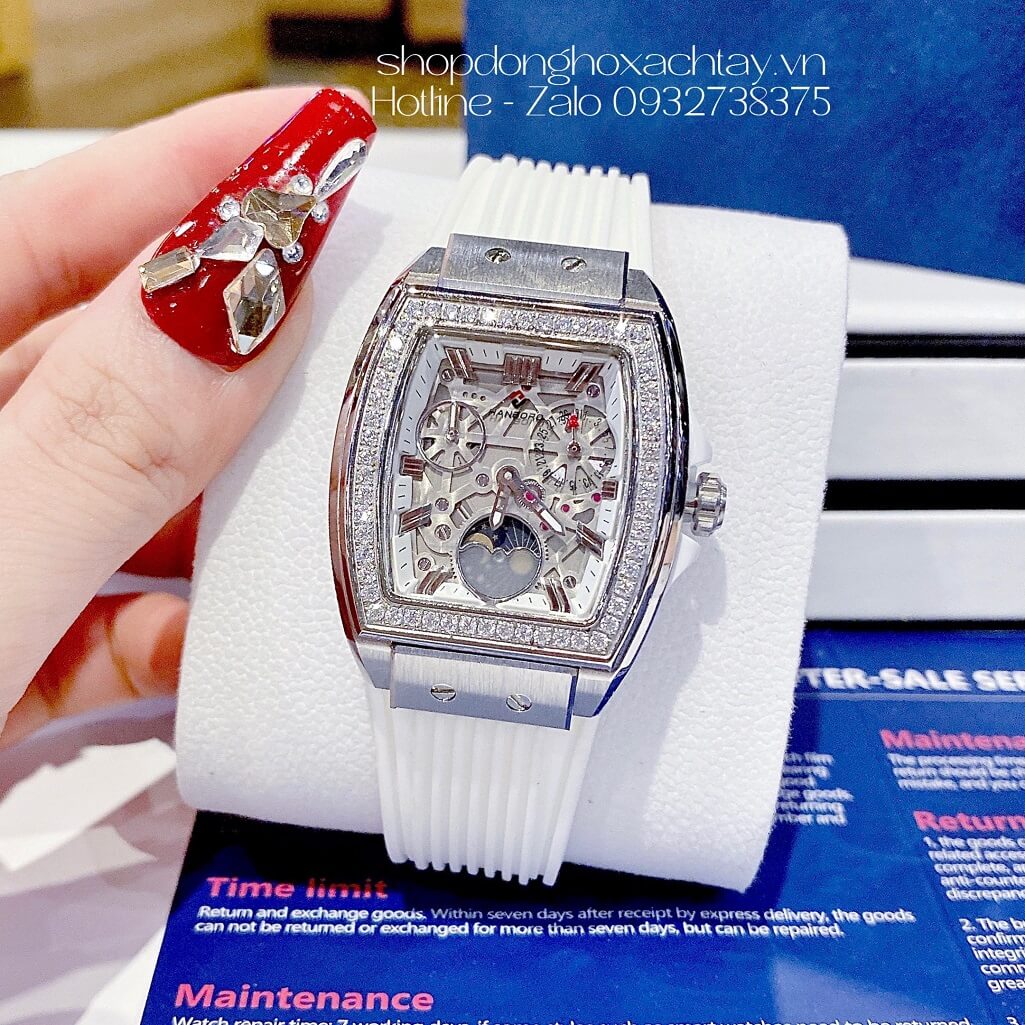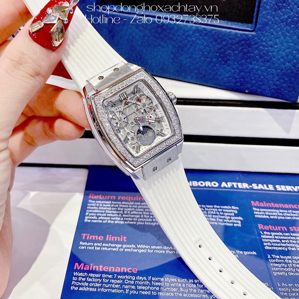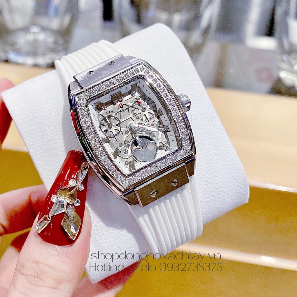 Đồng Hồ Hanboro Nữ Silicon Trắng Vỏ Silver Đính Đá 36mm Chính Hãng