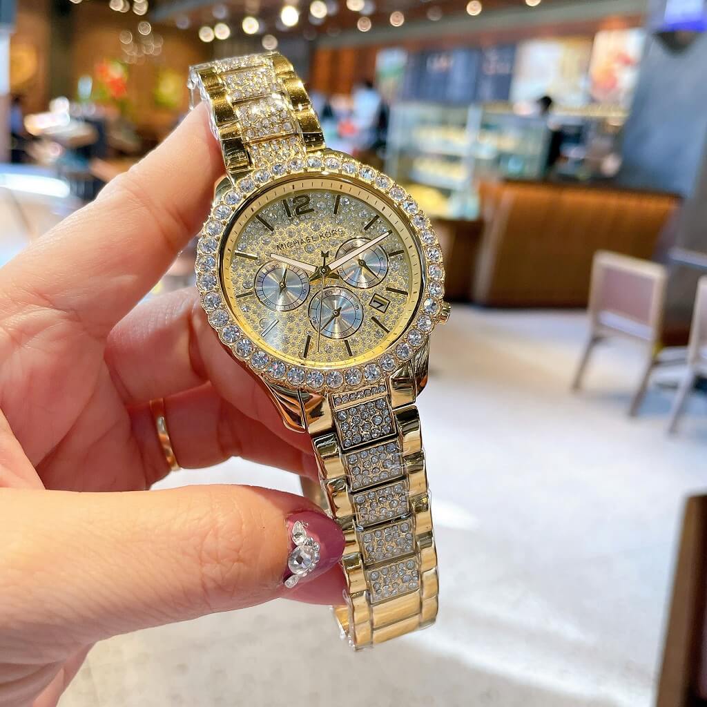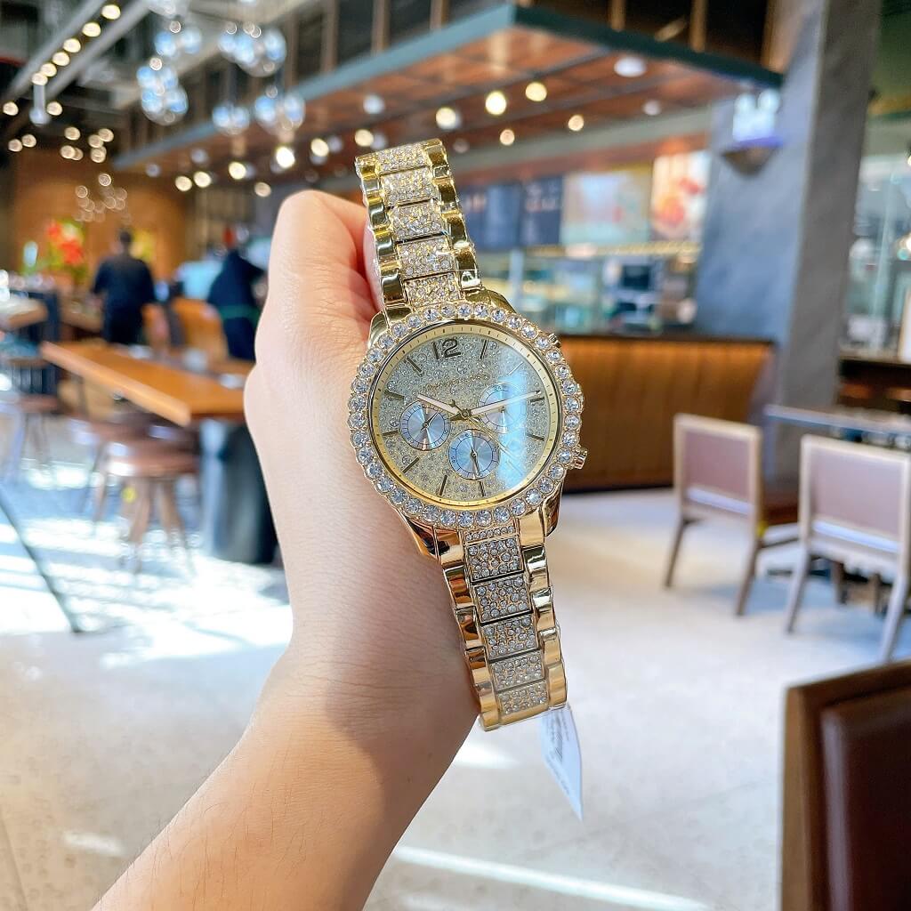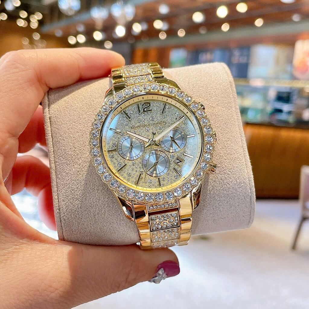 - Dây vỏ inox mạ vàng sáng loáng, với viền đính đá tròn to lấp lánh, mặt dial với 3 vòng chức năng ngày, thứ, ngày đêm 24h trên nền đá đủ size lung linh