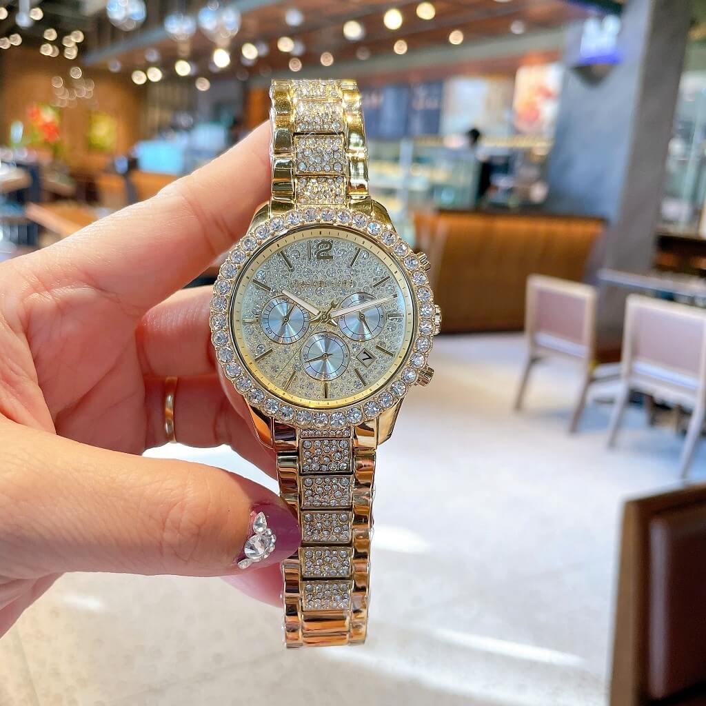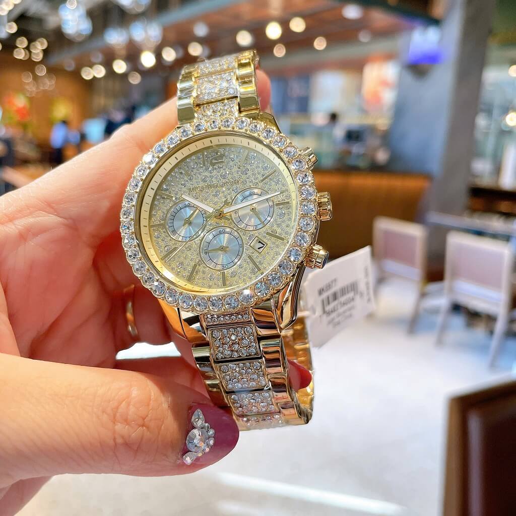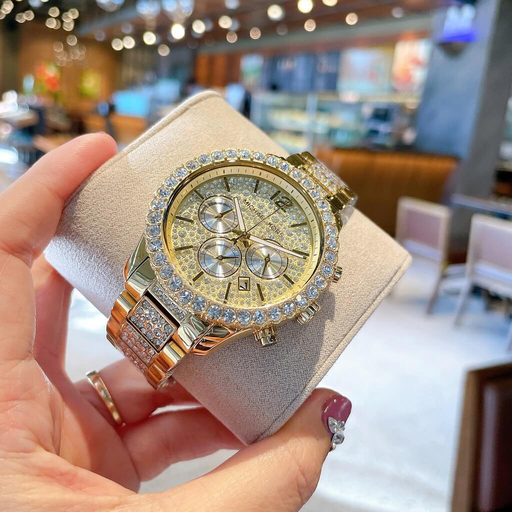 - Dây vỏ inox mạ vàng sáng loáng, với viền đính đá tròn to lấp lánh, mặt dial với 3 vòng chức năng ngày, thứ, ngày đêm 24h trên nền đá đủ size lung linh