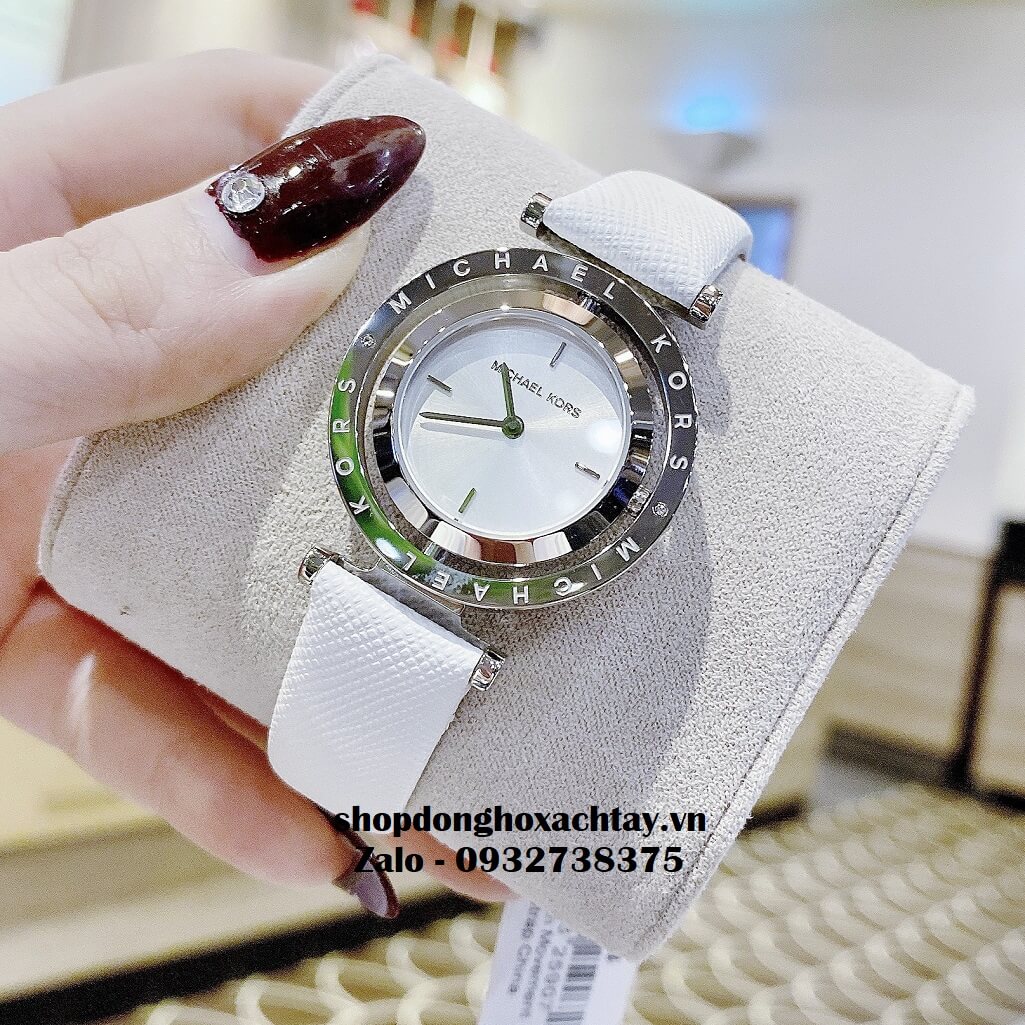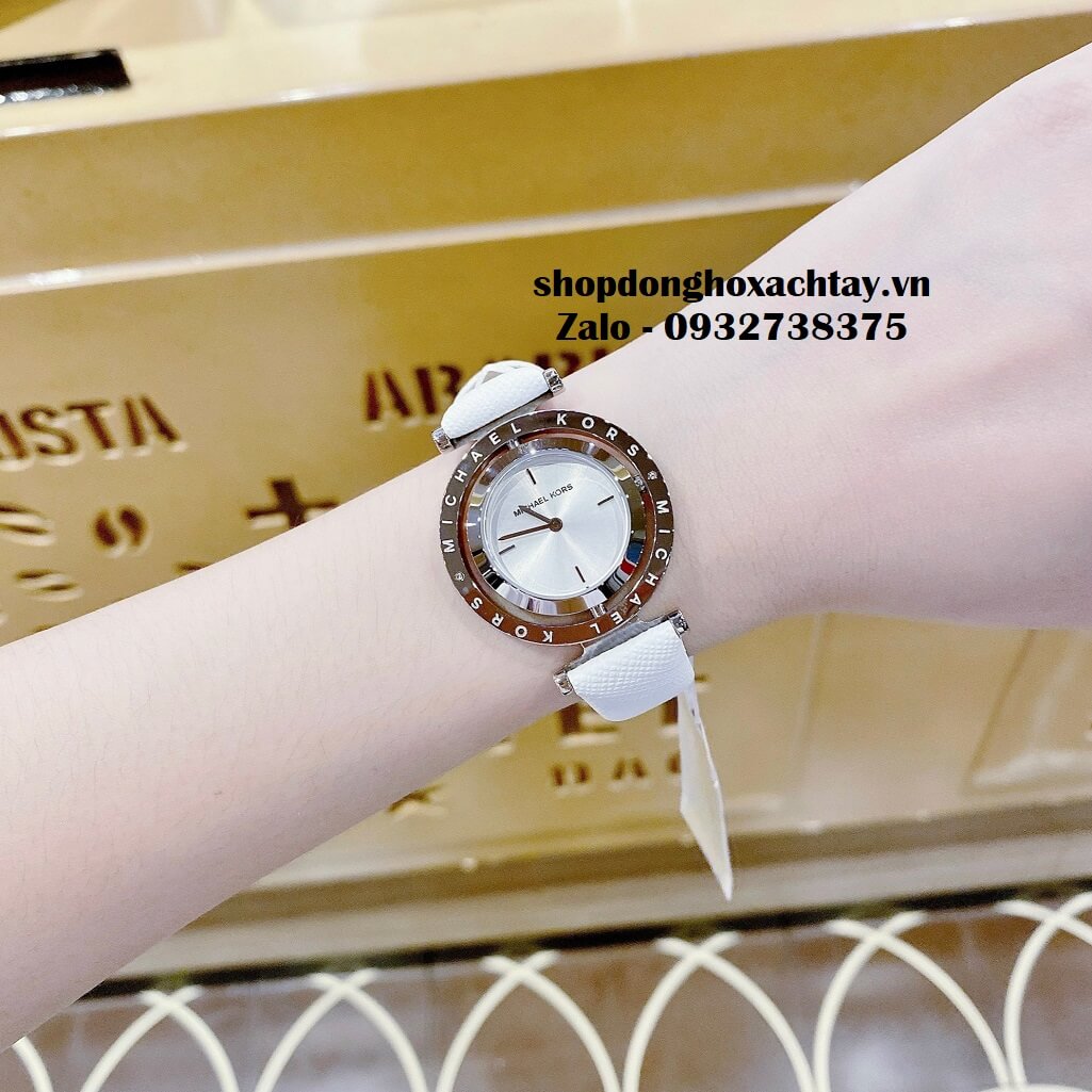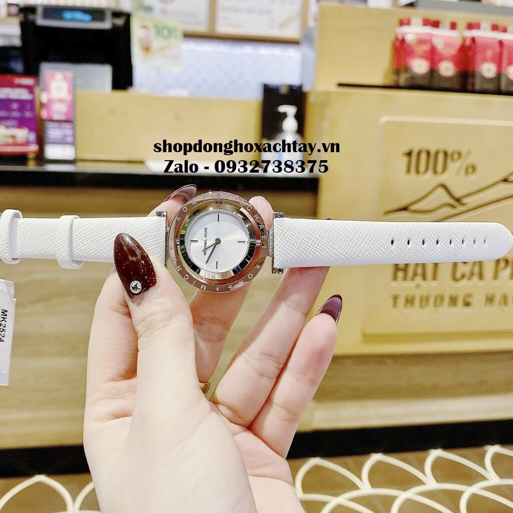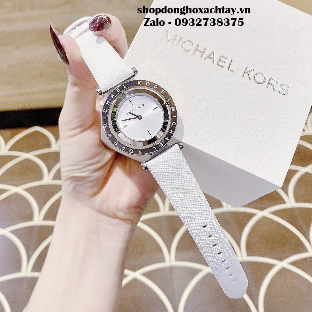 Đồng Hồ Michael Kors MK2524 Chính Hãng 33mm, màu trắng tinh khôi, đặc trưng với dây da gân saffiano hạn chế trầy và thấm nước.