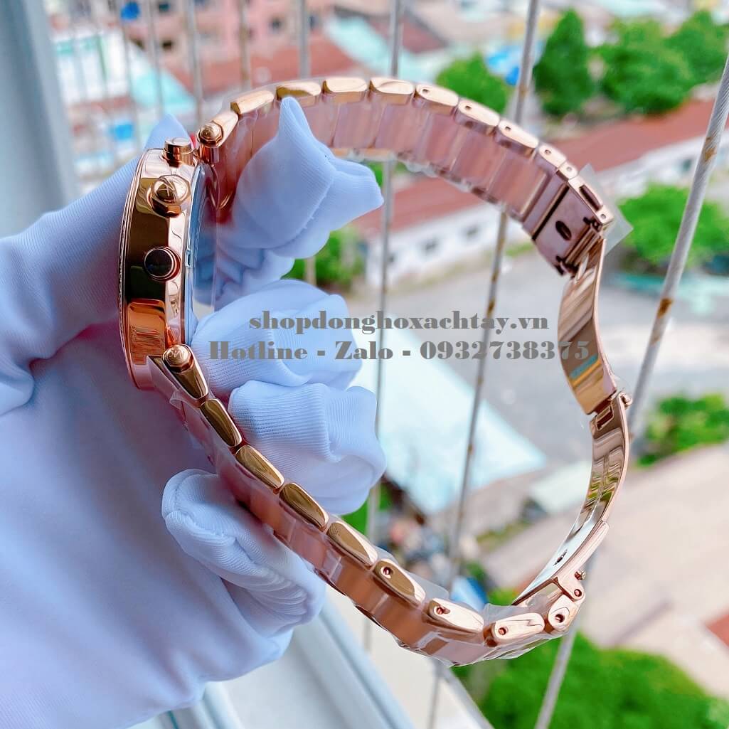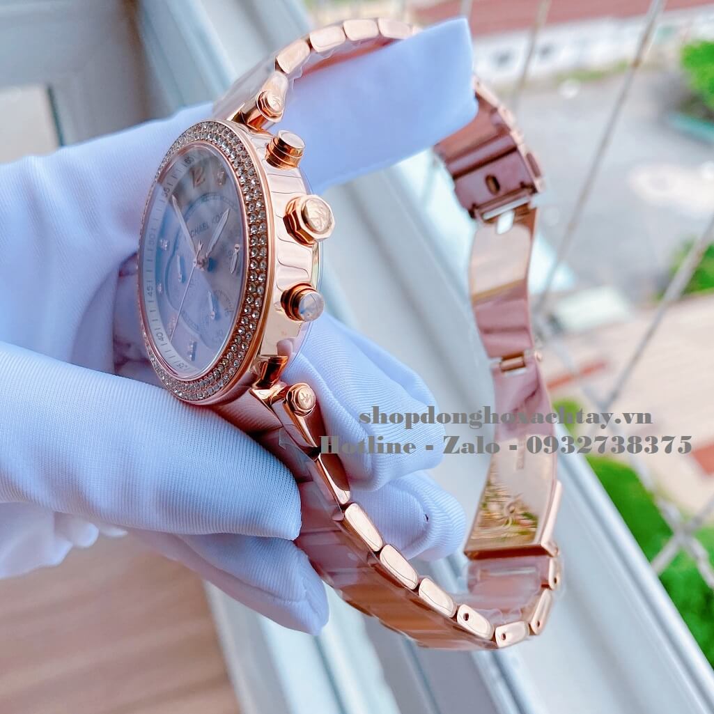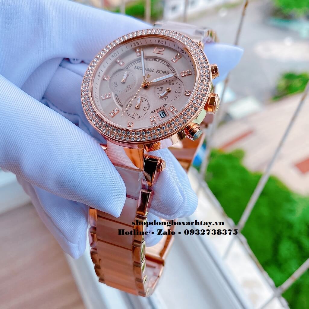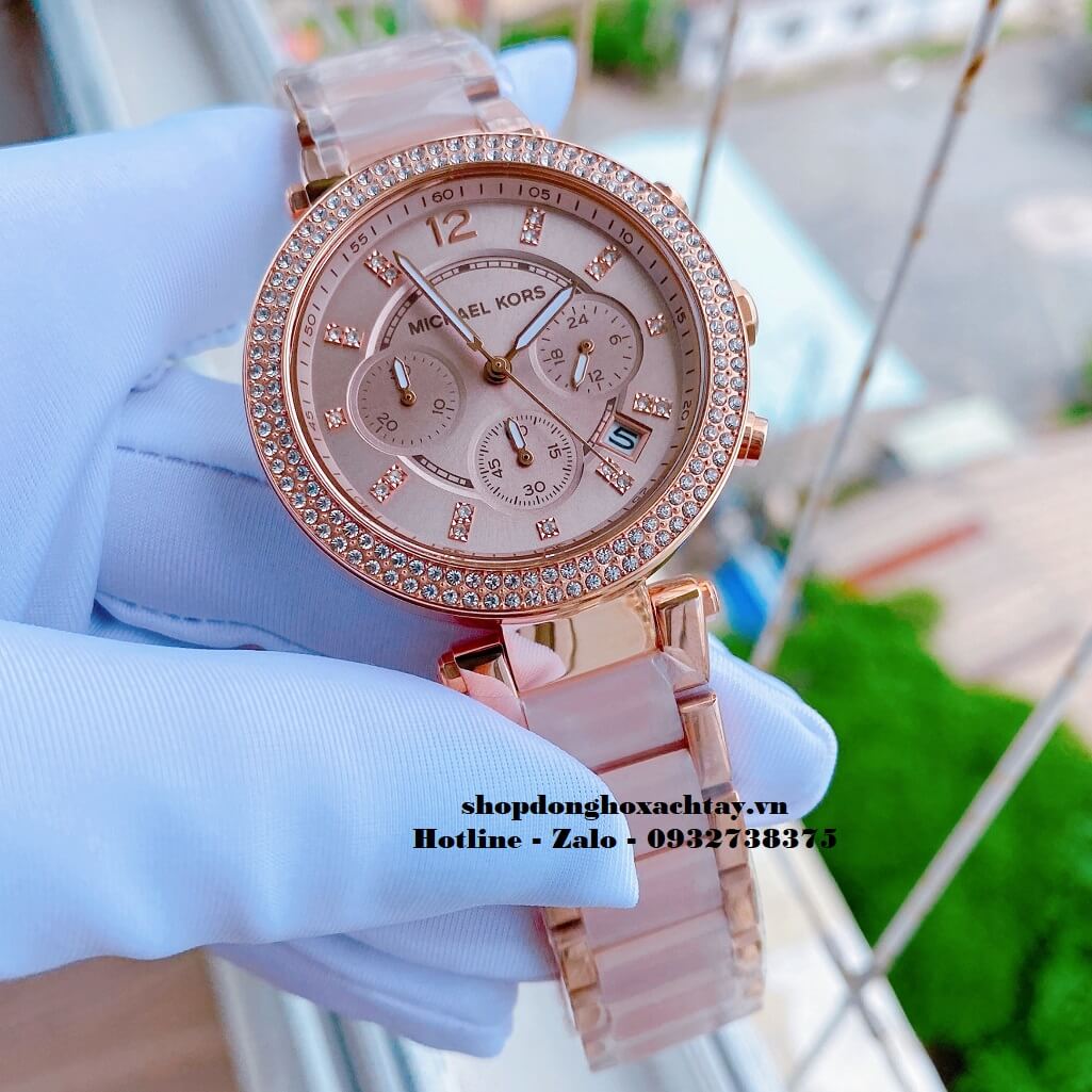 MK5896 -mẫu Parker hồng siêu hiếm. Mẫu thiết kế có viền kim loại được đính Pha Lê độc đáo, kim chỉ đc phủ phản quang và vạch số pha lê , nổi bật trên nền số màu trắng trang nhã