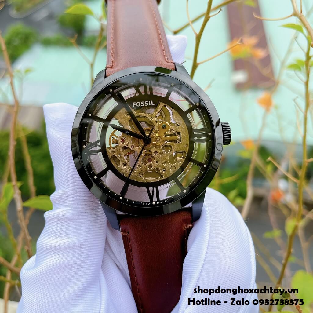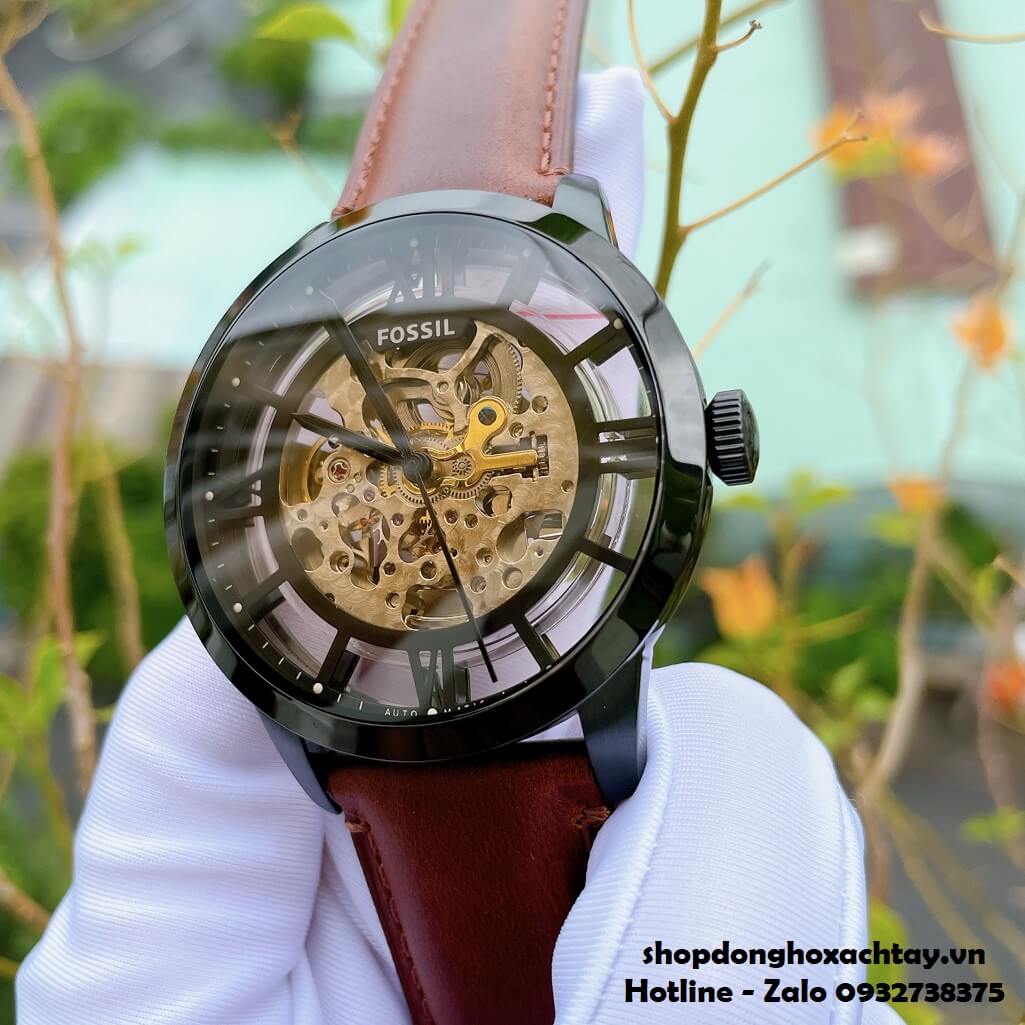 Fossil ME3098 dây da nâu mặt đen gây ấn tượng mạnh mẽ ngay từ cái nhìn đầu tiên, bởi lẽ mặt số được thiết kế độc đáo với mặt kính trước và sau trong suốt.