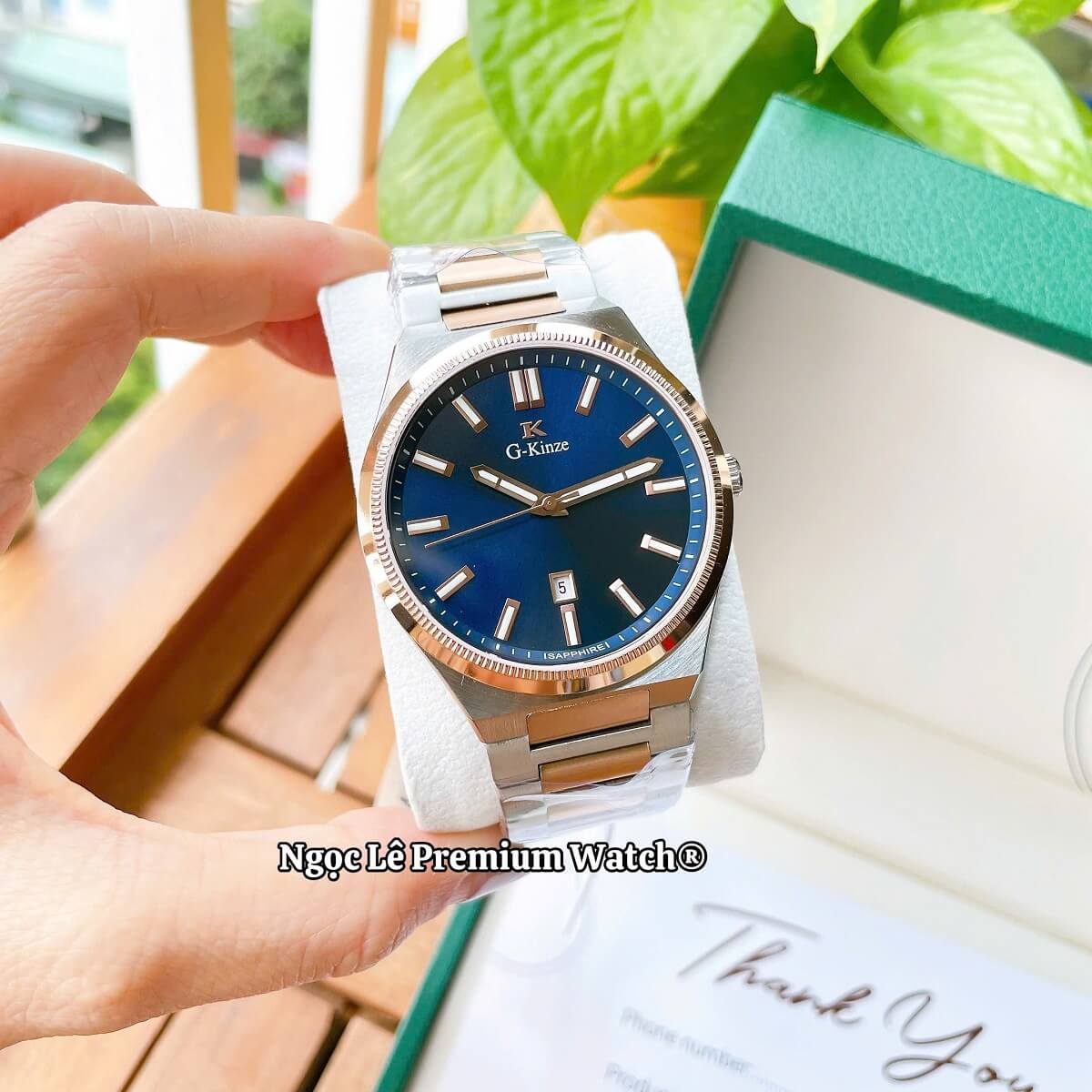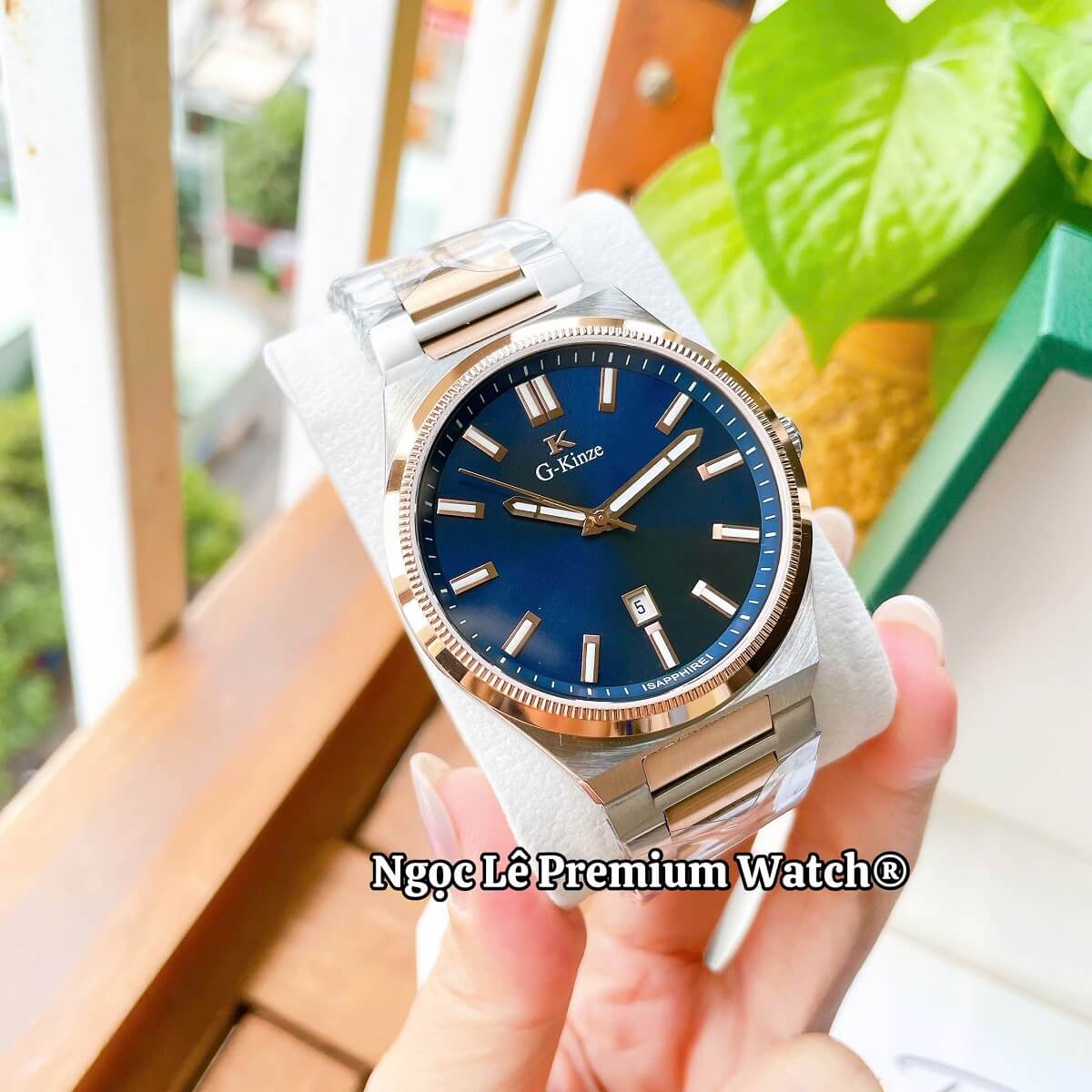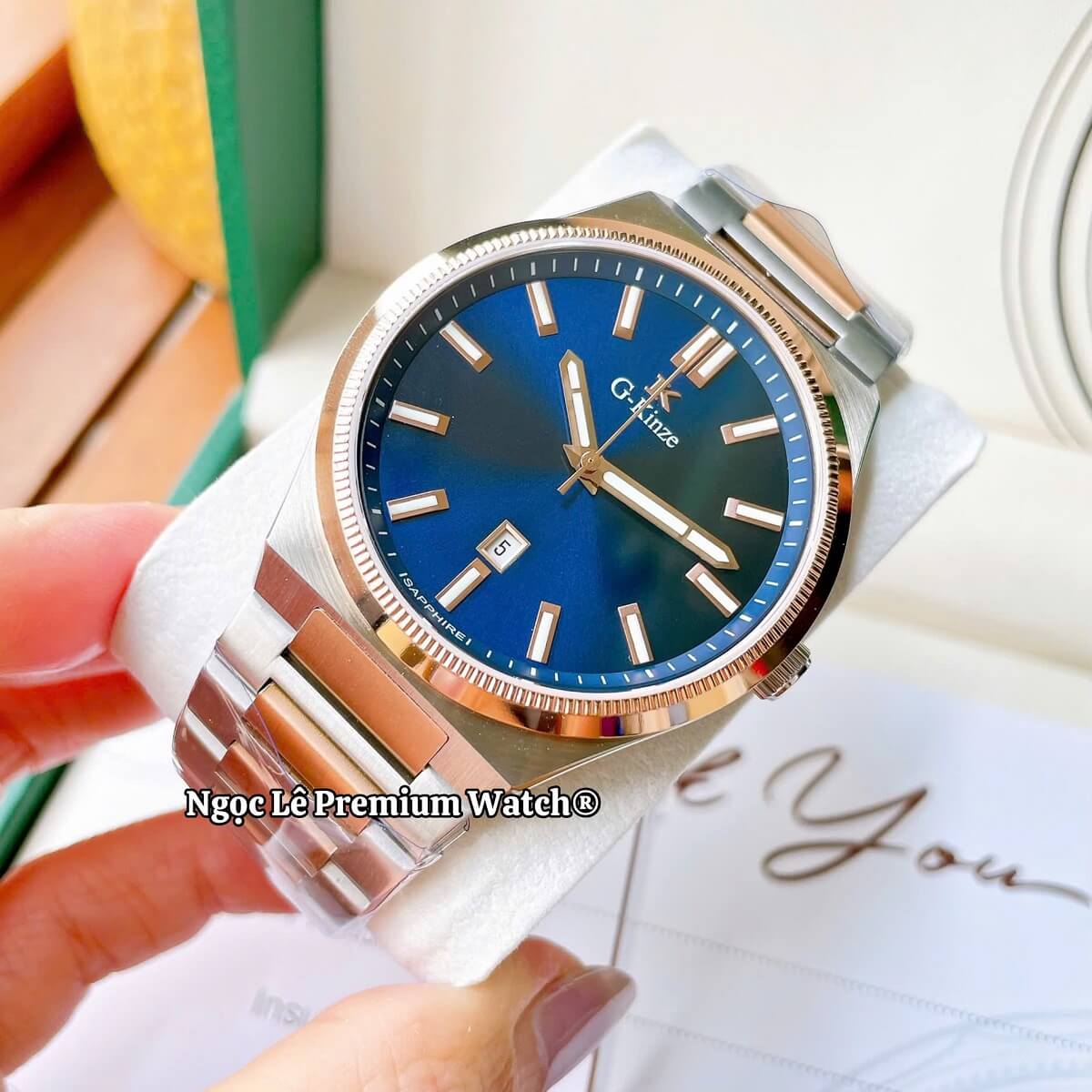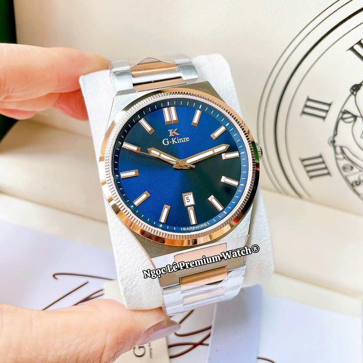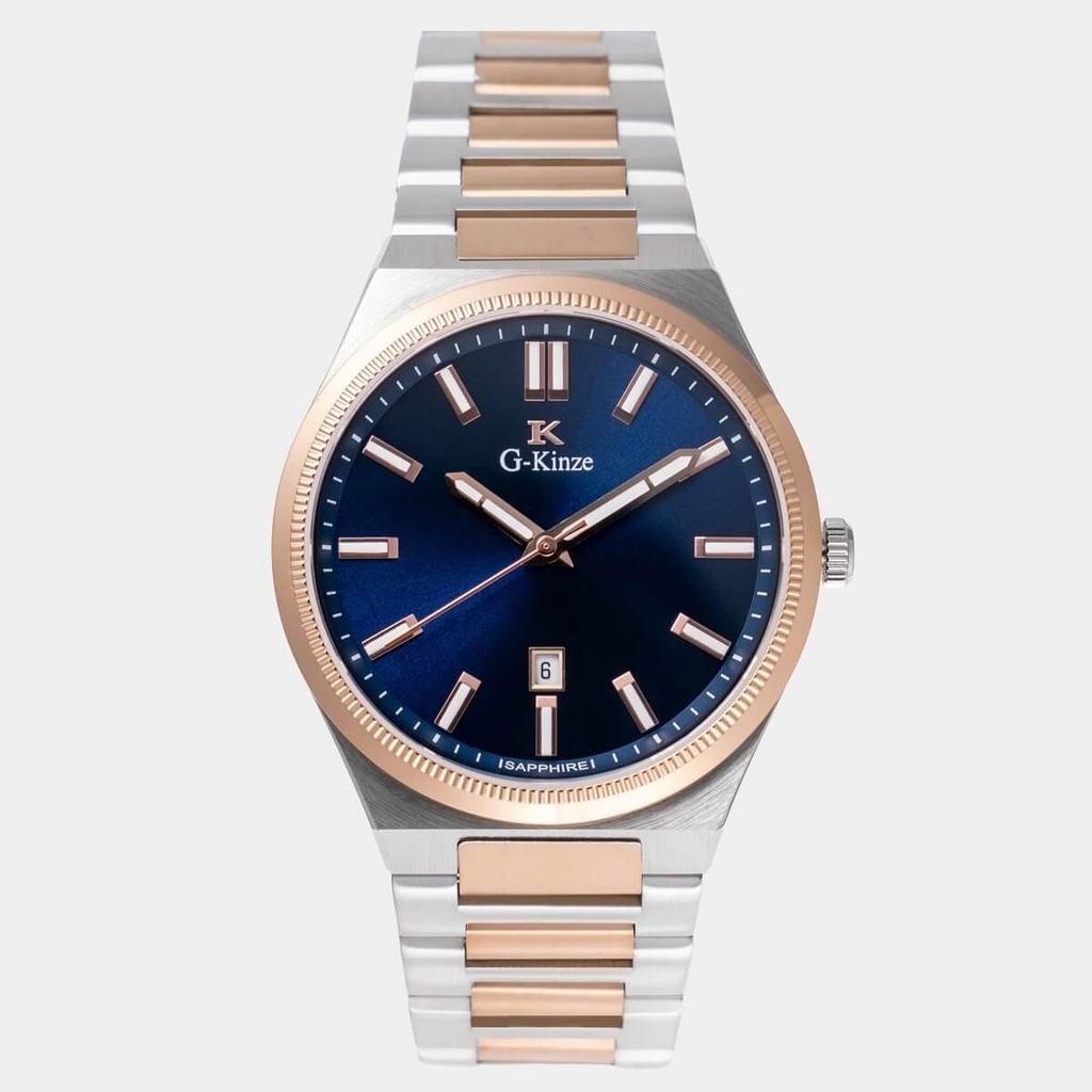 G-Kinze GK7010M phiên bản mặt xanh dương kết hợp cùng dây kim loại demi rose mang phong cách hiện đại, nổi bật nhưng vẫn giữ được nét nam tính và lịch lãm. Tông xanh dương trẻ trung phối màu rose gold tạo điểm nhấn sang trọng, phù hợp cho nam giới đeo hằng ngày, đi làm, đi chơi hay dự tiệc đều rất cuốn hút.