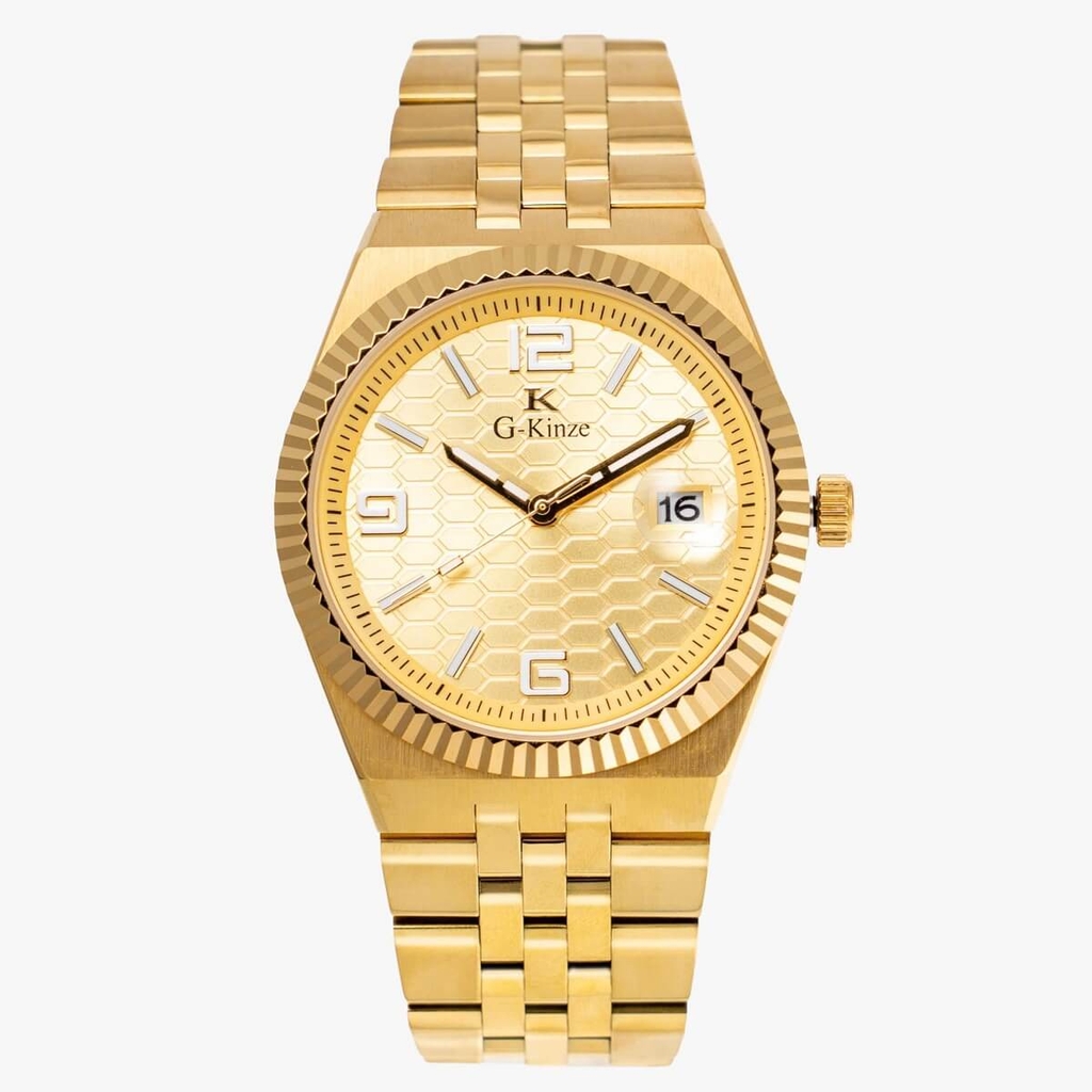 Đồng Hồ Nam G-Kinze GK7032M Full Gold là mẫu đồng hồ mang phong cách sang trọng và đẳng cấp, nổi bật với thiết kế mạ vàng toàn bộ (Full Gold) giúp người đeo thể hiện phong cách lịch lãm và nam tính.