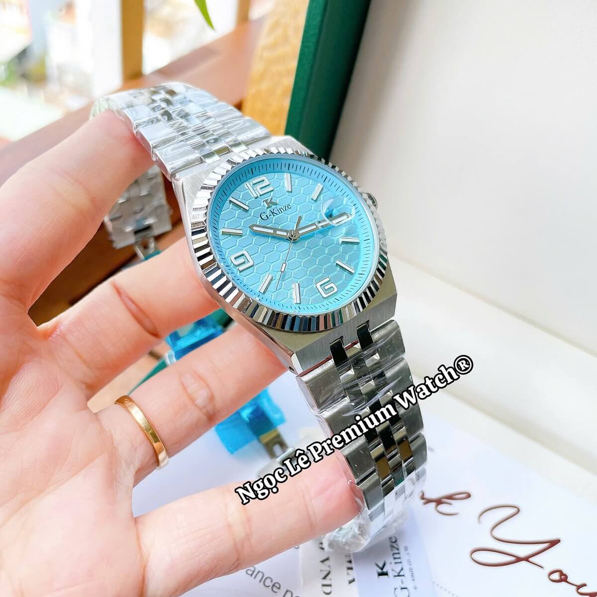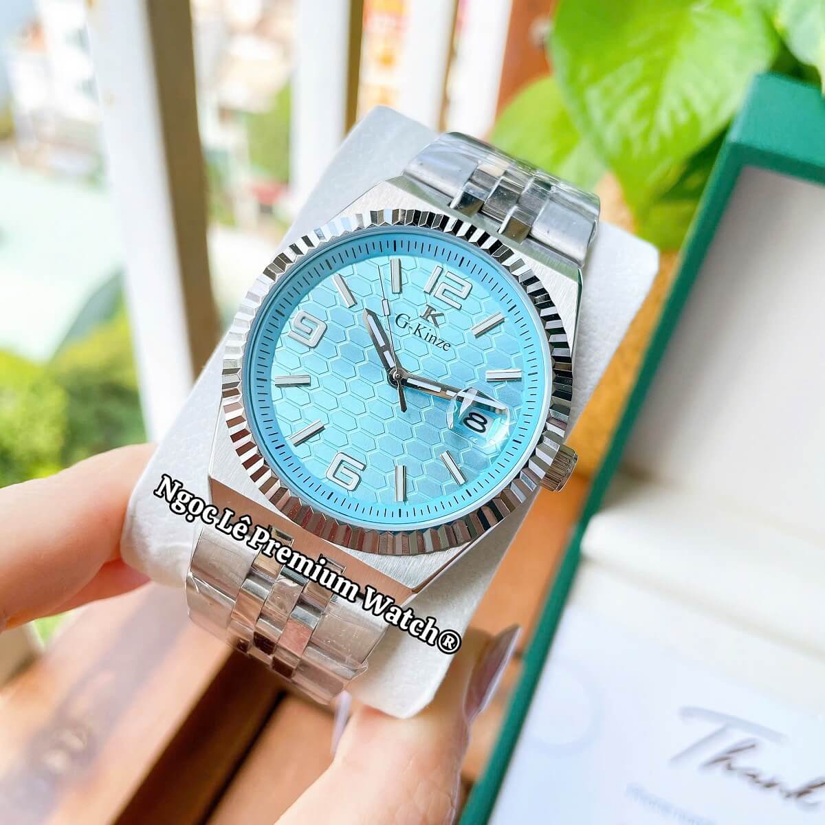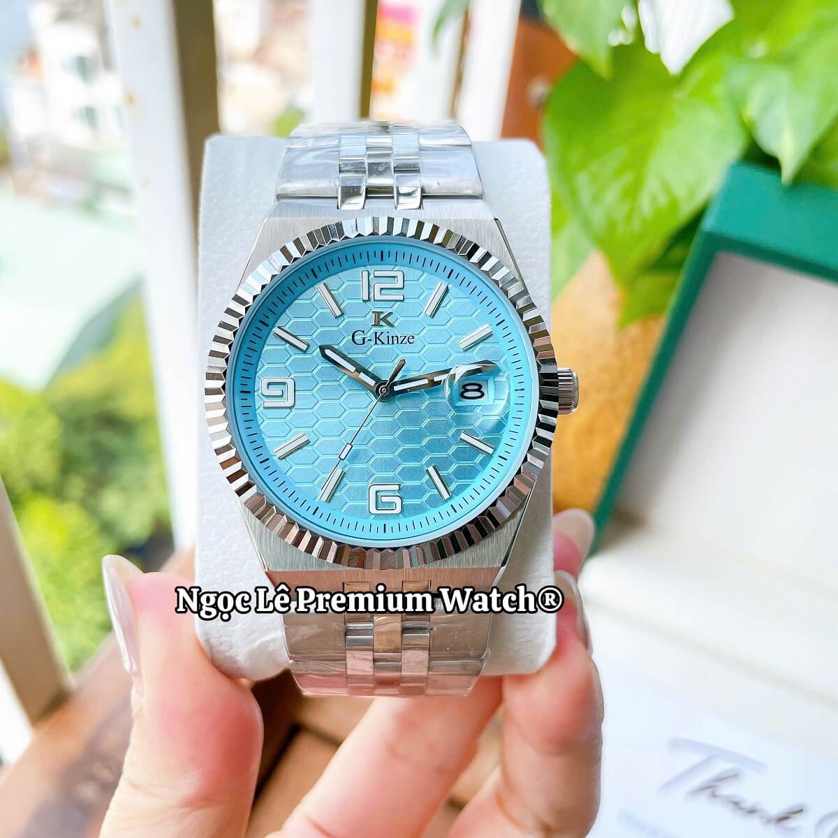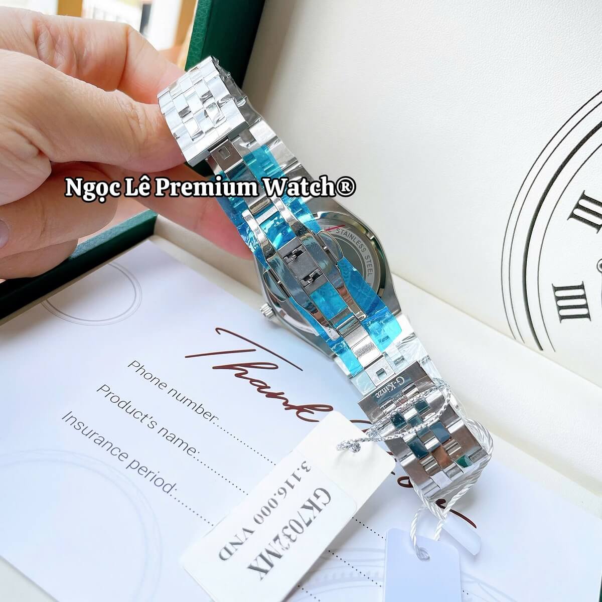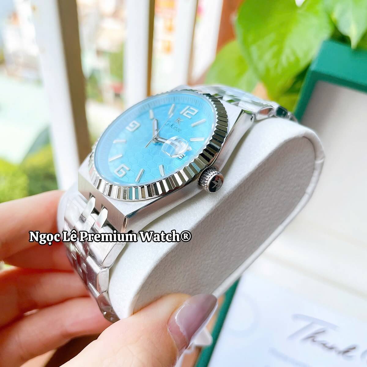 ✔ Thiết kế sang trọng – mặt xanh hiện đại, dây kim loại bạc nam tính.