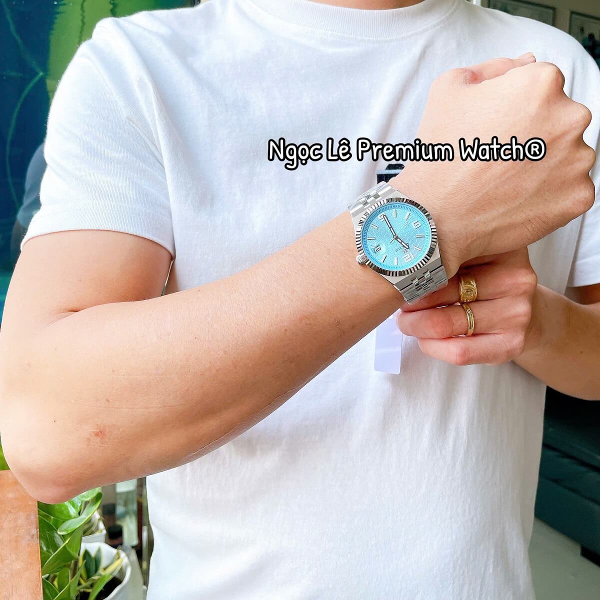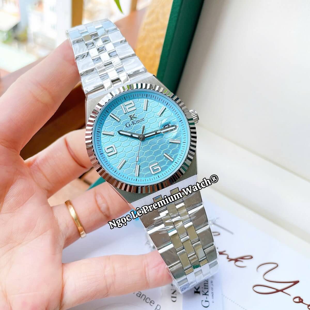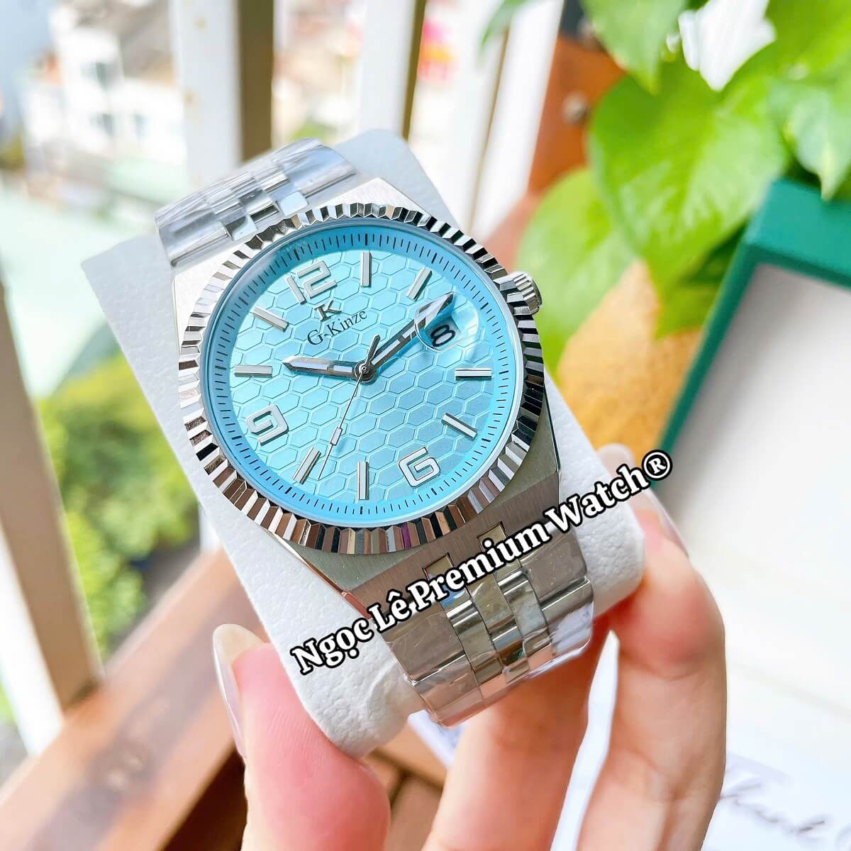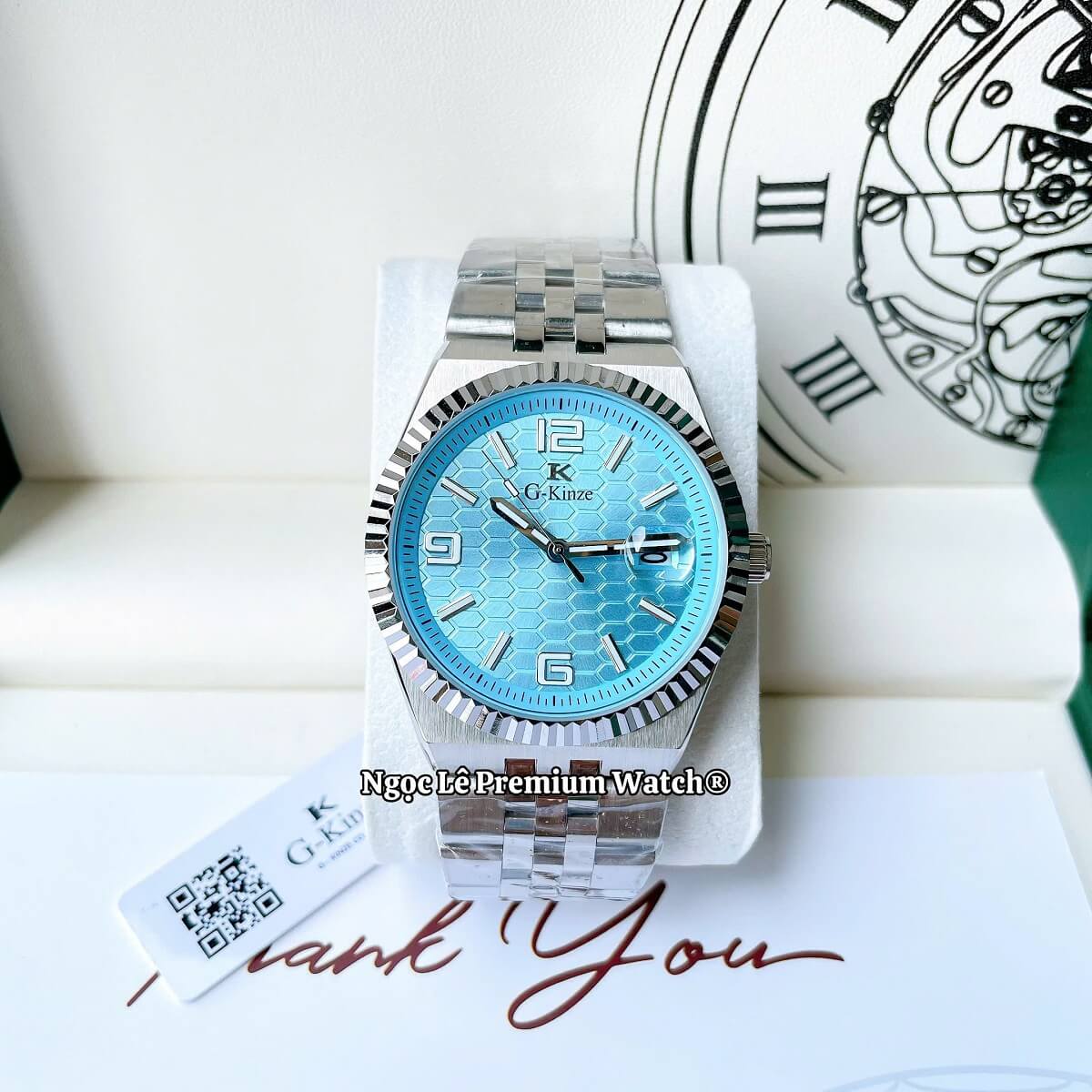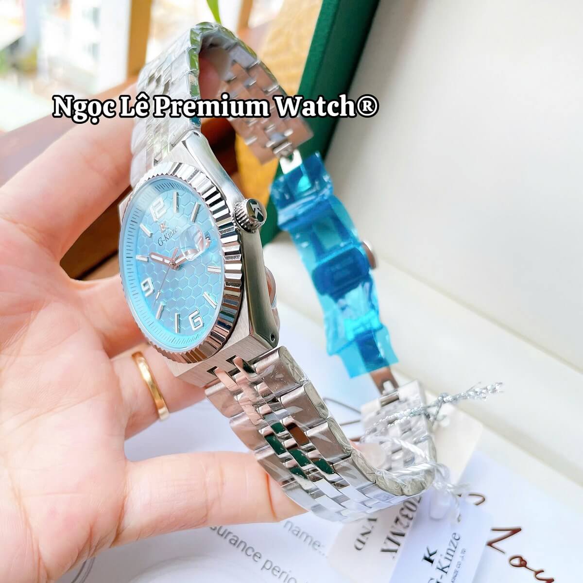 ✔ Thiết kế sang trọng – mặt xanh hiện đại, dây kim loại bạc nam tính.