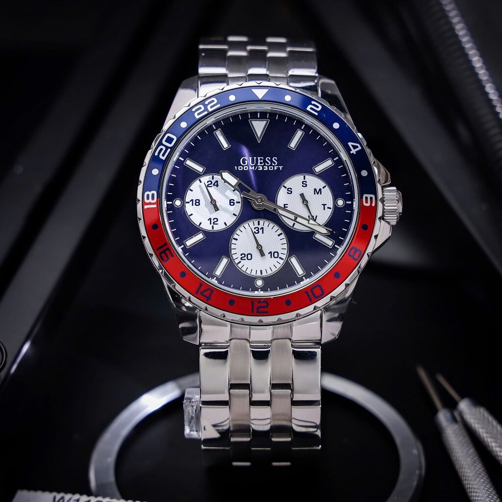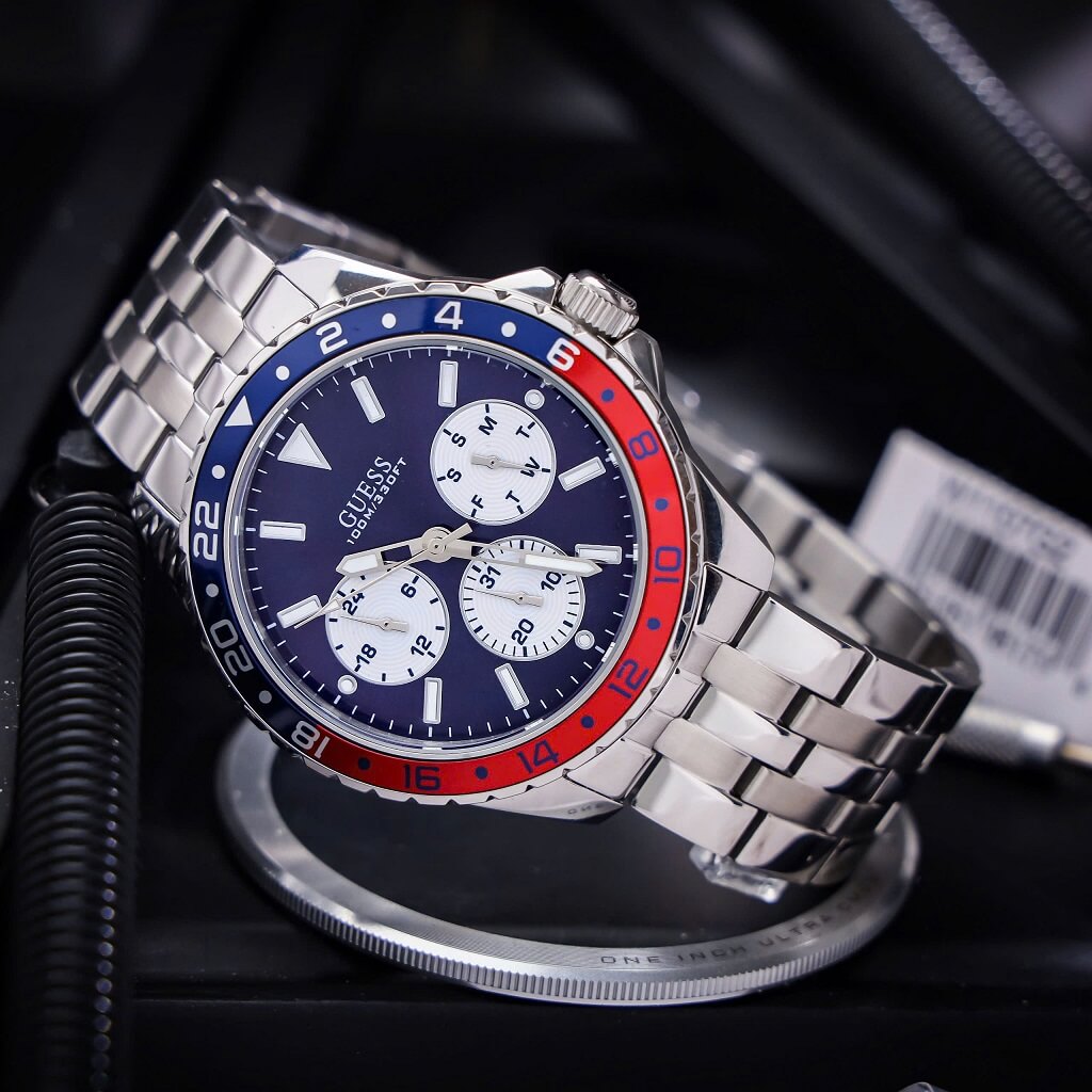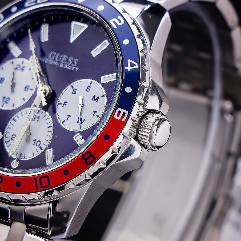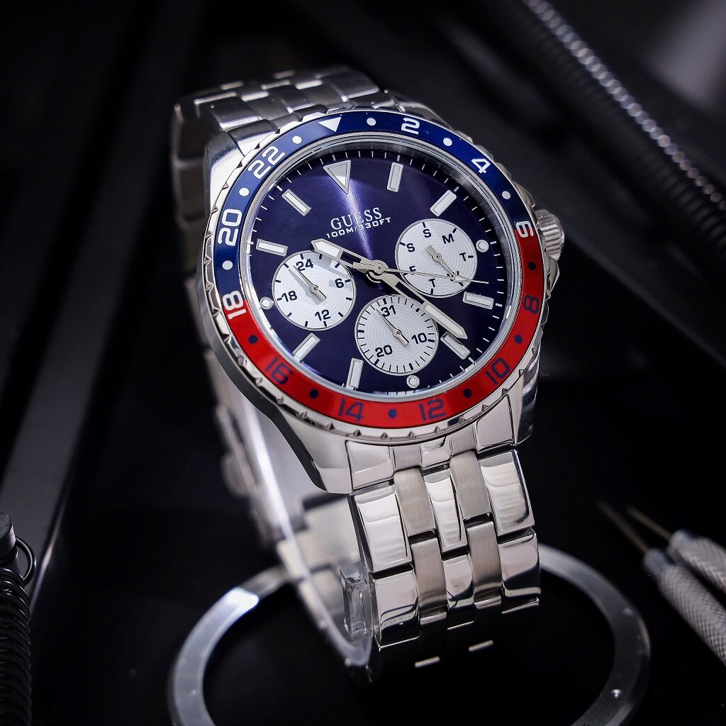 - Đồng hồ Guess nam chính hãng với thiết kế mặt dial xanh dương với viền benzel pepsi xanh đỏ mang phong cách rất thể thao