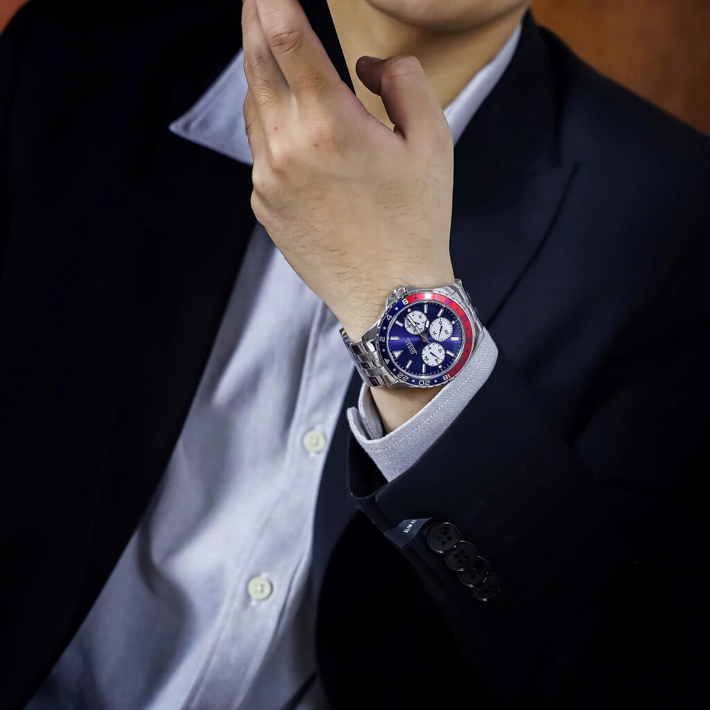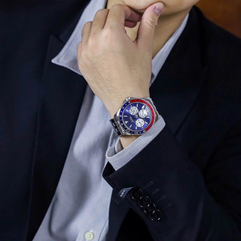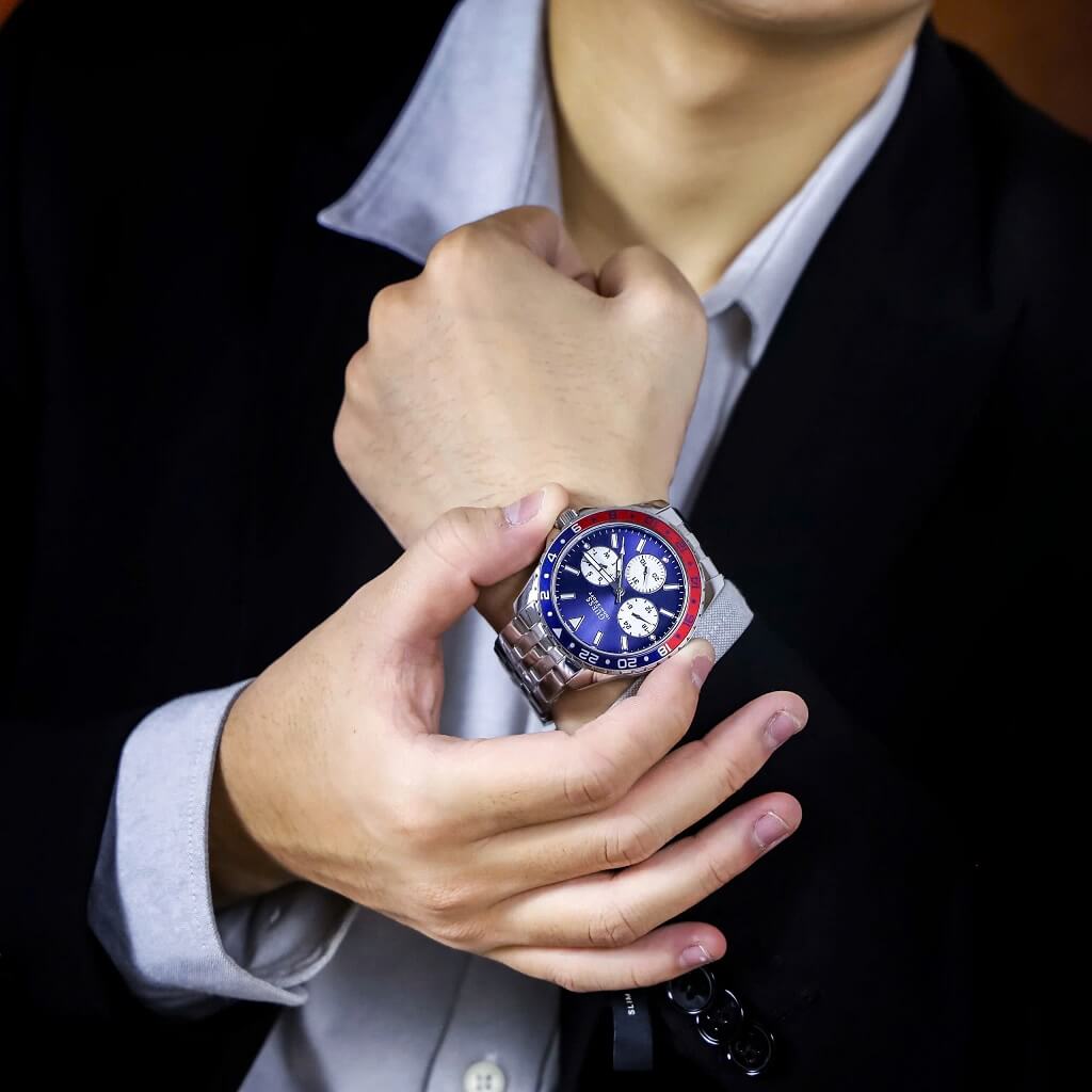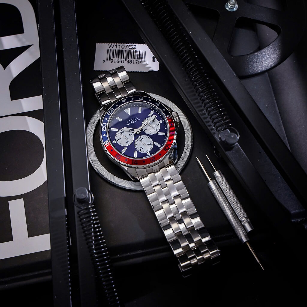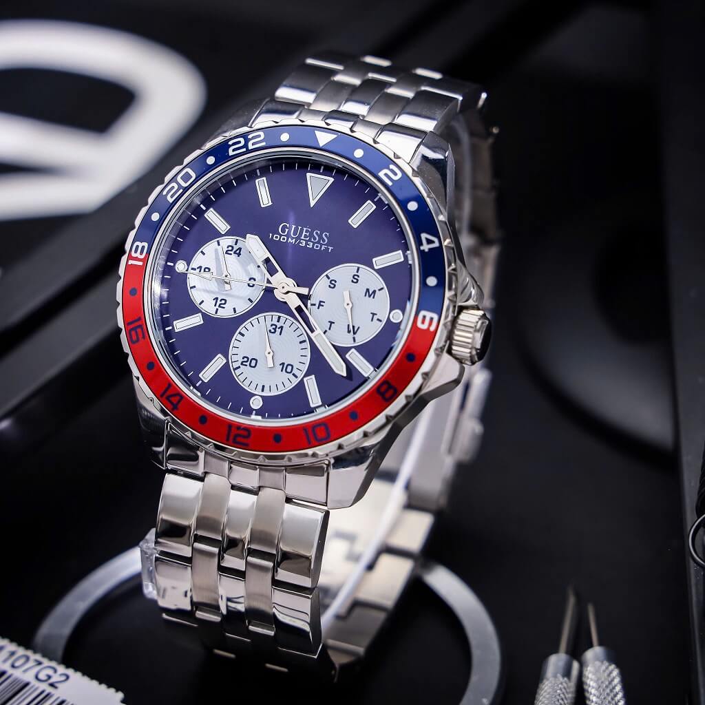 - Đồng hồ Guess nam chính hãng với thiết kế mặt dial xanh dương với viền benzel pepsi xanh đỏ mang phong cách rất thể thao