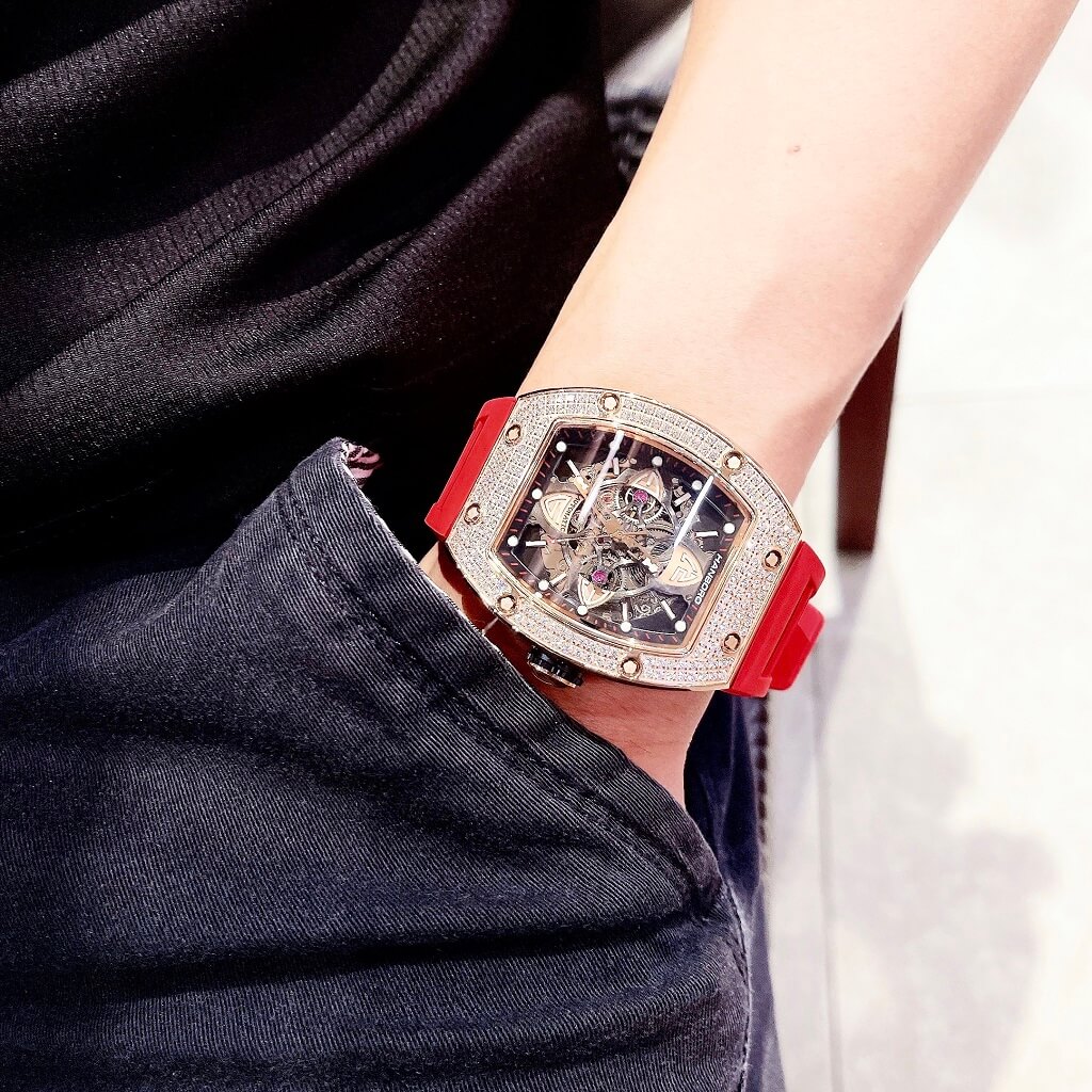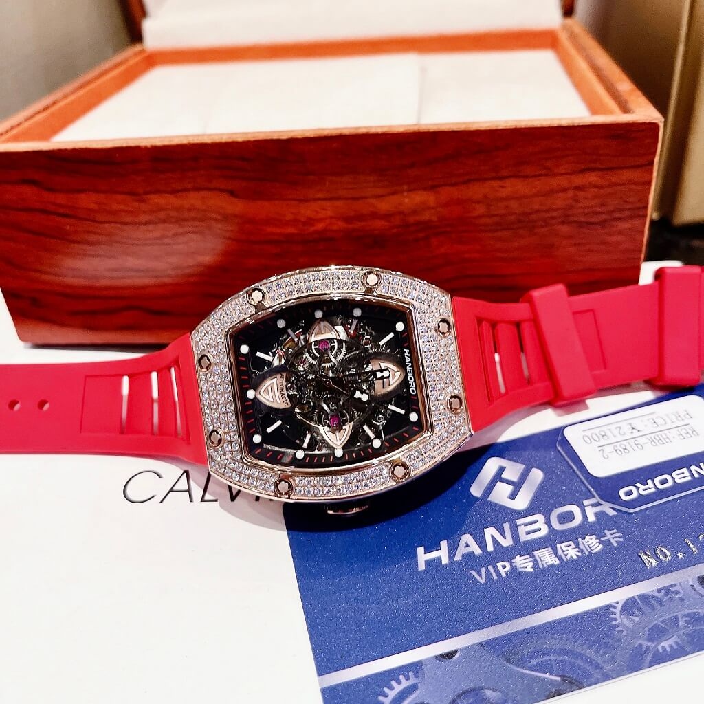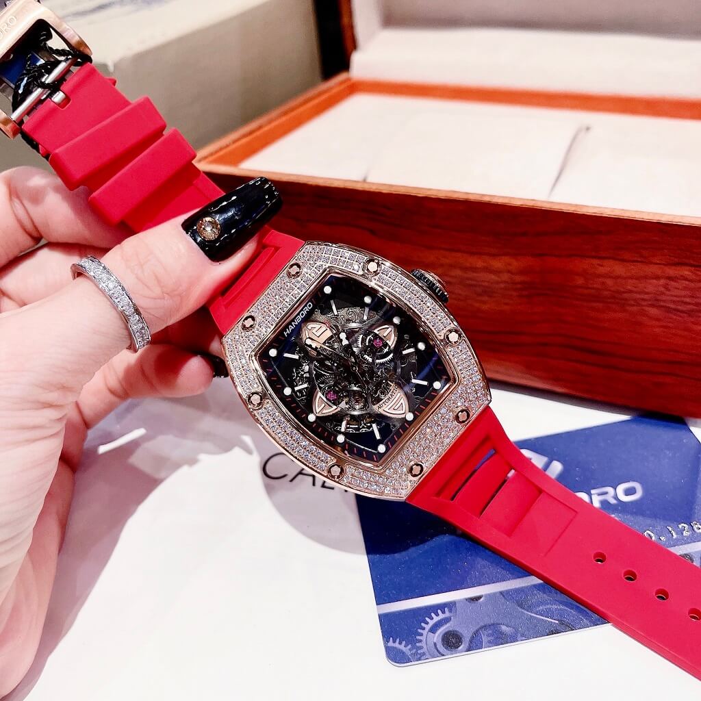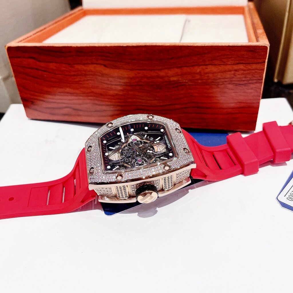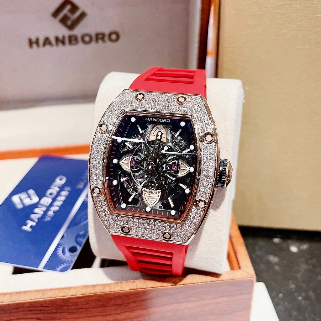 Hình Ảnh Đồng Hồ Nam Hanboro Automatic (Tự Động) Dây Silicone Đỏ Đính Đá Rose Gold 40x48mm