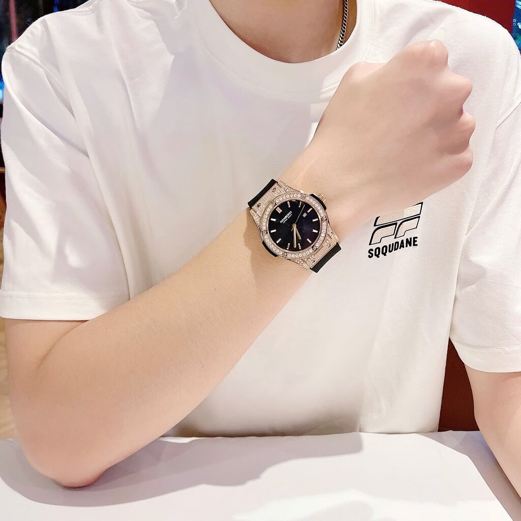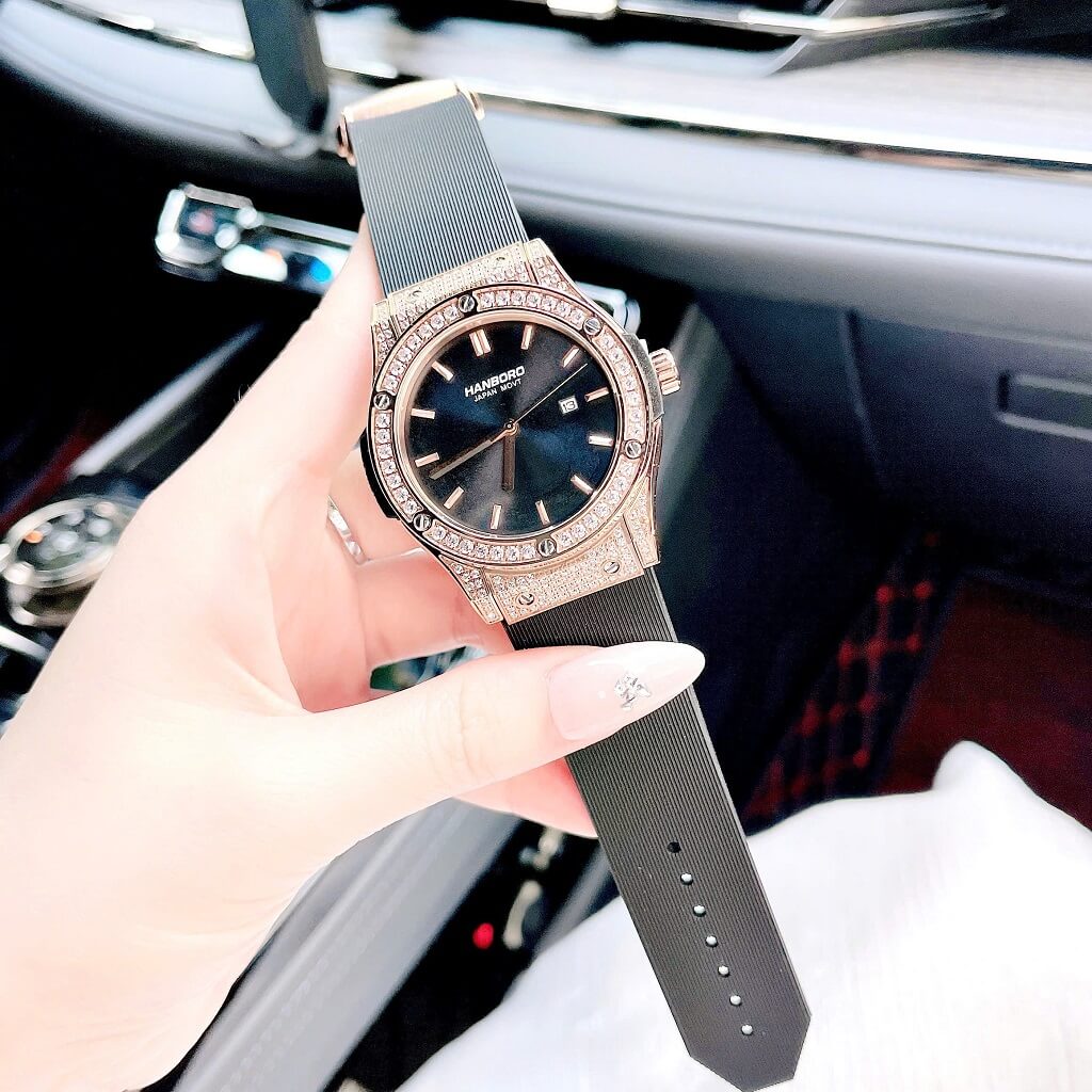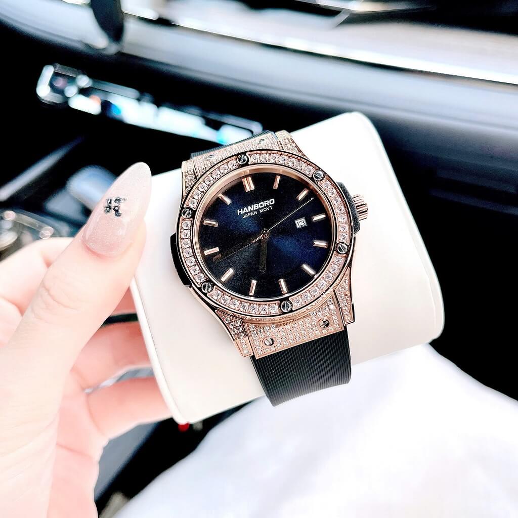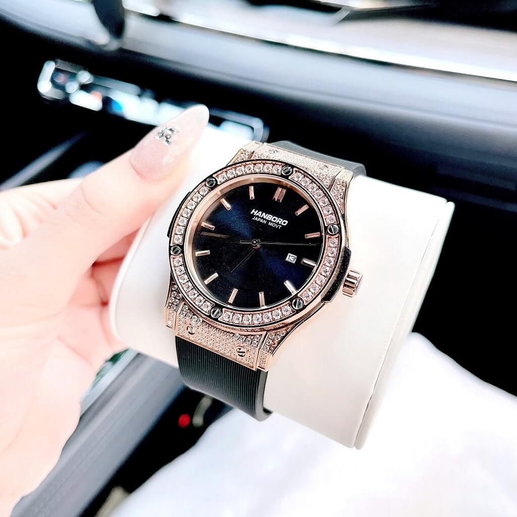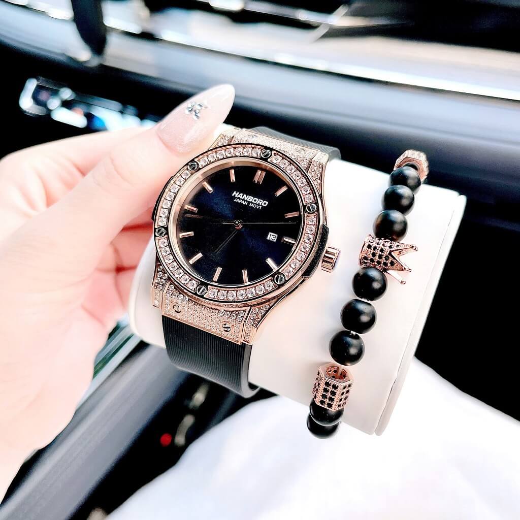 Đồng Hồ Nam Hanboro Dây Cao Su Đen Vỏ Vàng Hồng Đính Đá Size 42mm – Sang Trọng, Thời Thượng Và Đầy Nam Tính