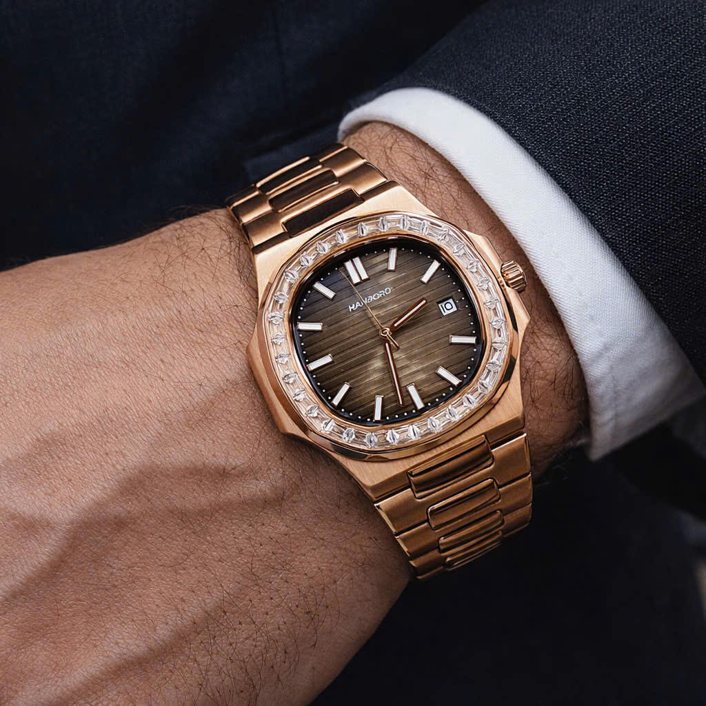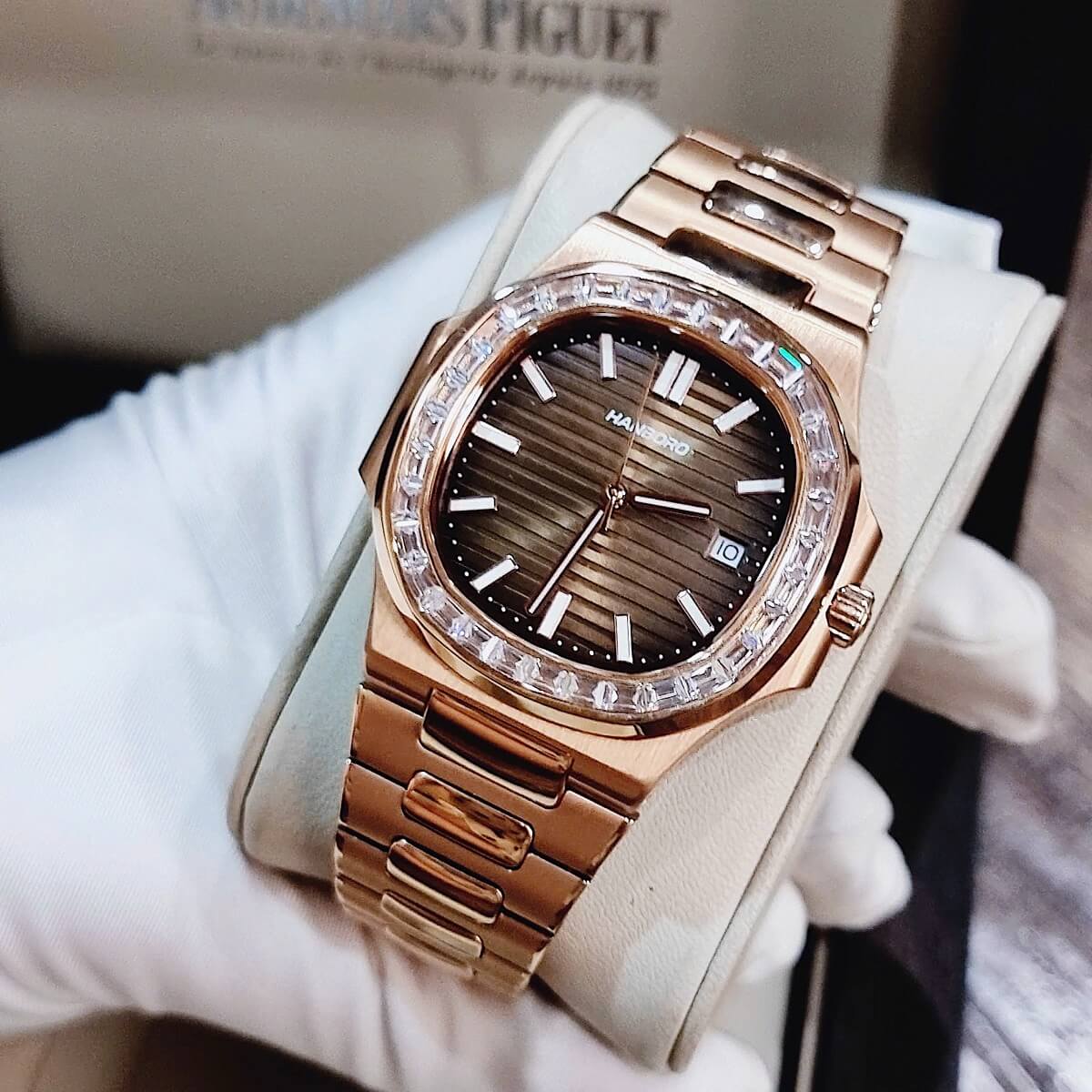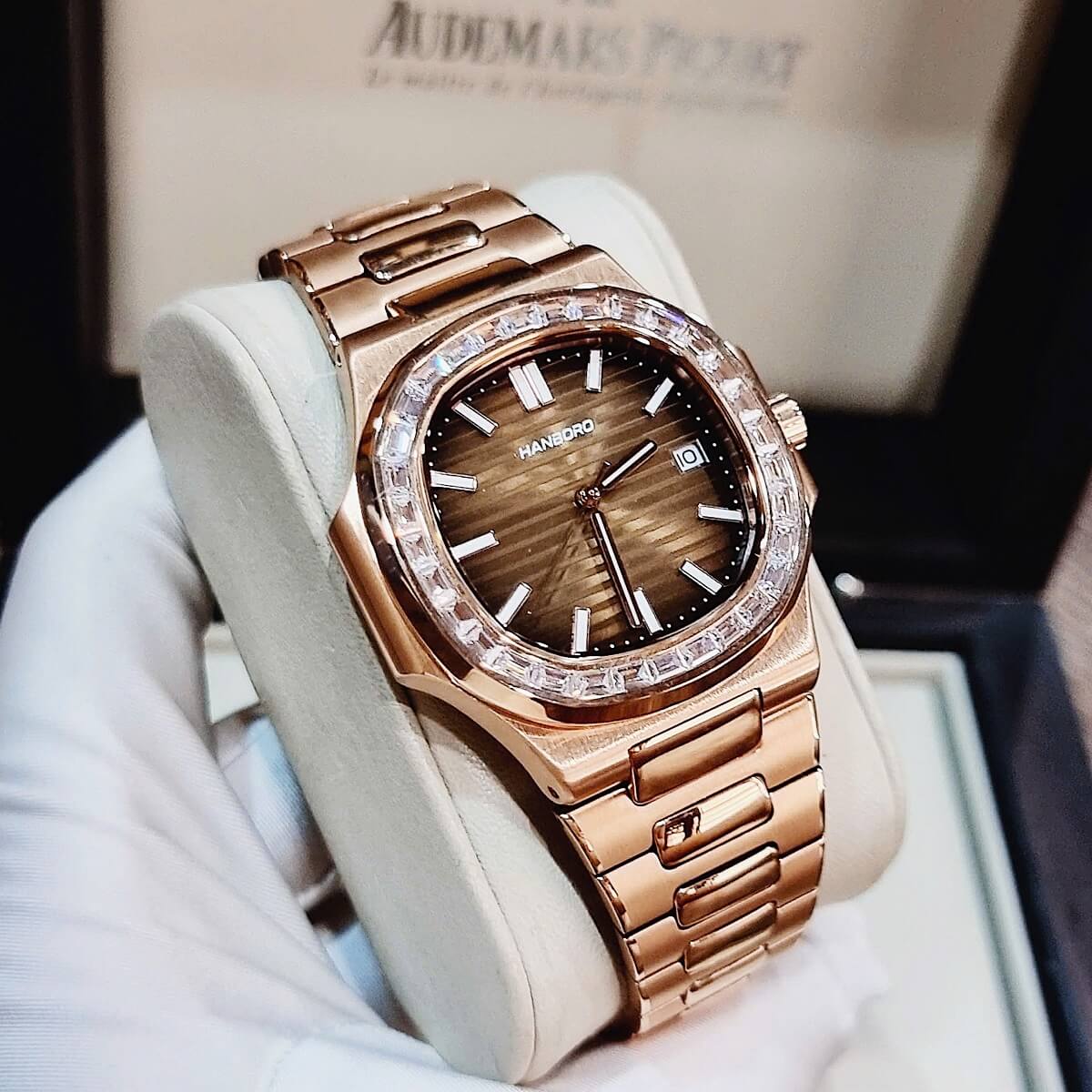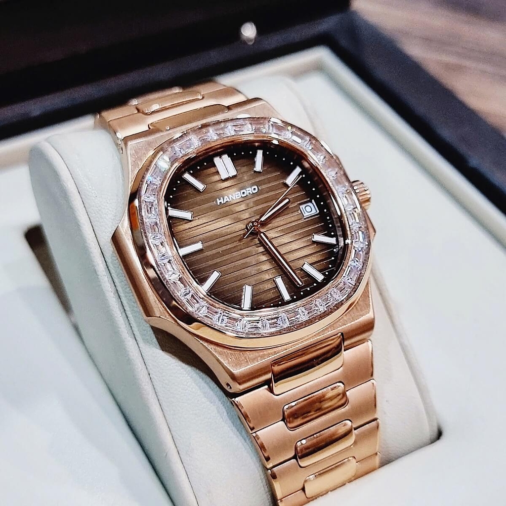Đồng Hồ Nam Hanboro Máy Tự Động Mặt Nâu Viền Đá Kim Loại Vàng Hồng Size 42mm là một mẫu đồng hồ cơ tự động quá đẳng cấp cho phái mạnh.