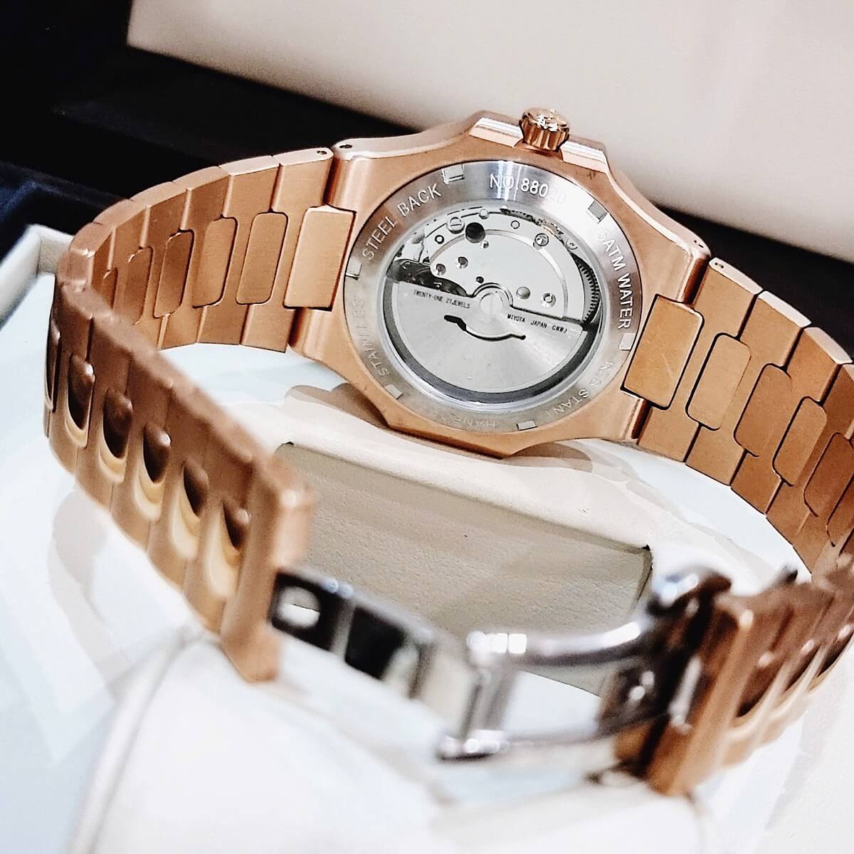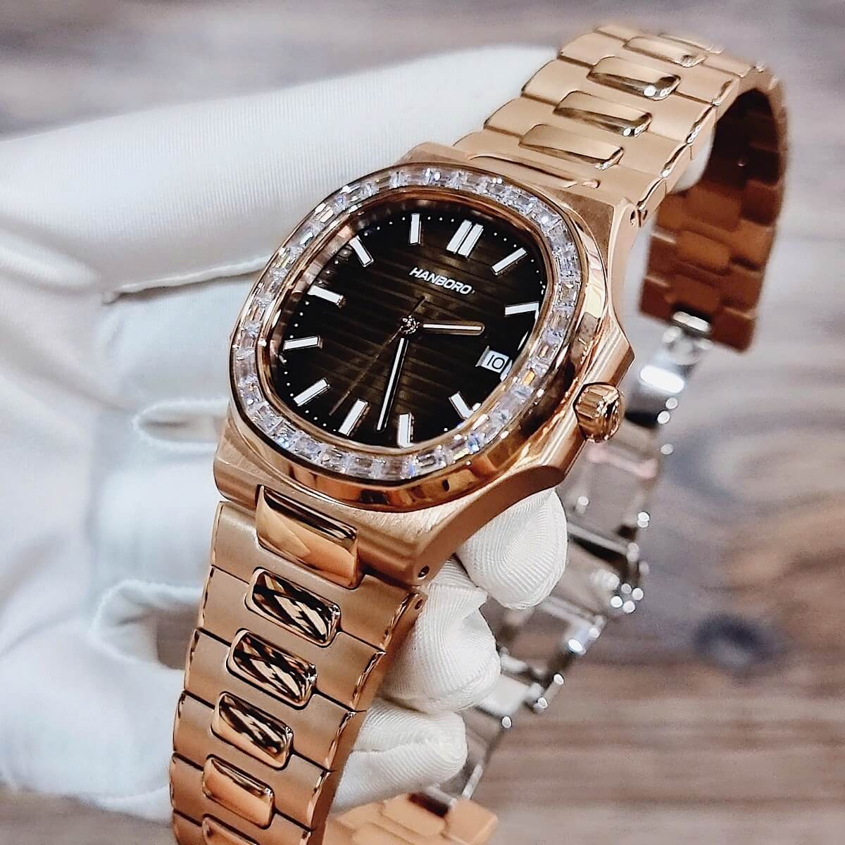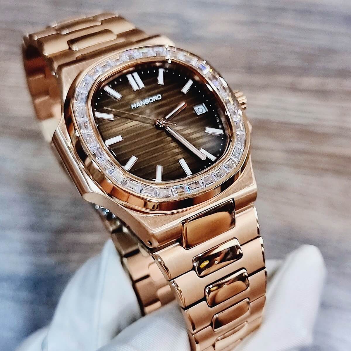 THÔNG TIN SẢN PHẨM: Đồng Hồ Nam Hanboro Máy Tự Động Mặt Nâu Viền Đá Kim Loại Vàng Hồng Size 42mm
