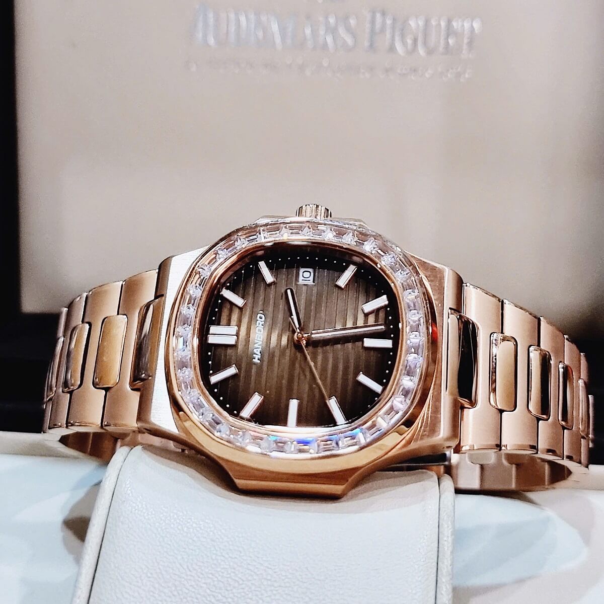Với thiết kế size mặt 42mm, form dáng kiểu patek nautilus đình đám, đeo lên cổ tay rất ôm tay và sang trọng, kết hợp viền đính đá ống lấp lánh, bắt ánh sáng rất tốt