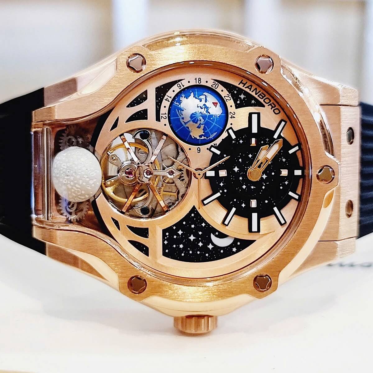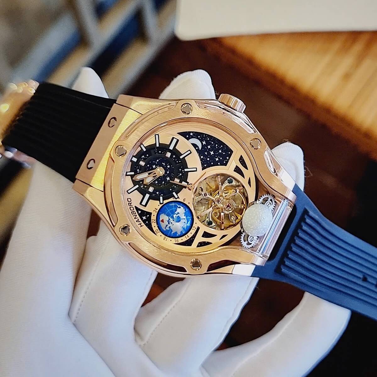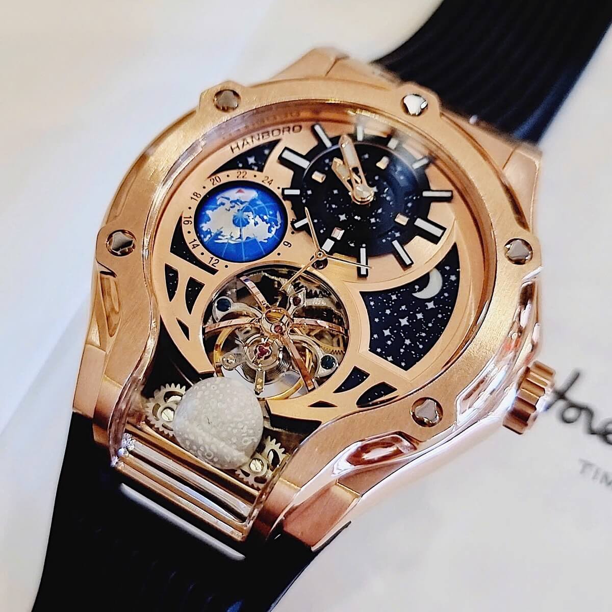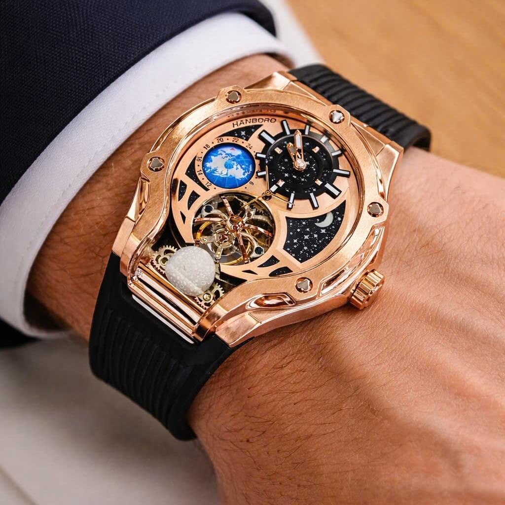 Đồng Hồ Nam Hanboro Máy Tự Động Mặt Trái Đất Trăng Sao Dây Cao Su Đen Kim Loại Vàng Hồng Size 42mm là một mẫu đồng hồ tự động độc đáo đẳng cấp cho phái mạnh.