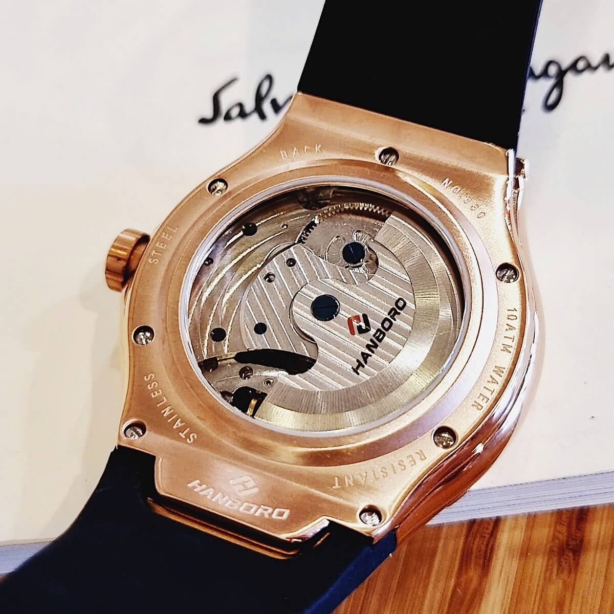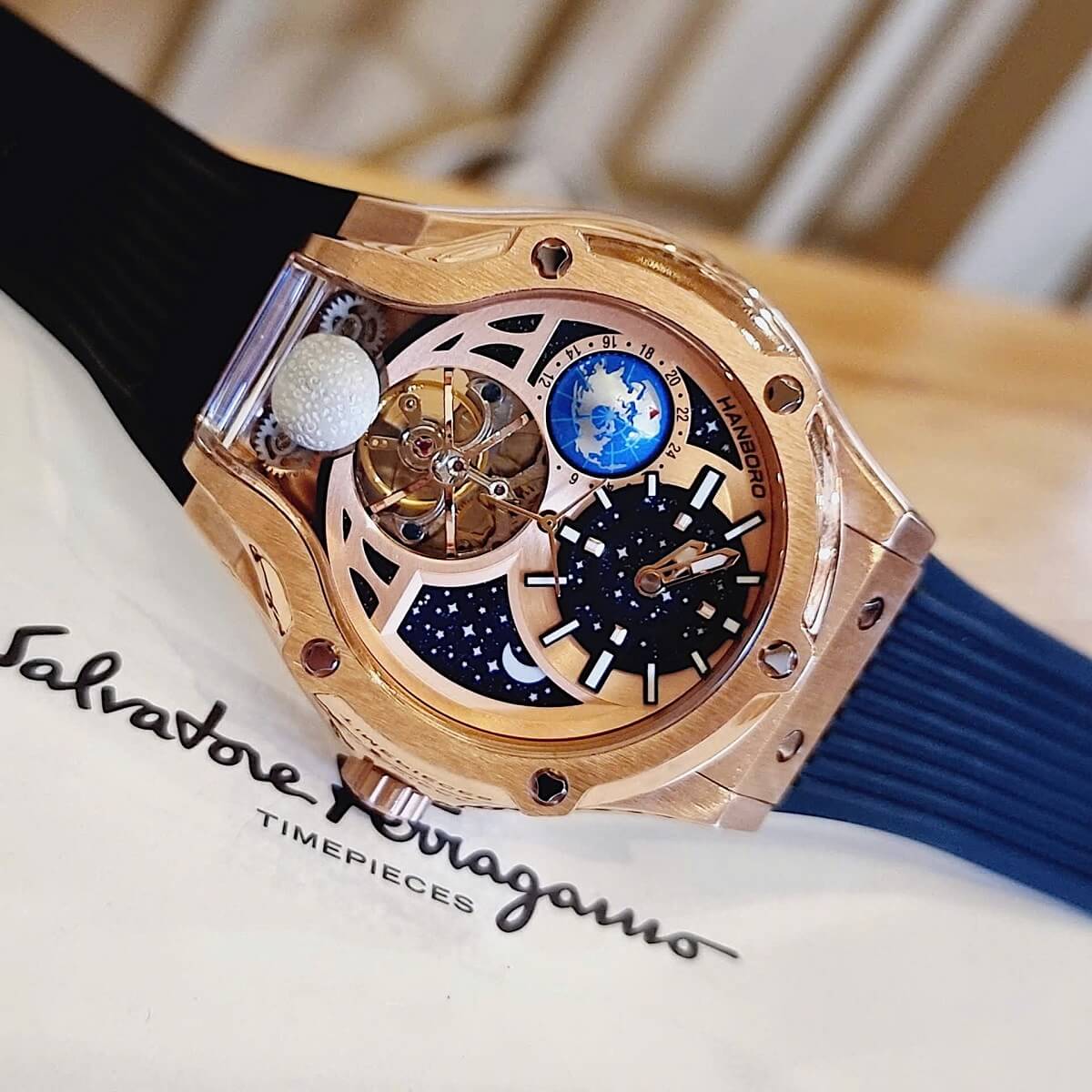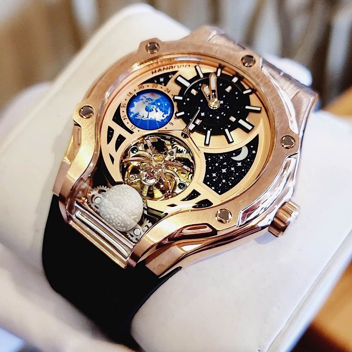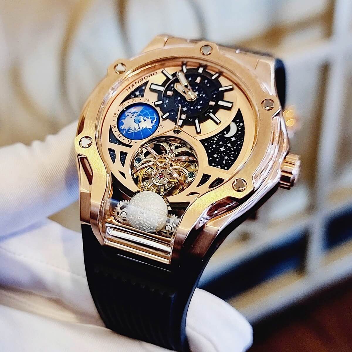 Đồng Hồ Nam Hanboro Máy Tự Động Mặt Trái Đất Trăng Sao Dây Cao Su Đen Kim Loại Vàng Hồng Size 42mm là một mẫu đồng hồ tự động độc đáo đẳng cấp cho phái mạnh.