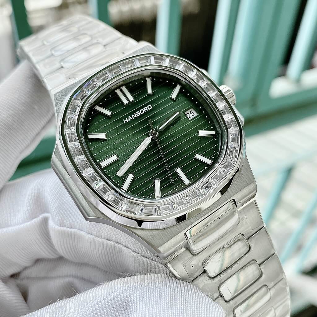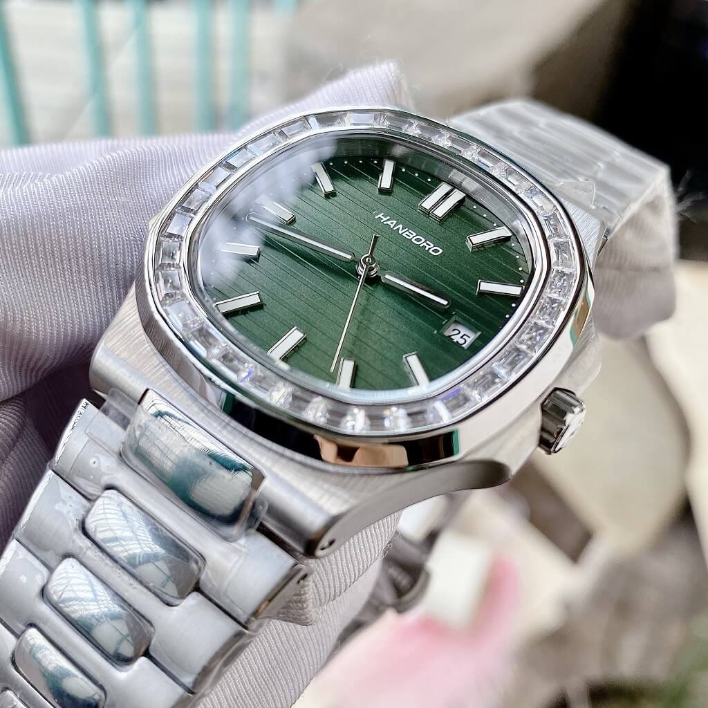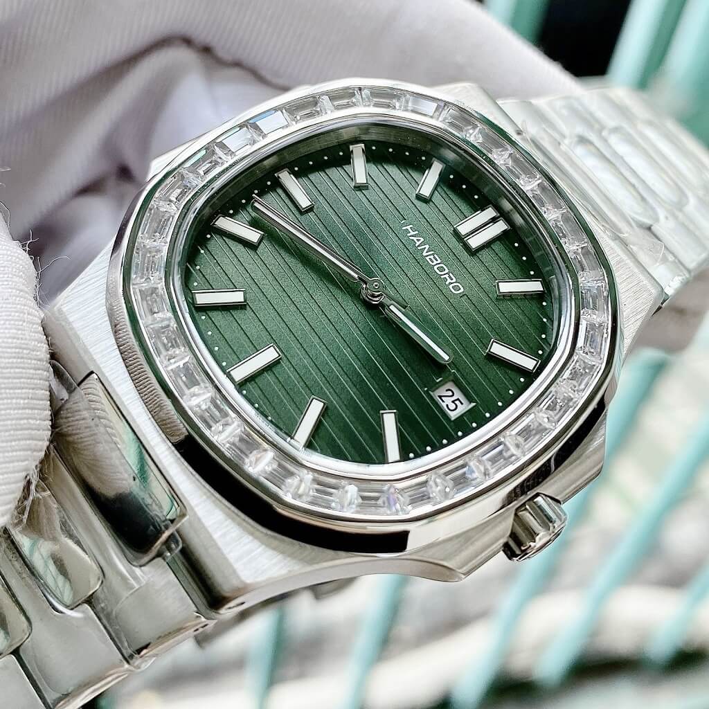 - Đồng Hồ Nam Hanboro Nautilus Tự Động Viền Đá Green Silver 40mm chính hãng dành cho nam, máy cơ tự động Japan bền bỉ với lịch ngày tiện lợi