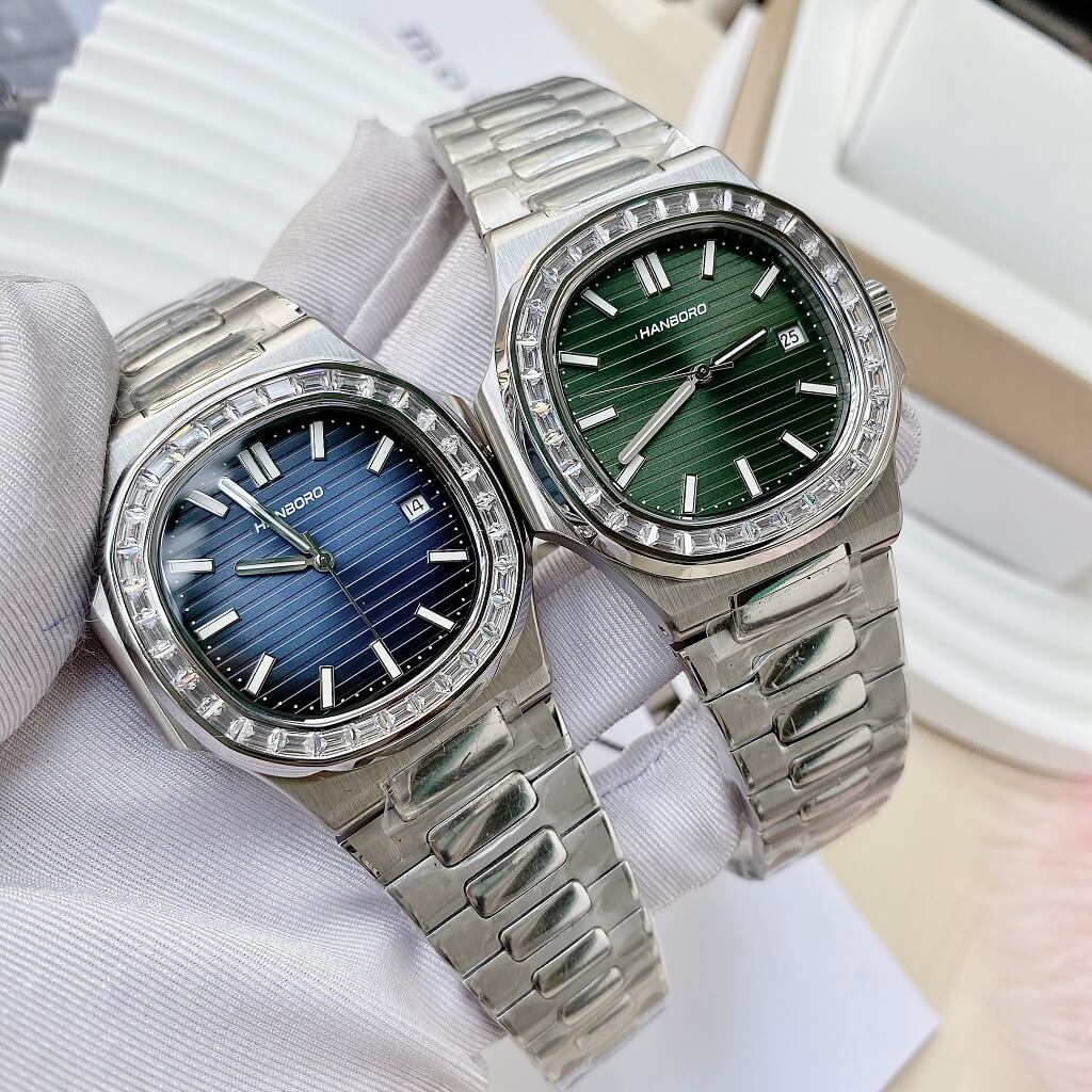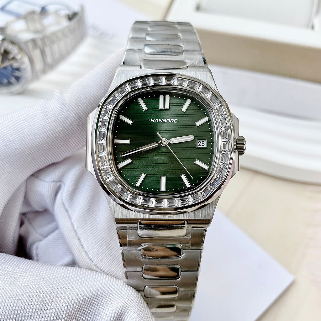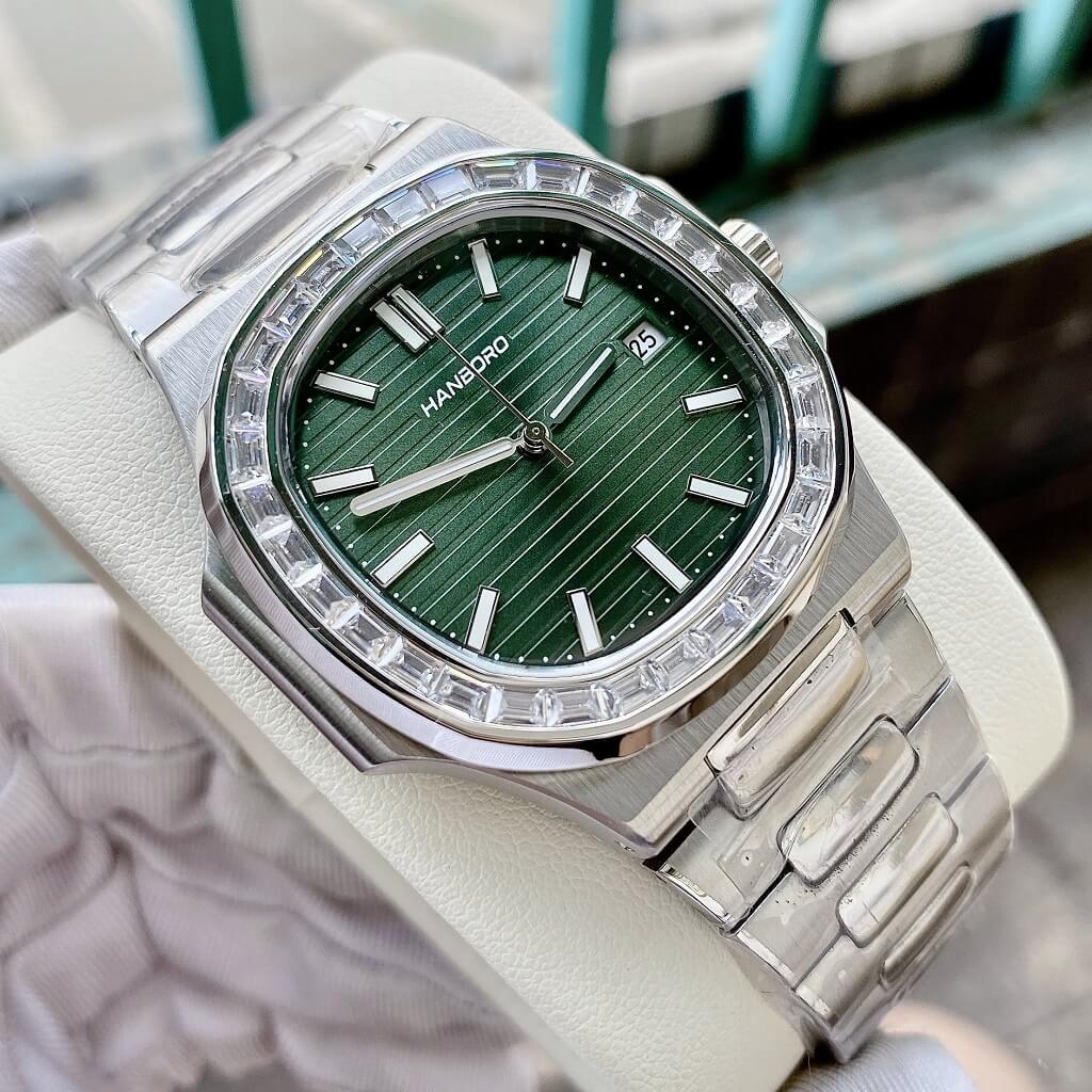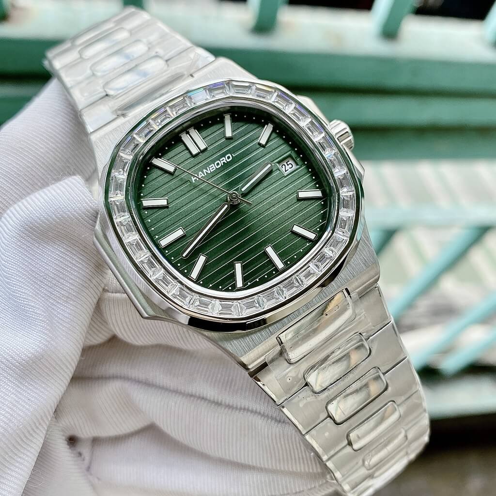- Đồng Hồ Nam Hanboro Nautilus Tự Động Viền Đá Green Silver 40mm chính hãng dành cho nam, máy cơ tự động Japan bền bỉ với lịch ngày tiện lợi