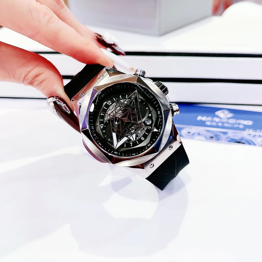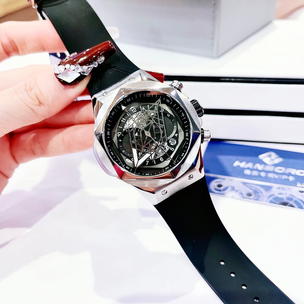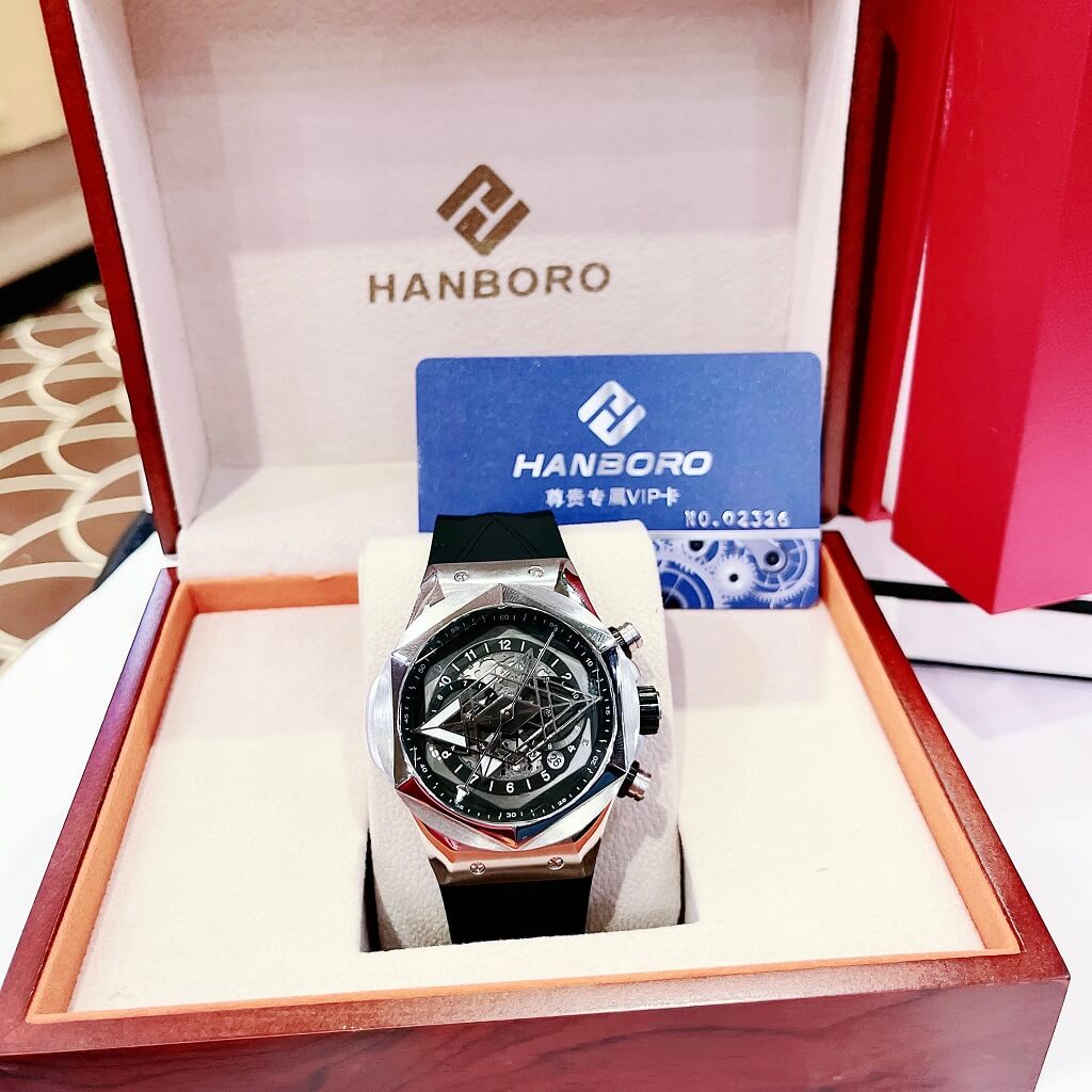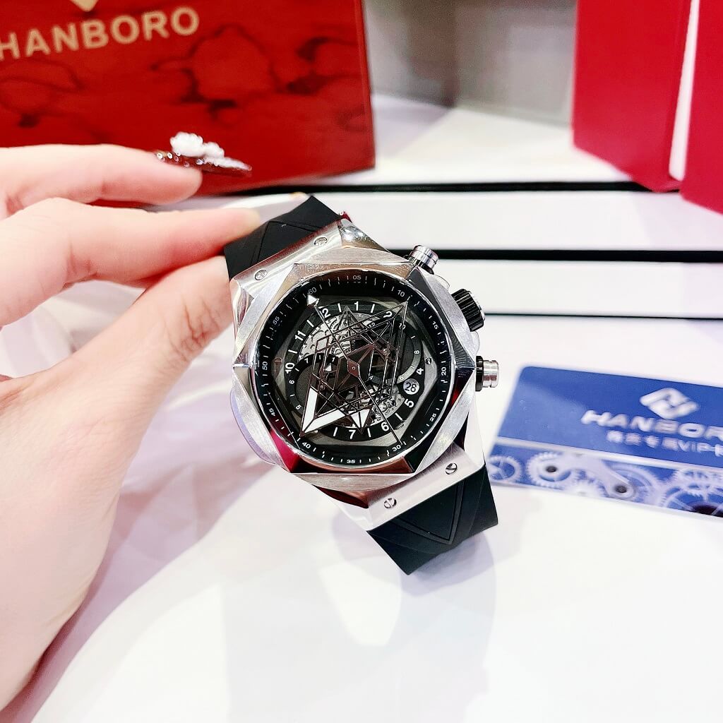 Hình Ảnh Đồng Hồ Nam Hanboro Tự Động Dây Cao Su Đen Silver 42mm
