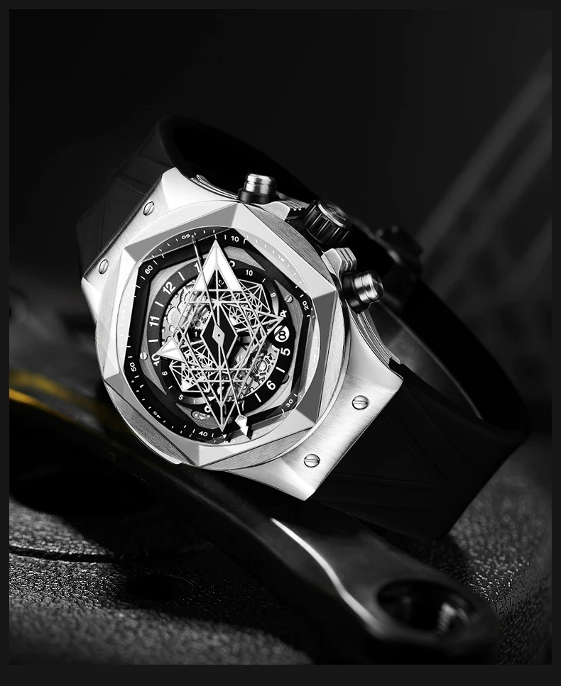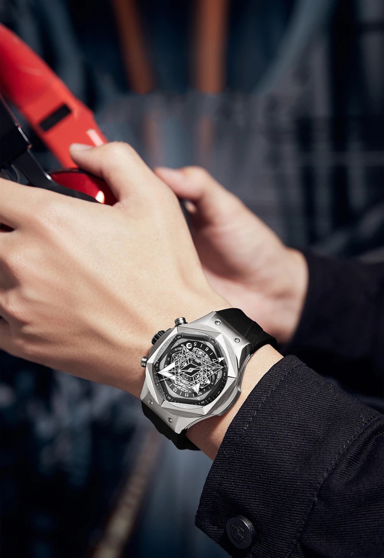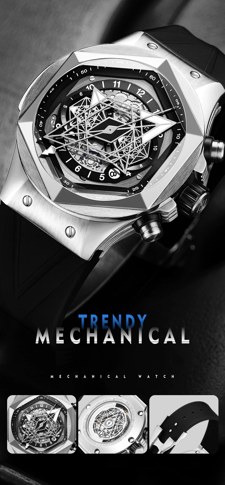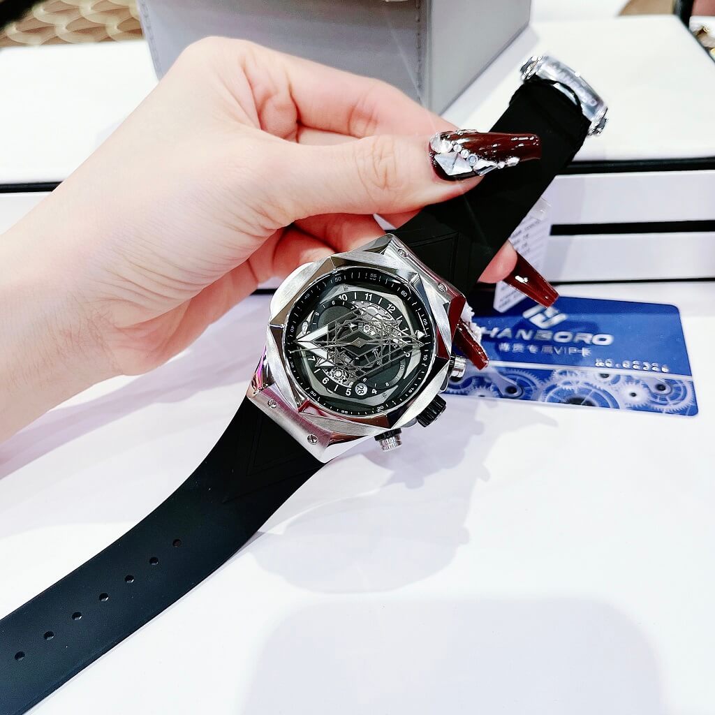 Hình Ảnh Đồng Hồ Nam Hanboro Tự Động Dây Cao Su Đen Silver 42mm