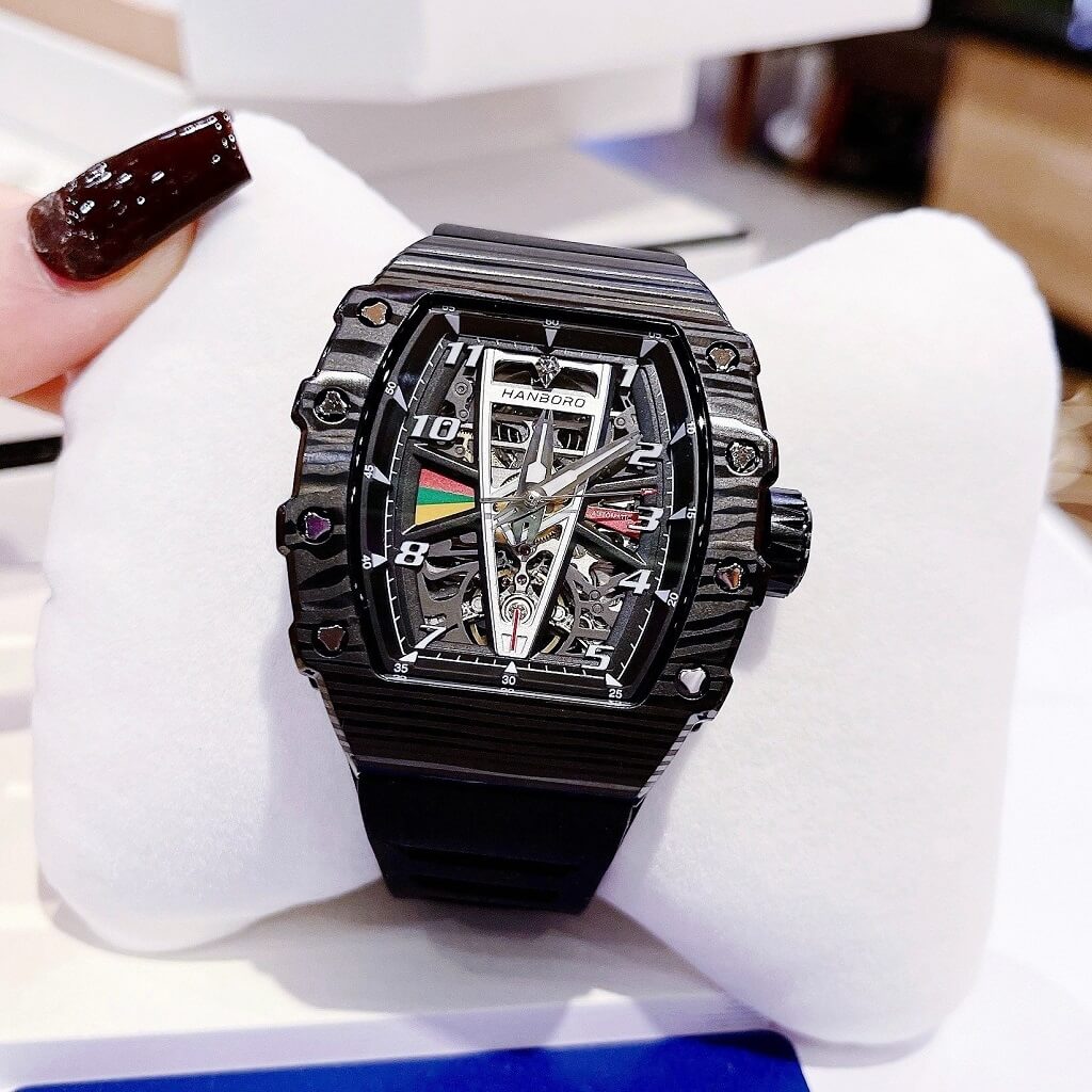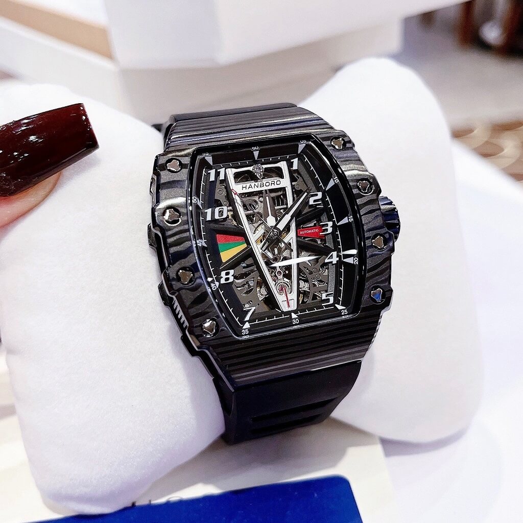 Thông số Đồng Hồ Nam Hanboro Tự Động Dây Silicone Đen Vỏ Đen 41x50mm HBR 983 Chính Hãng