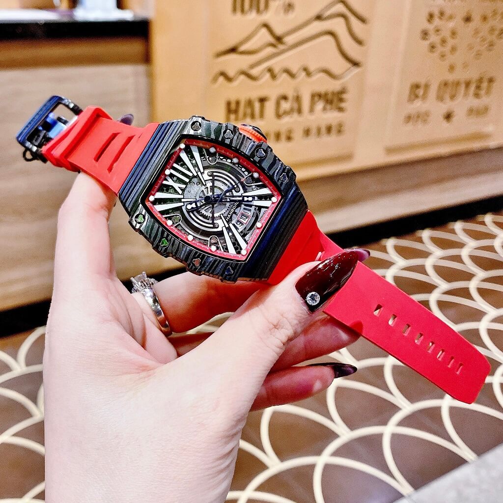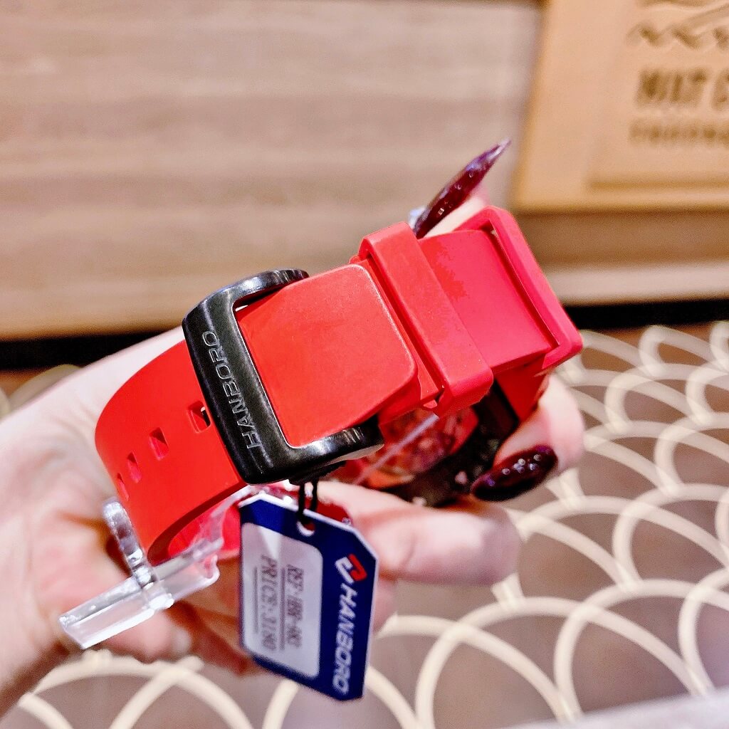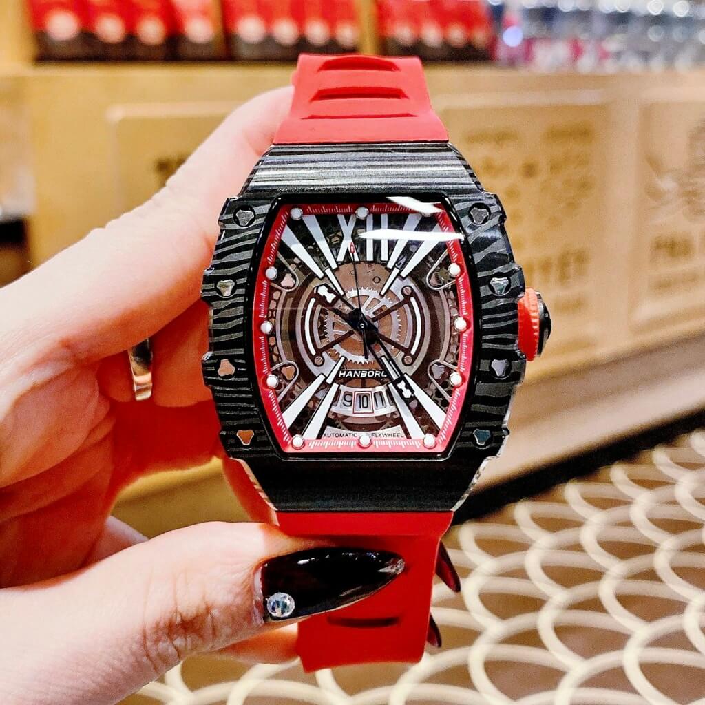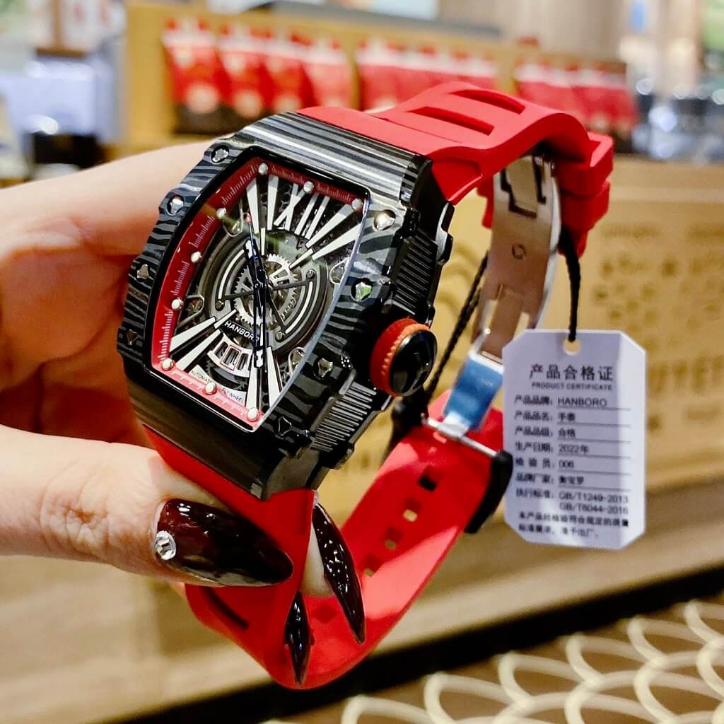 Hình Ảnh Đồng Hồ Nam Hanboro Tự Động Dây Silicone Đỏ Vỏ Đen 41x50mm HBR 993