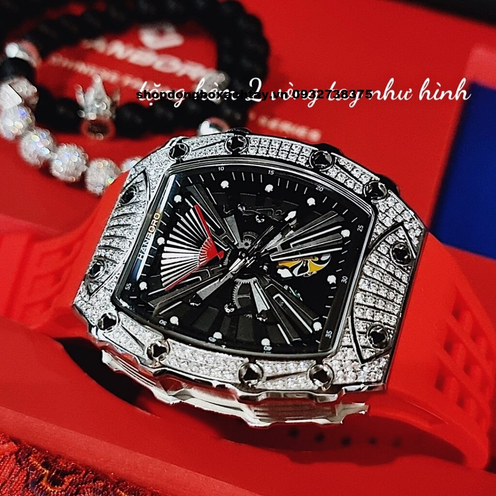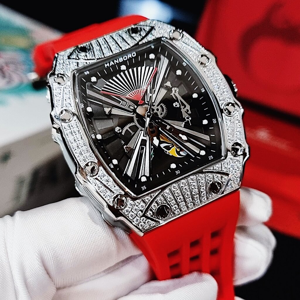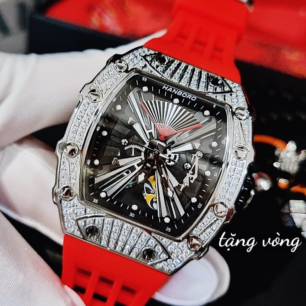 Hình Ảnh Đồng Hồ Nam Hanboro Tự Động Dây Silicone Đỏ Vỏ Silver 41x50mm HBR 927