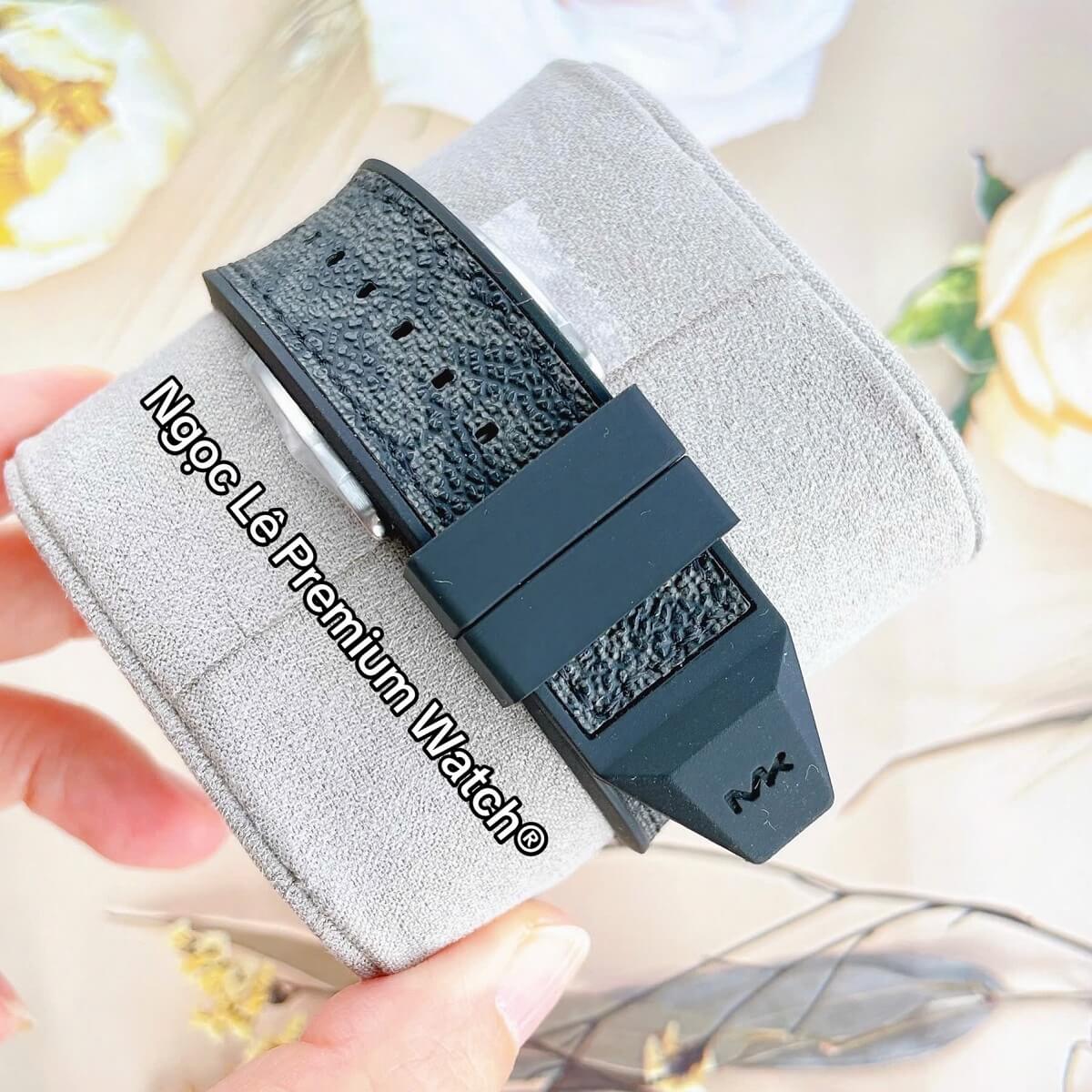 Thoát khỏi kiểu dây kim loại quen thuộc, MK8850 được trang bị dây cao su đen chất lượng cao – một lựa chọn lý tưởng cho những người yêu thích sự năng động, trẻ trung. Dây cao su không chỉ mang lại cảm giác thoải mái, nhẹ nhàng khi đeo trong thời gian dài mà còn rất dễ vệ sinh và phù hợp với các hoạt động thể thao hoặc trong môi trường ẩm ướt. Khóa gài được làm từ thép không gỉ chắc chắn, giúp đồng hồ ôm khít cổ tay mà không gây khó chịu.